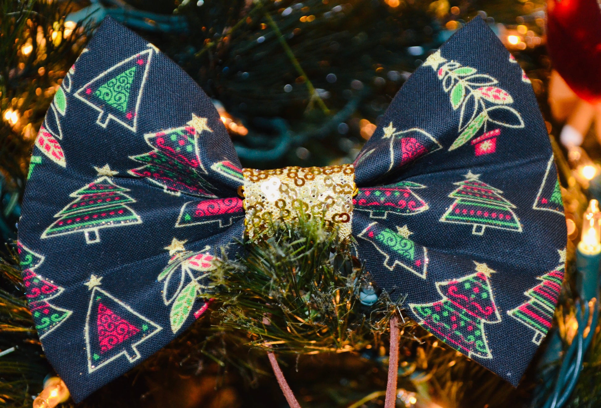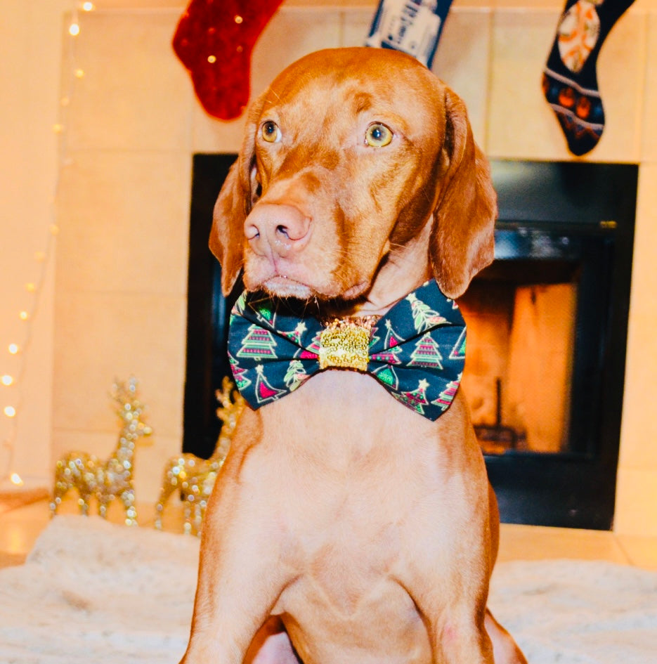 Black Christmas tree print with gold sequin center. Attaches to collar with 2 adjustable soft velcro straps to ensure the bow tie stays perfectly straight. Pairs perfectly with the gold and black sequin bandanas.