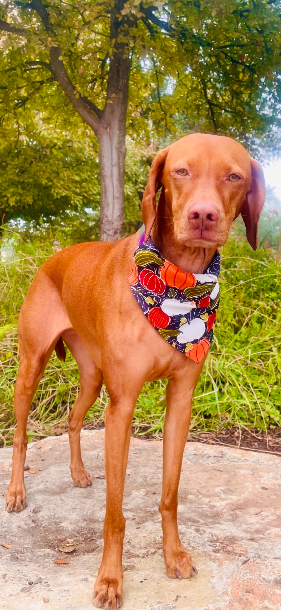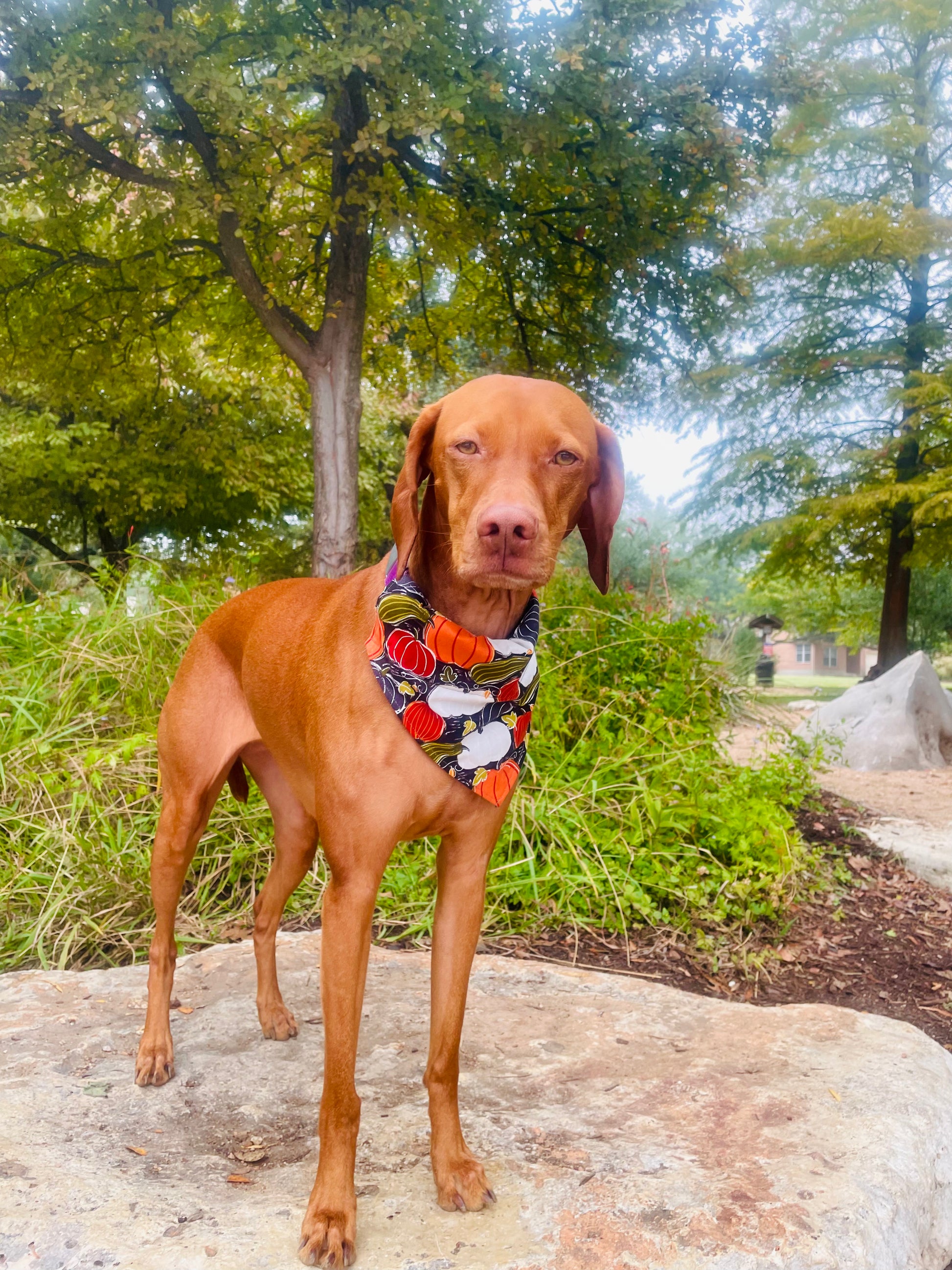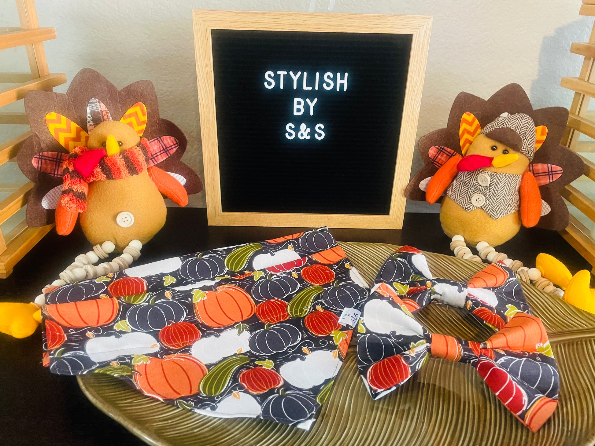 This black cotton bandana features a colorful assortment of gourds. Matching bow tie available. Bandana sold in slide over the collar and tie around styles.