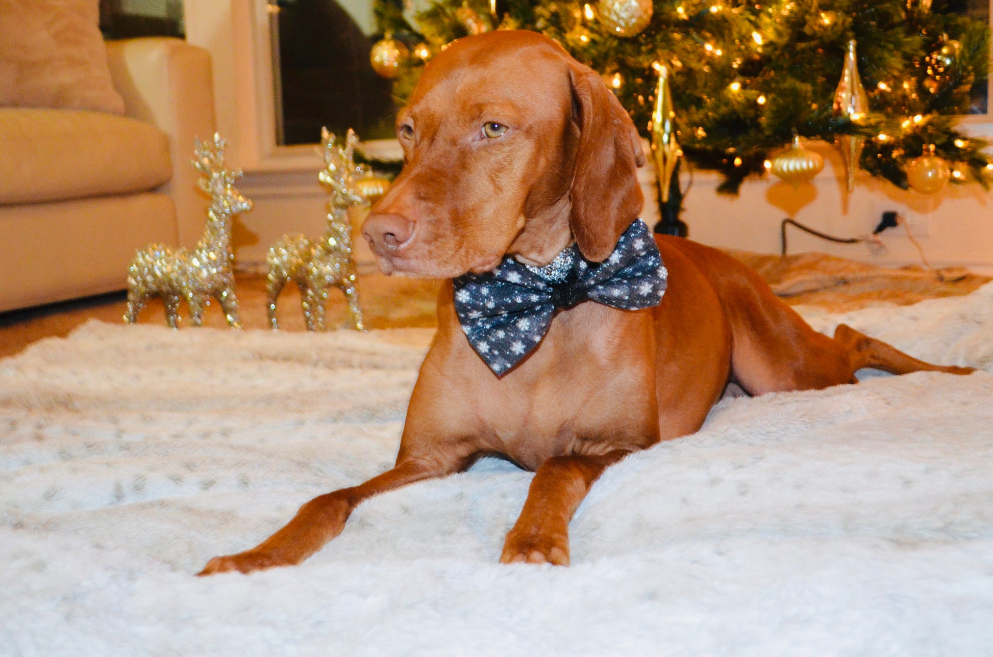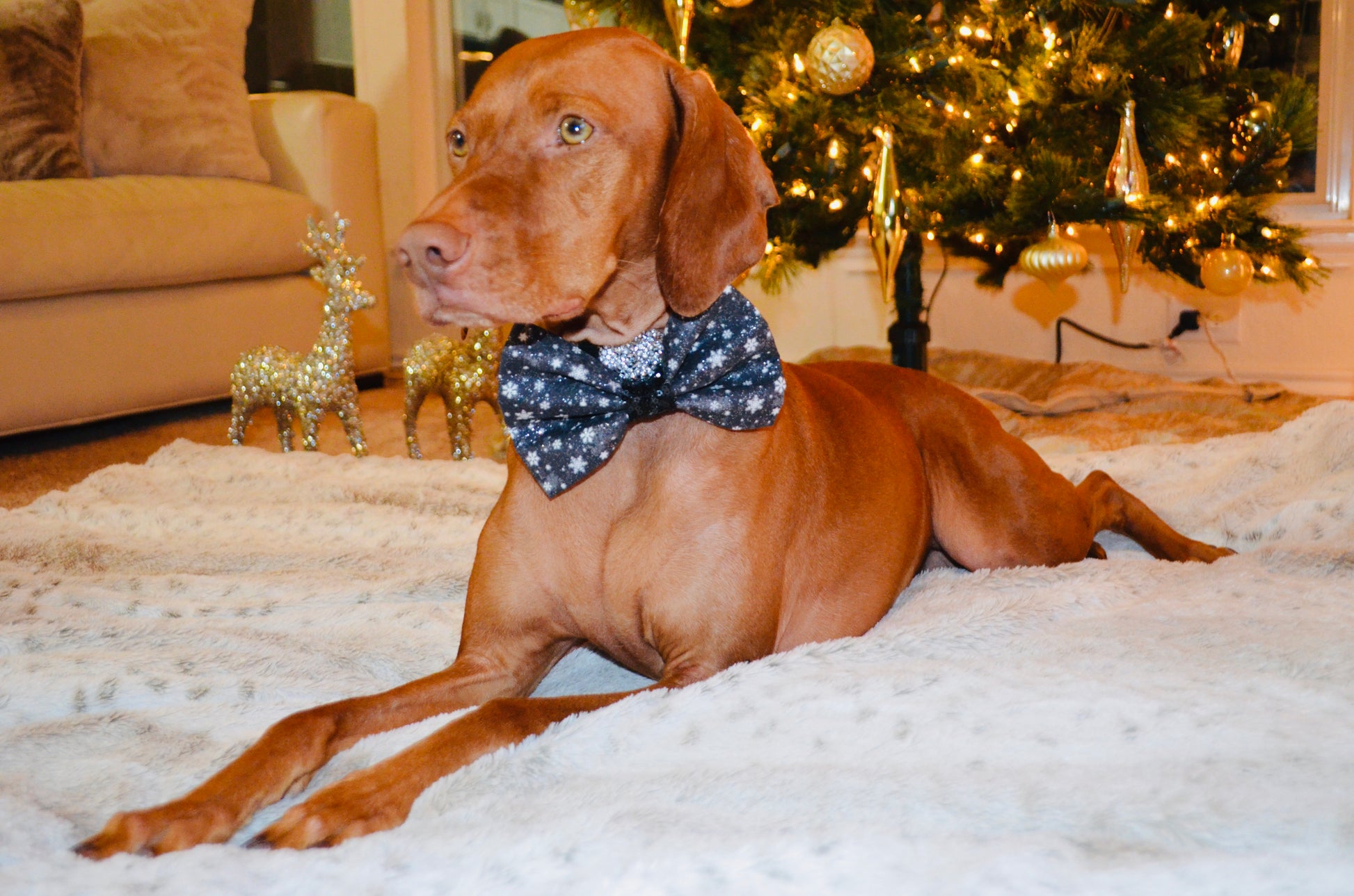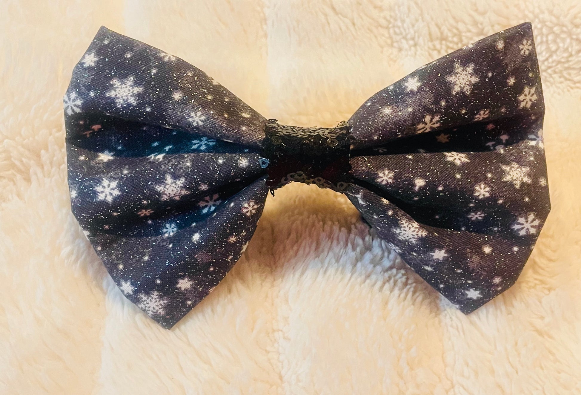 Black and silver snowflake print with black sequin center. Attaches to collar with 2 adjustable soft velcro straps to ensure the bow tie stays perfectly straight. Pairs perfectly with the black and silver sequin bandanas.