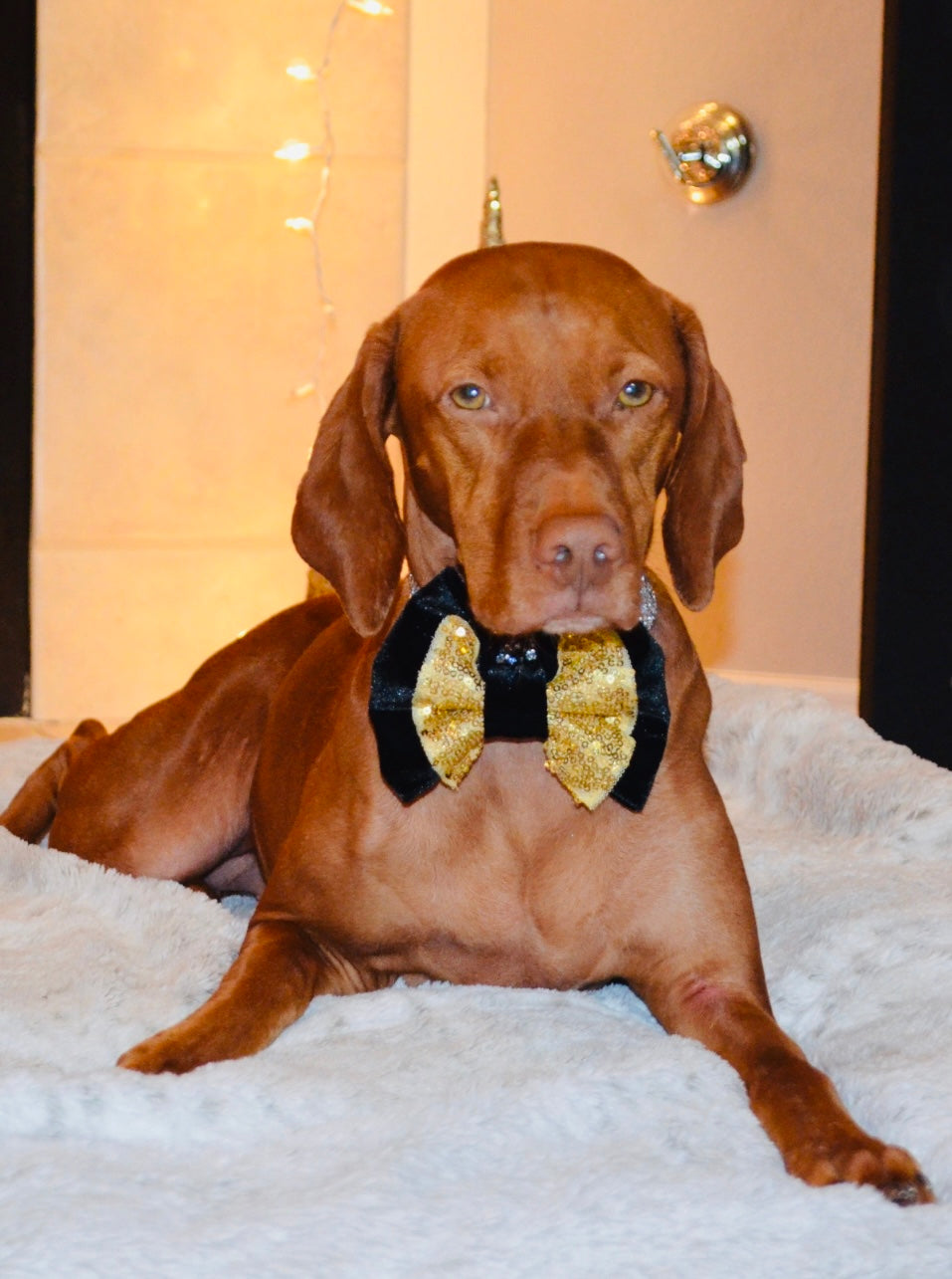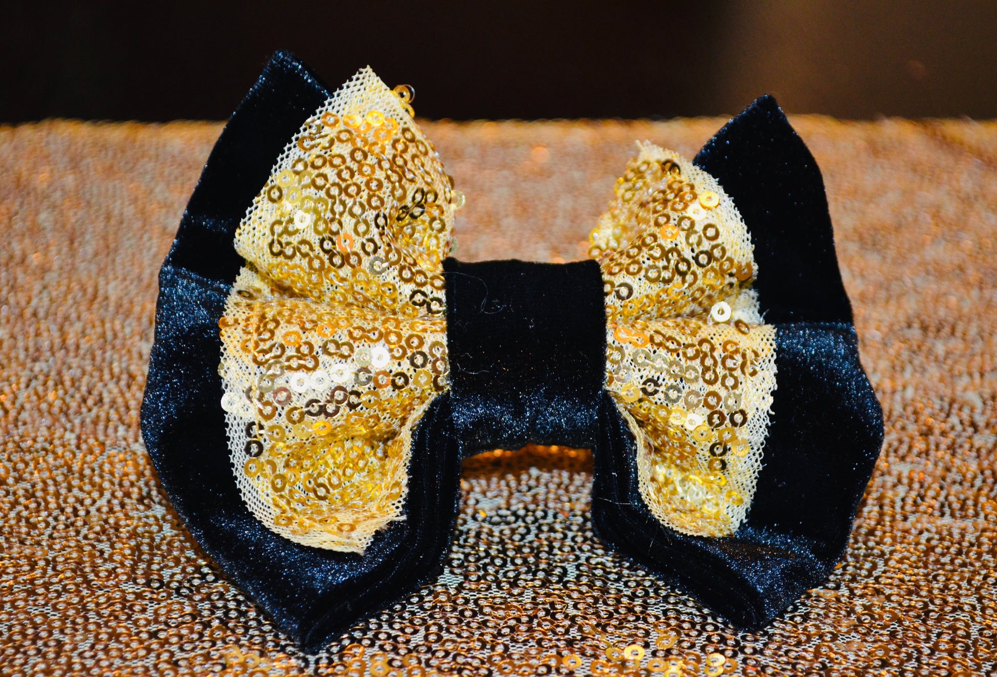 This stunning double bow tie has black velvet with a solid gold sequin center. Attaches to collar with 2 adjustable soft velcro straps to ensure the bow tie stays perfectly straight. Pairs perfectly with the black or gold sequin bandanas.