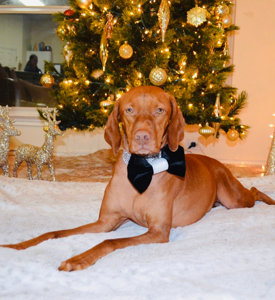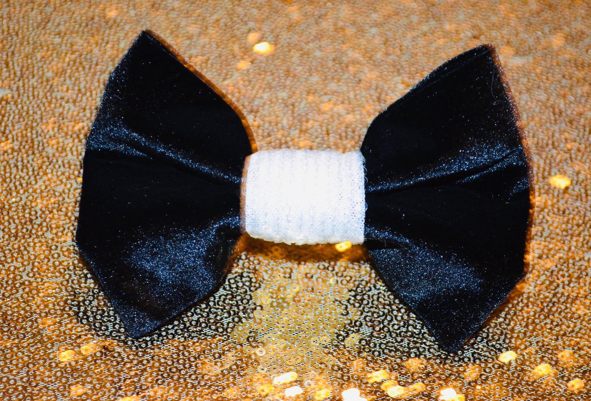 Glamorous black velvet bow tie with a white sequin center. Attaches to collar with 2 adjustable soft velcro straps to ensure the bow tie stays perfectly straight. Pairs perfectly with the black sequin bandana.