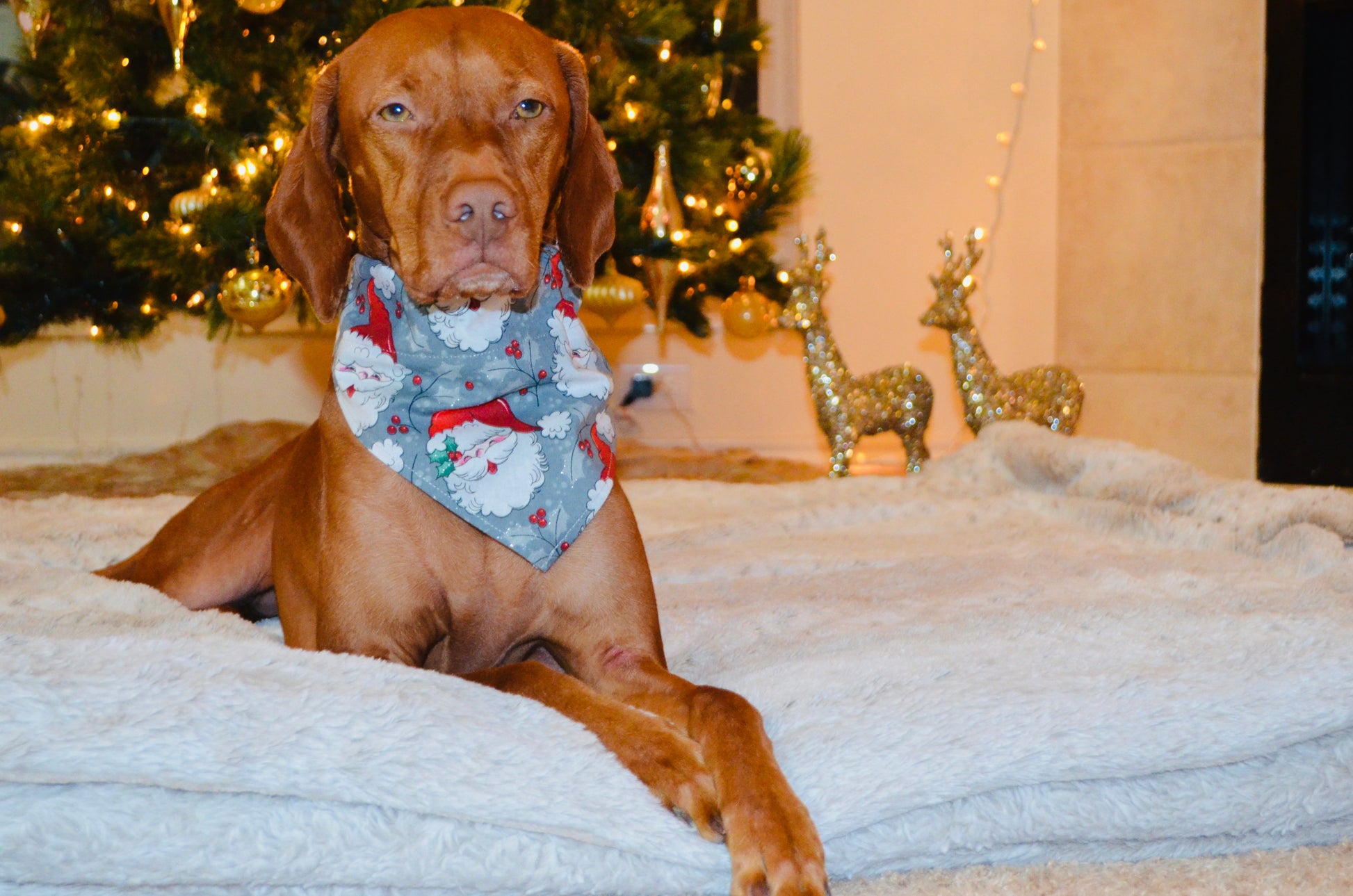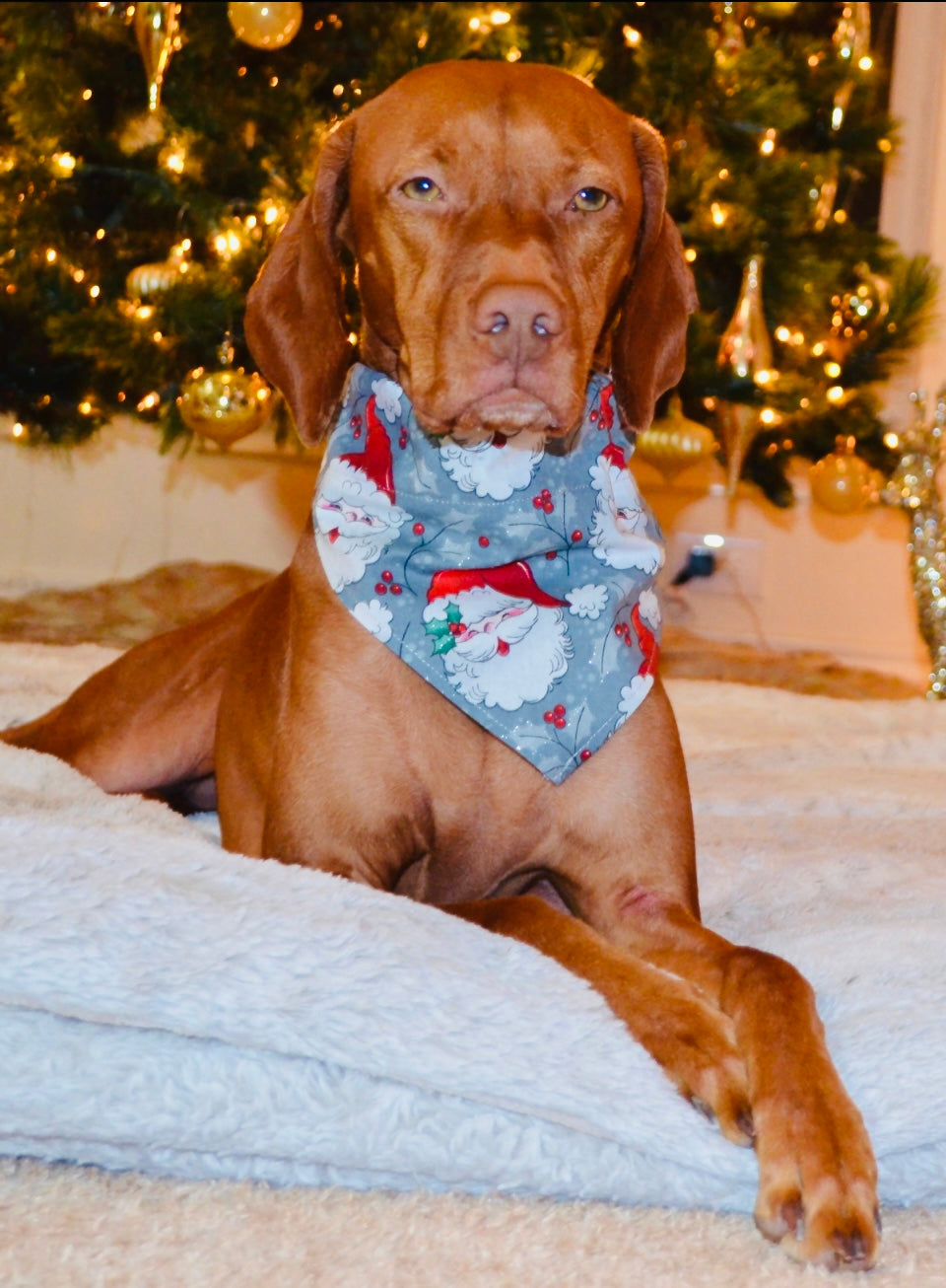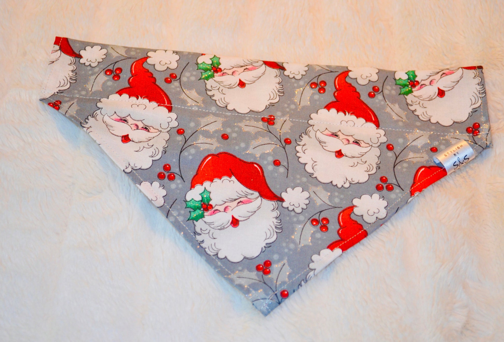 Classic Santa print on grey cotton fabric. Available in slide over the collar style in Extra Small, Small, Medium and Large.