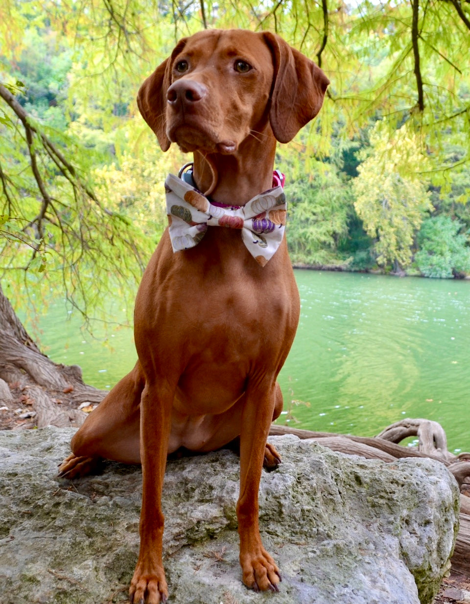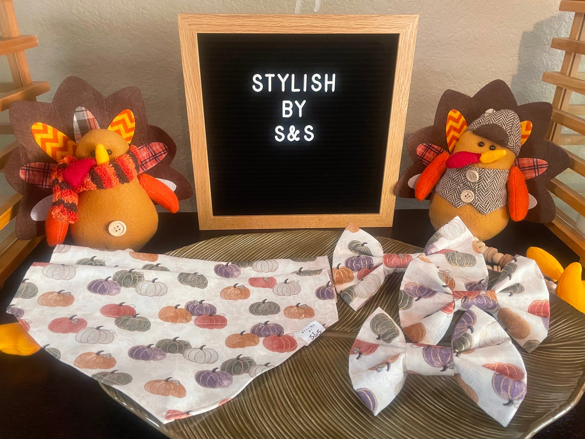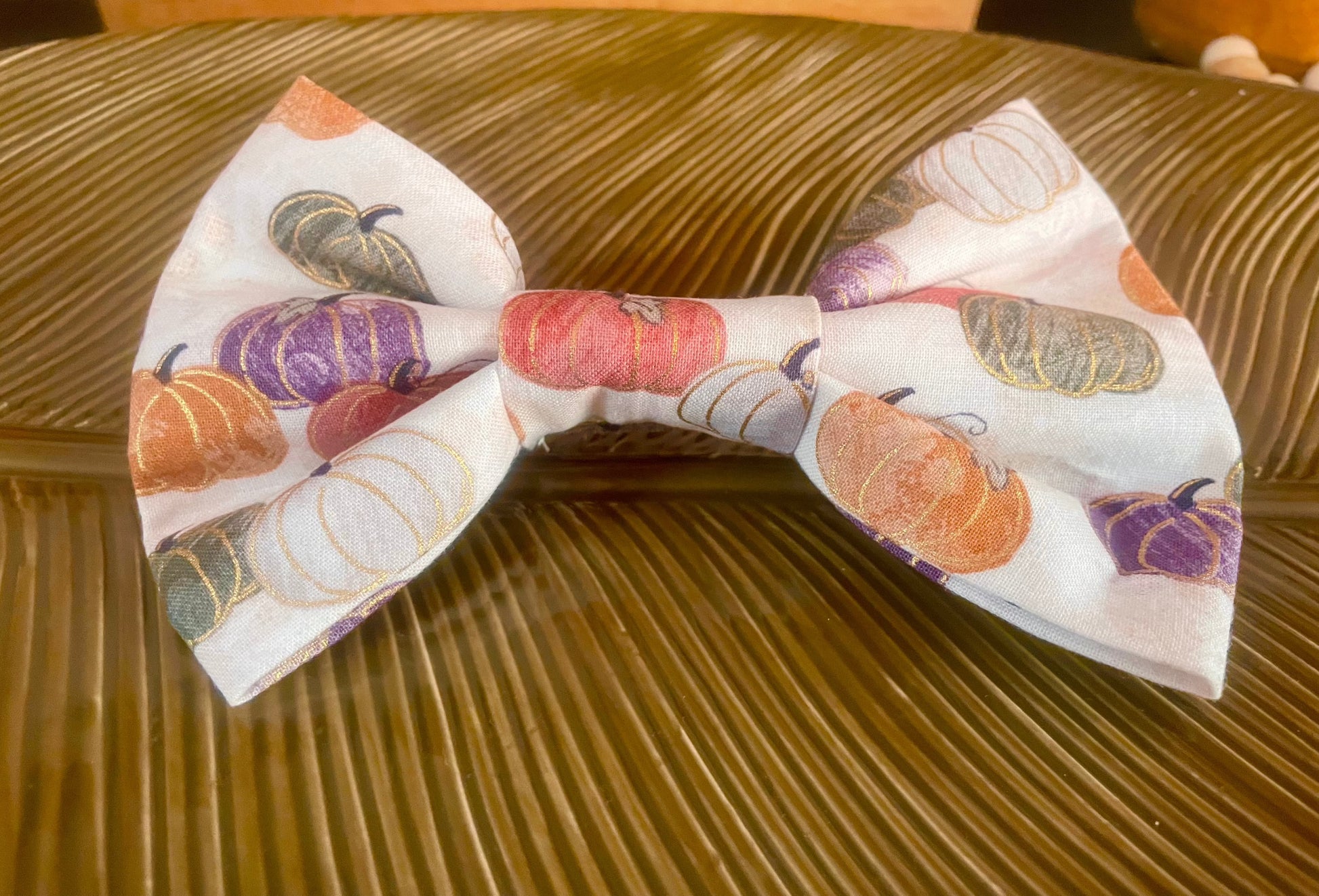 This adorable cotton print bow tie has purple, green, orange and white pumpkins outlined in gold metallic. Matching bandana available. Bow ties available in XS, S, M, L and XL.