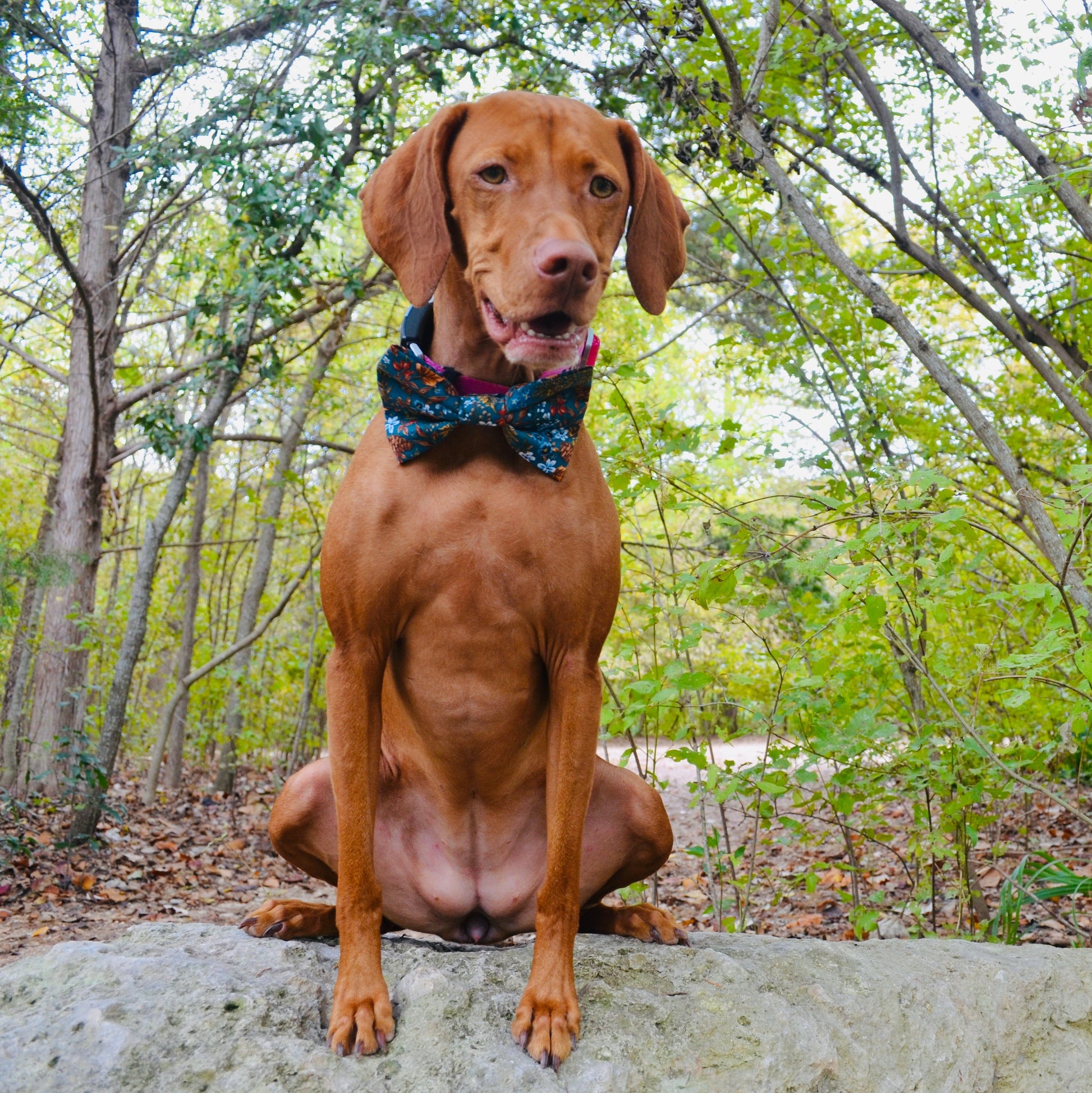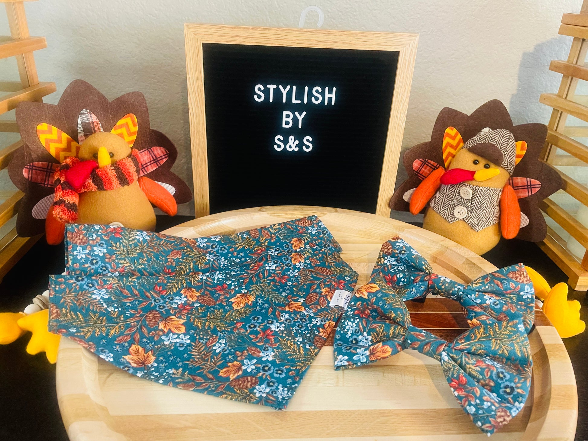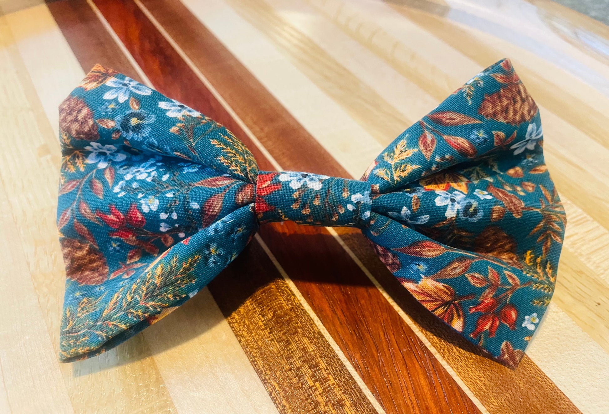 Dark teal floral fall print bow tie. Matching bandana available. Bow ties available in XS, S, M, L and XL.
