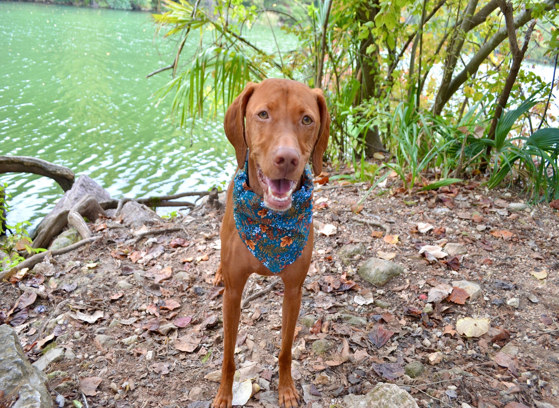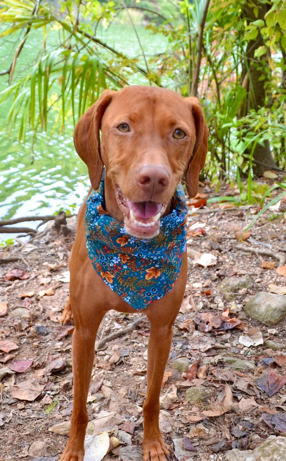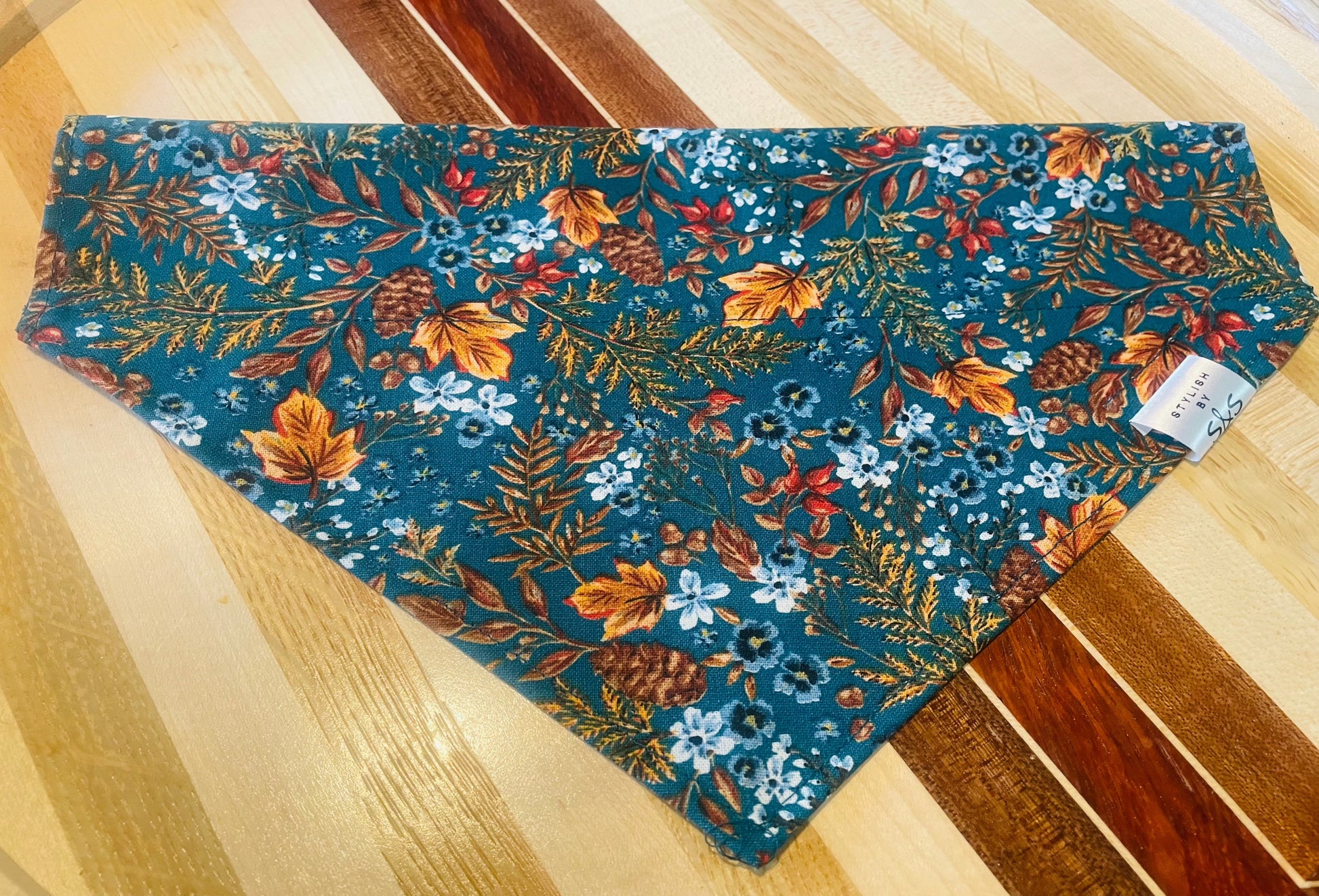 Dark teal cotton floral fall print bandana. Matching bow tie available. Bandana available in slide over the collar and tie around styles.