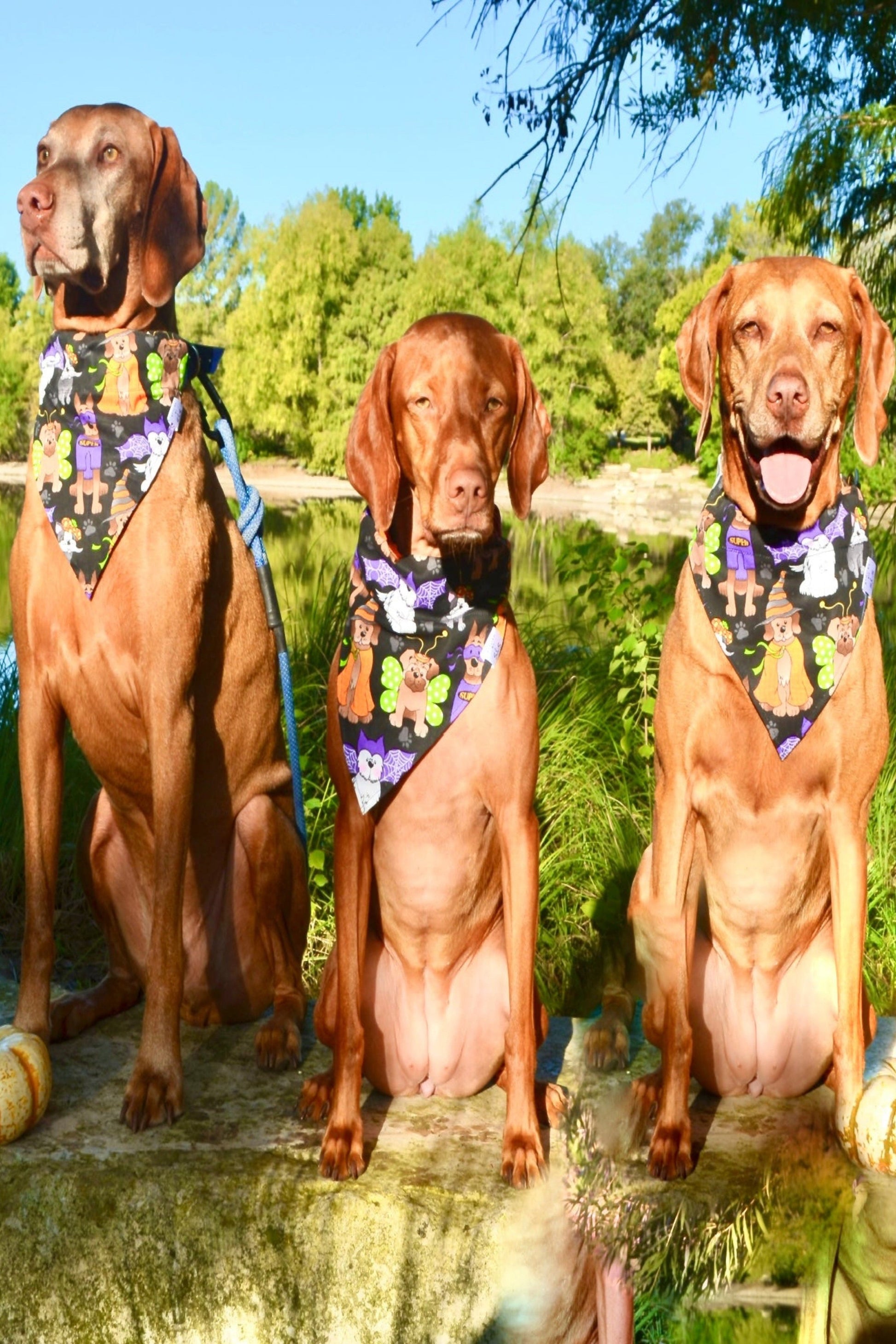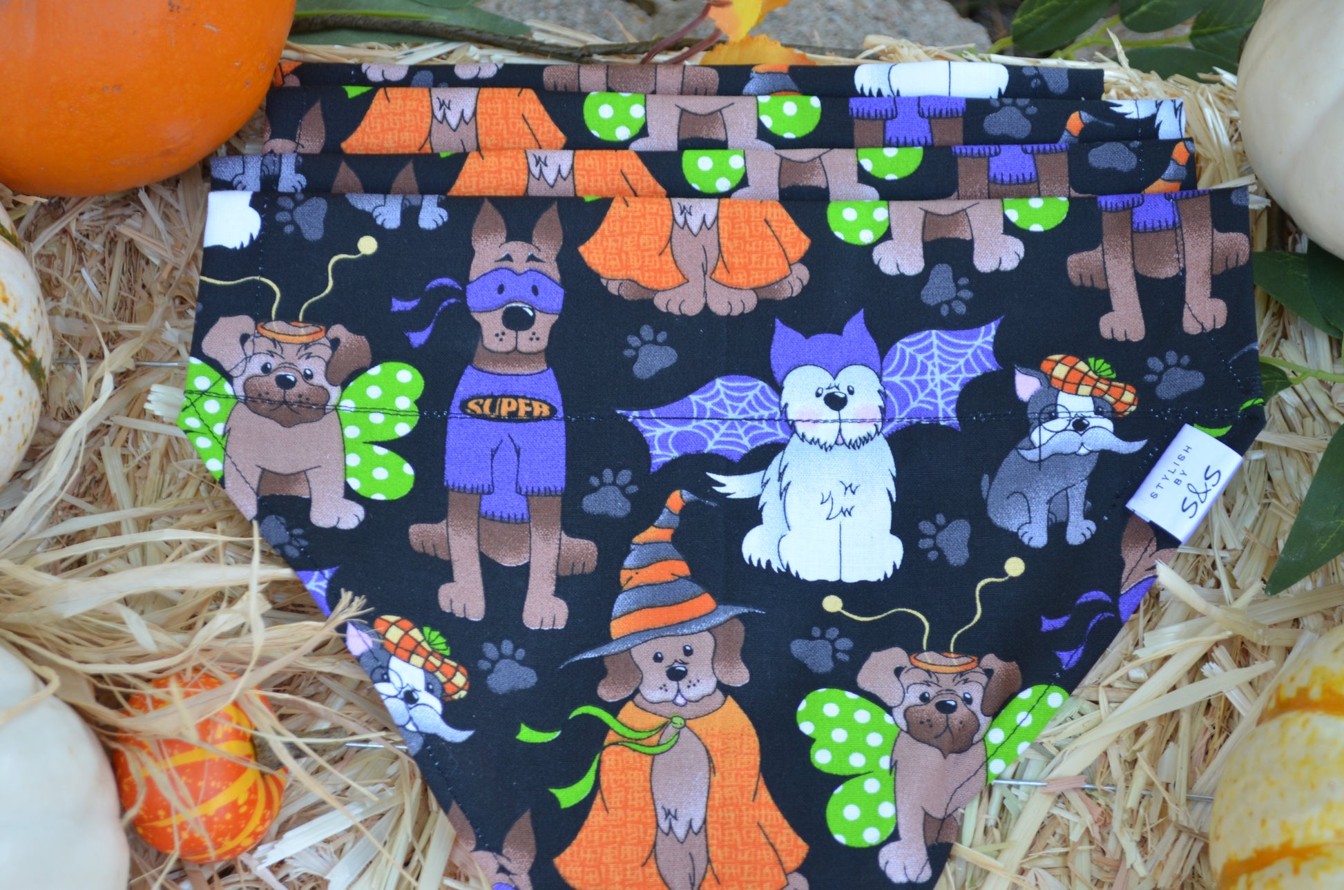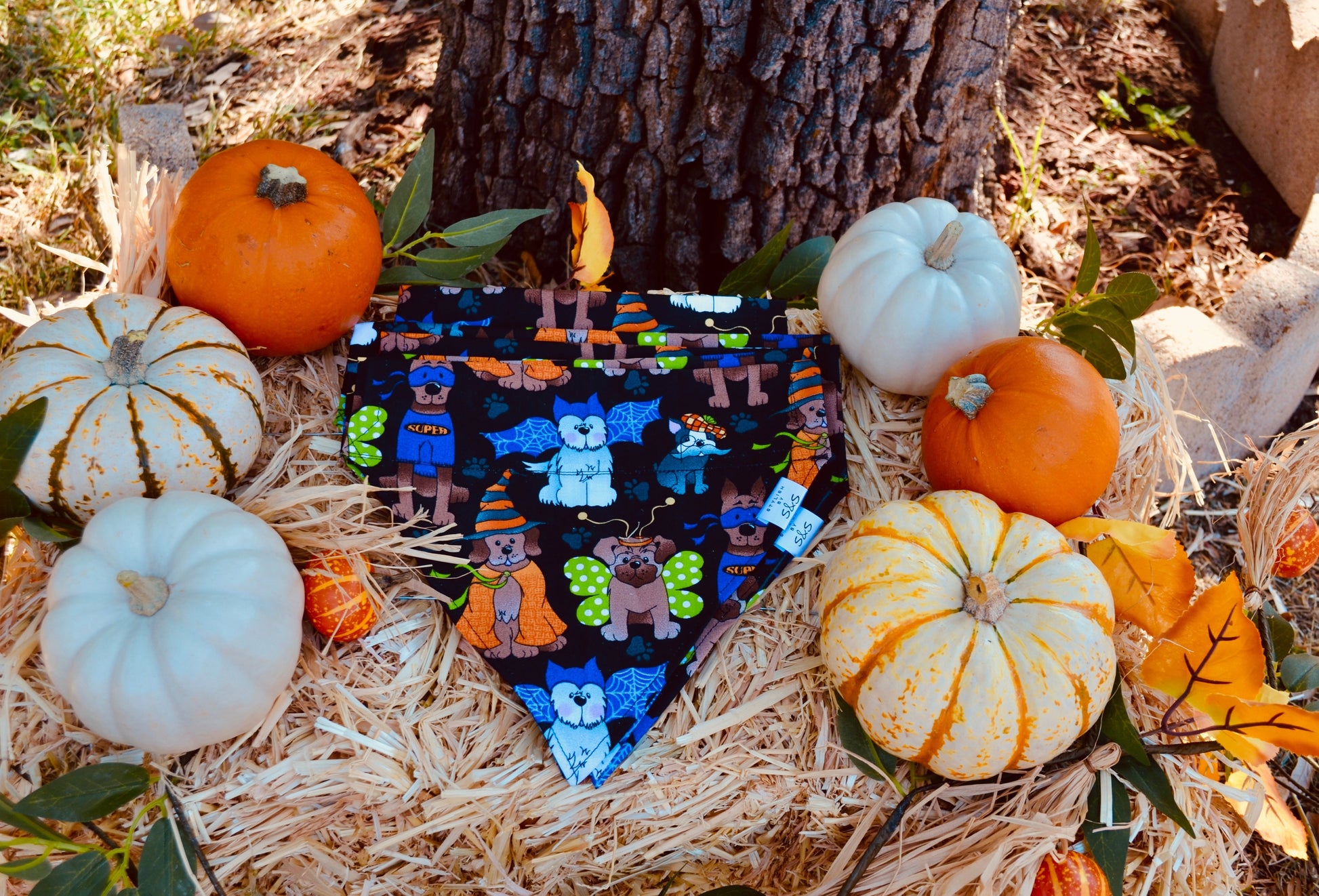 Hengrave, Sadie and Ellie are wearing size Medium in this very vibrant black Halloween bandana featuring adorable pups in costumes. Bandana Styles: Slide On, Tie Around, Custom Extra Large Tie Around