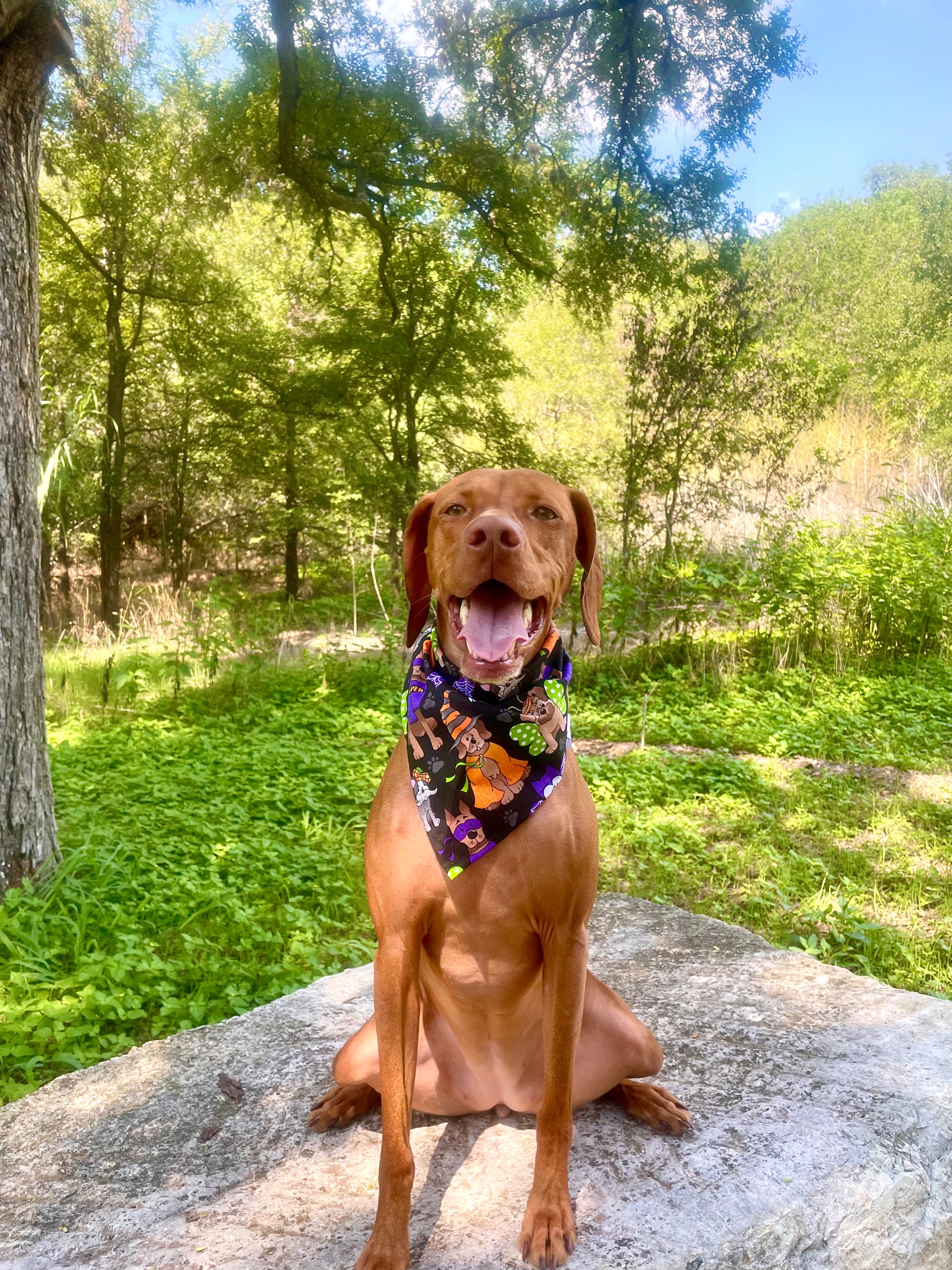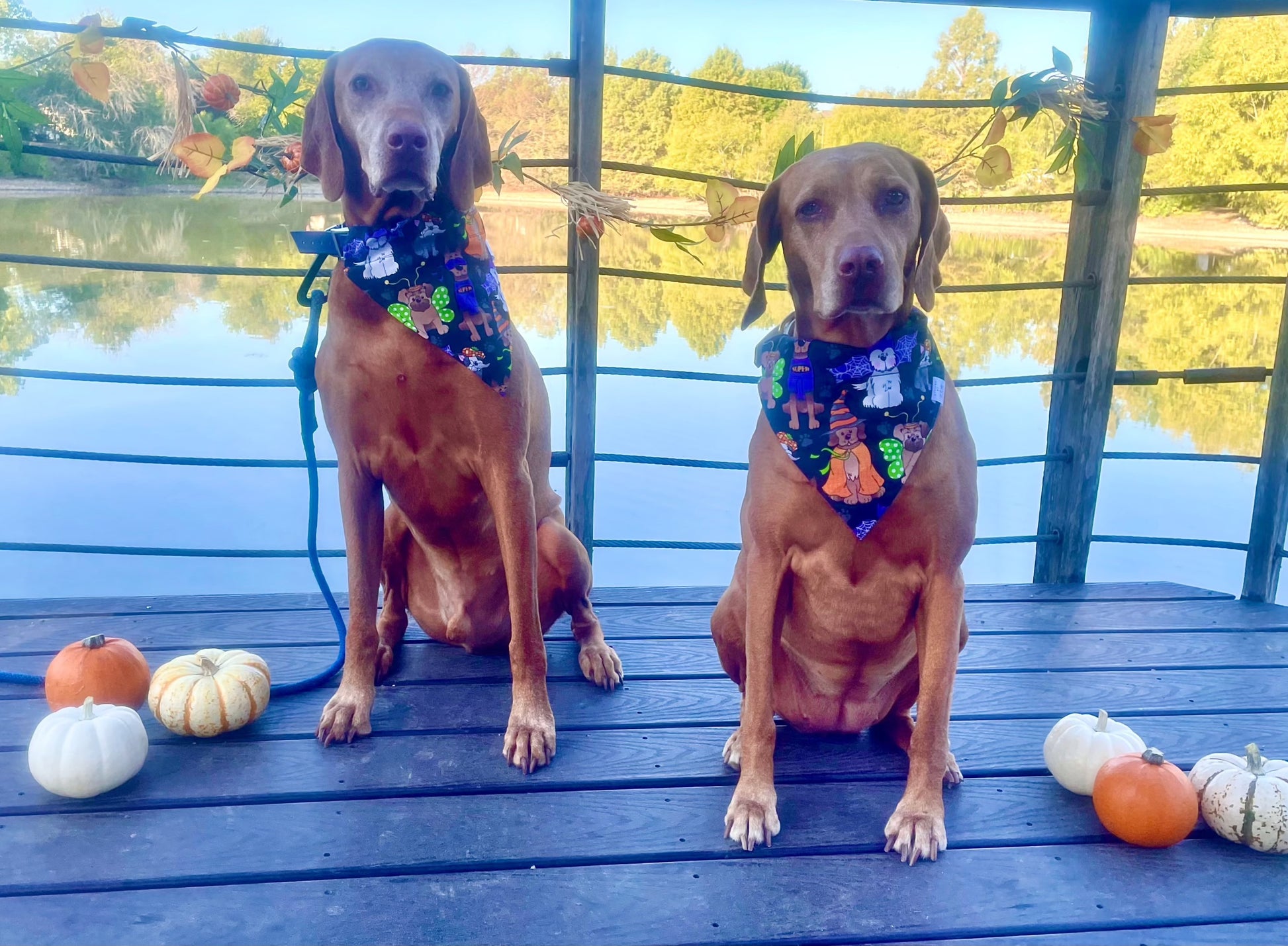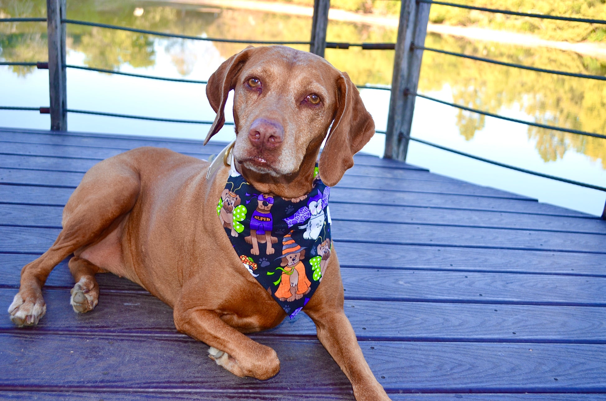 Hengrave, Sadie and Ellie are wearing size Medium in this very vibrant black Halloween bandana featuring adorable pups in costumes. Bandana Styles: Slide On, Tie Around, Custom Extra Large Tie Around