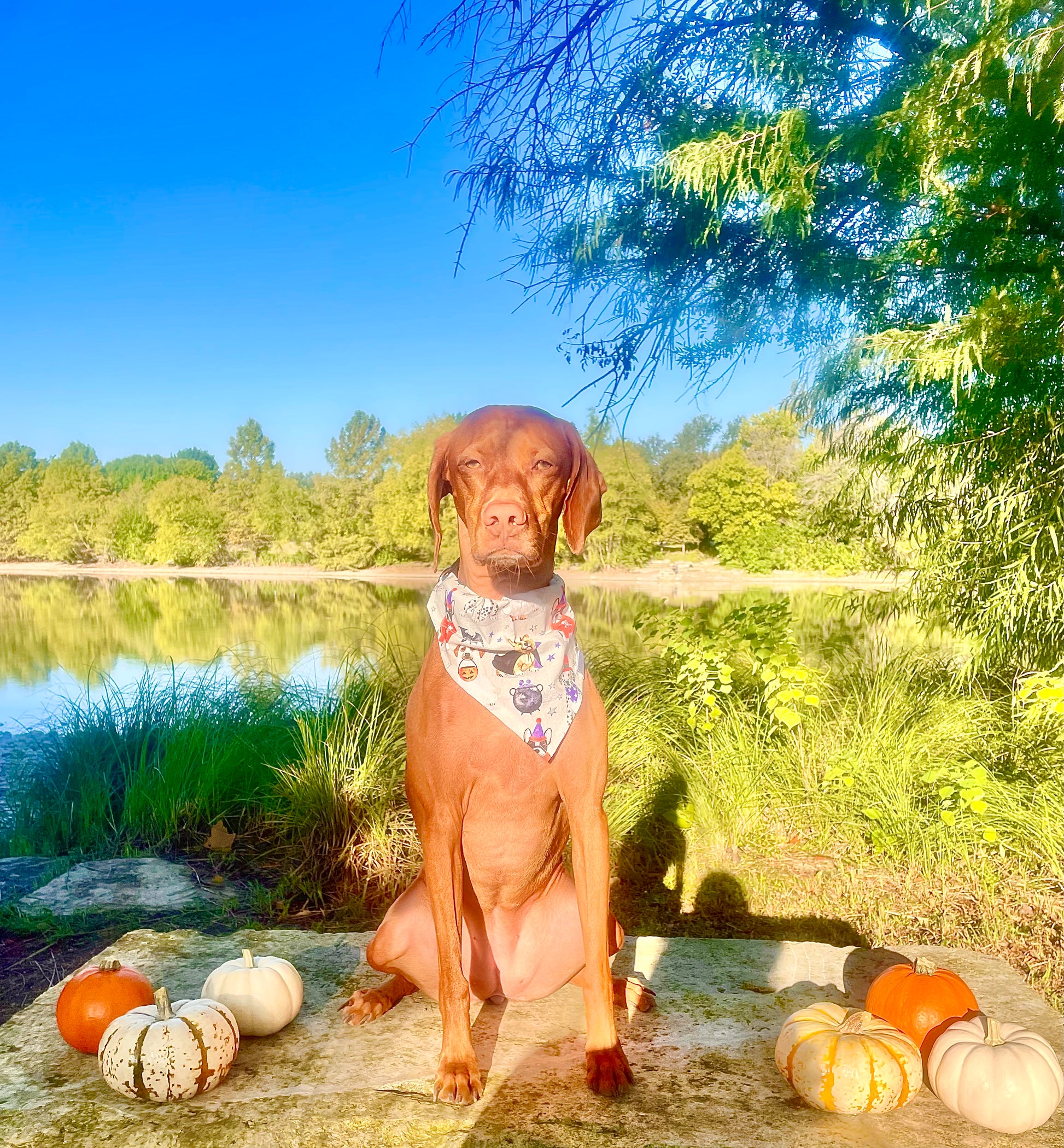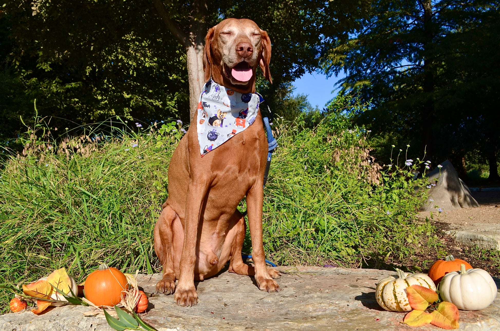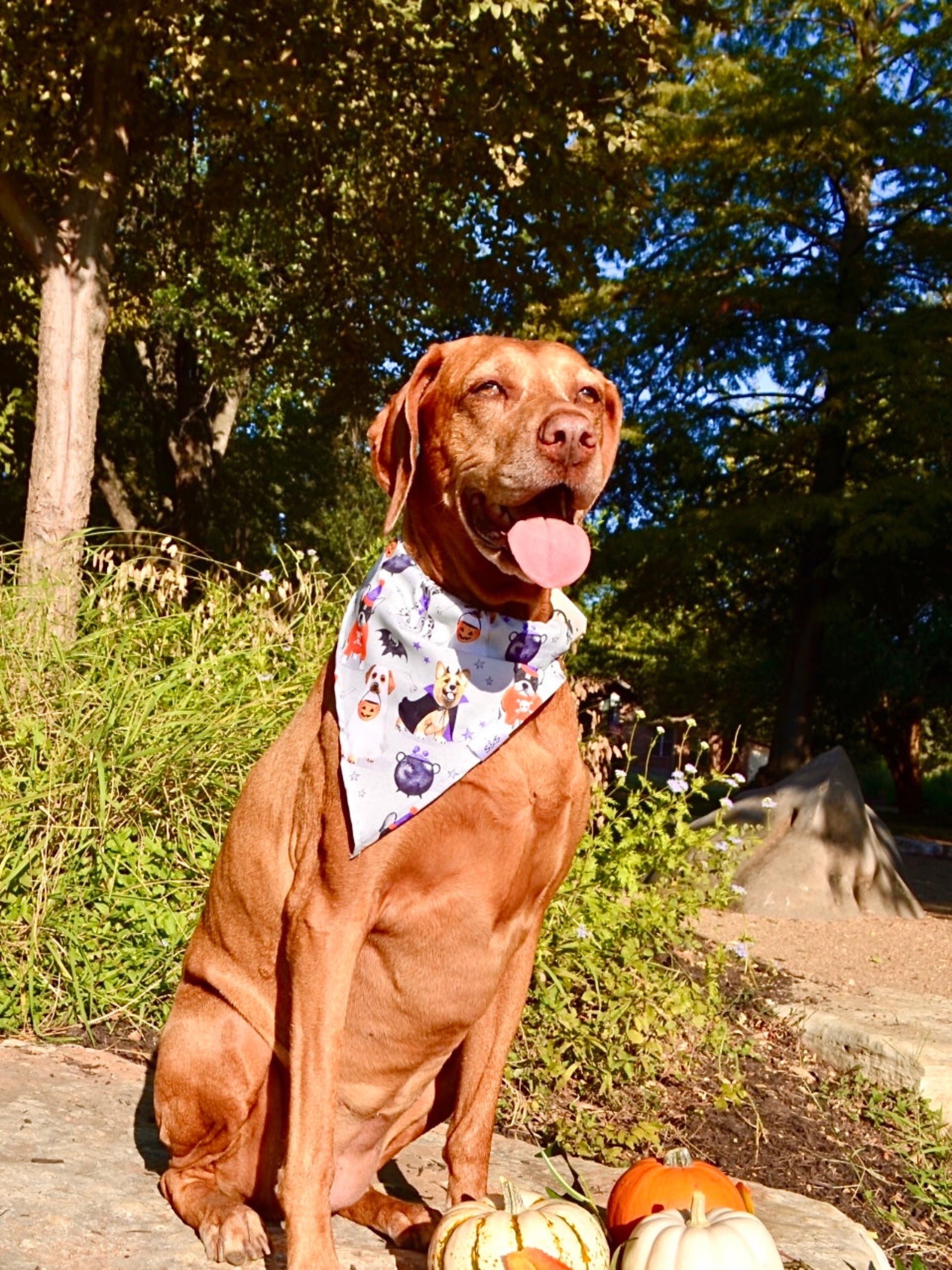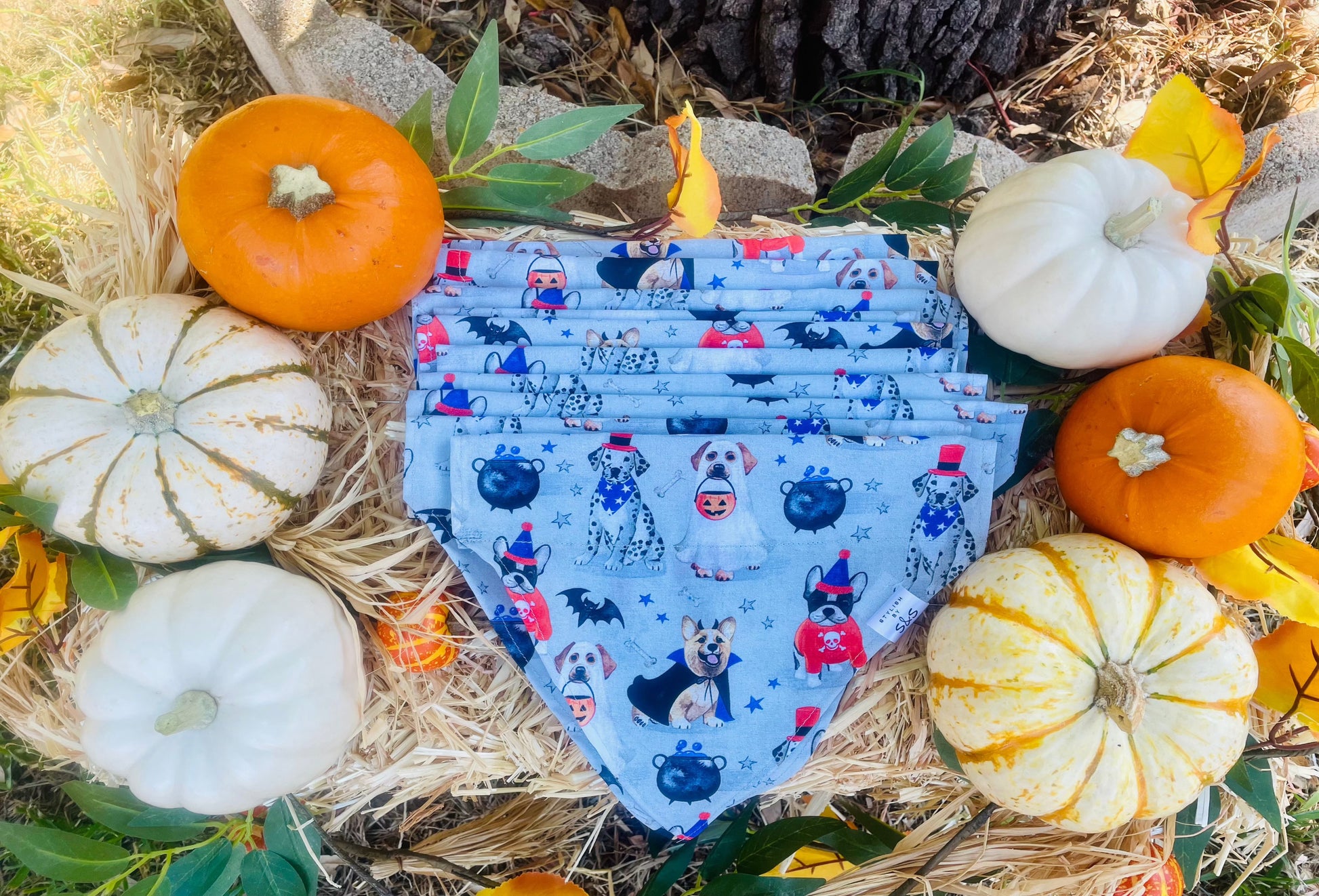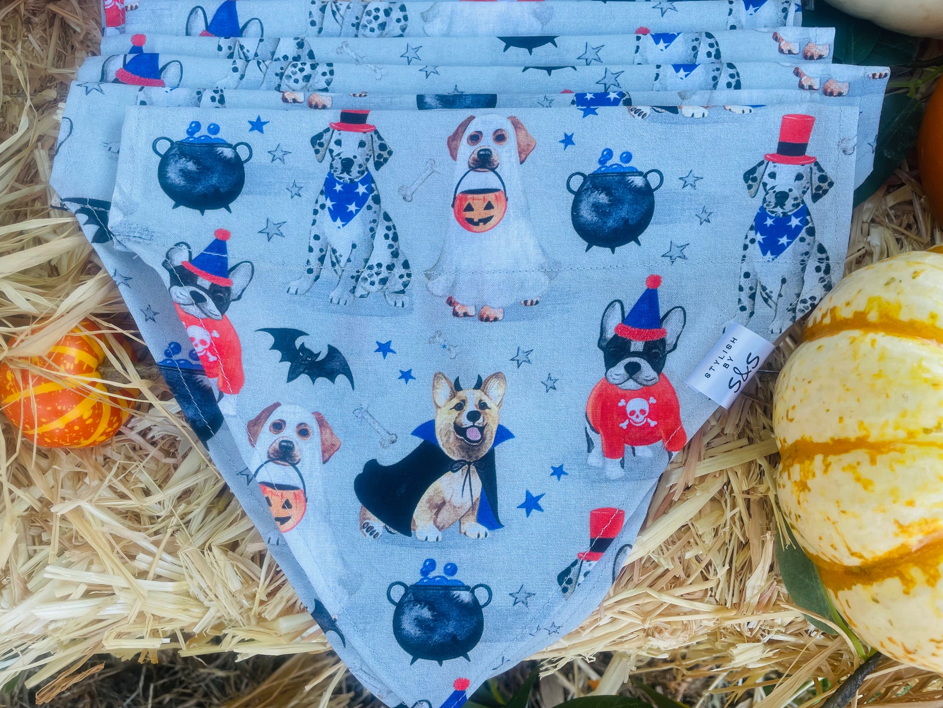 Hengrave, Sadie and Ellie are looking fabulous in this grey print Halloween bandana featuring all kinds of cute pups in costumes trick or treating. Models are wearing size Medium. Bandana Styles: Slide On, Tie Around, Custom Extra Large Tie Around (Pigs, large animals)
