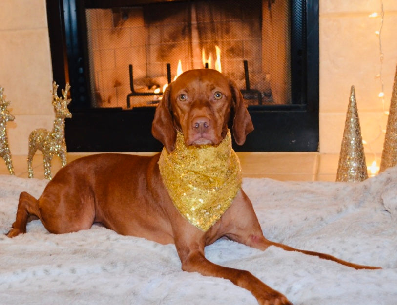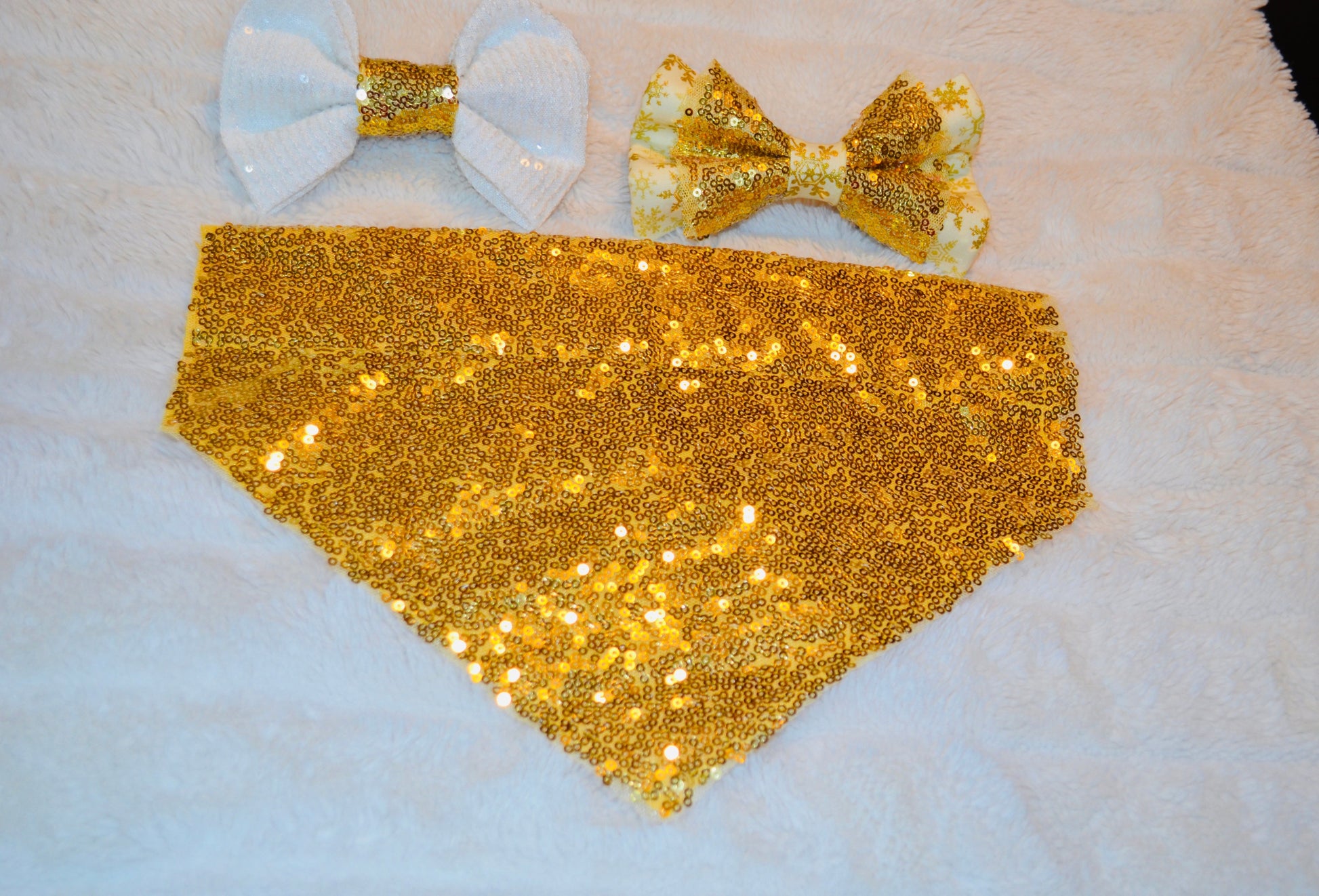 Stunning solid gold sequin bandana. Lined with soft gold flannel for comfort. Available in slide over the collar style in Extra Small, Small, Medium and Large. Pairs perfectly with many of the gold sequin bow tie styles.