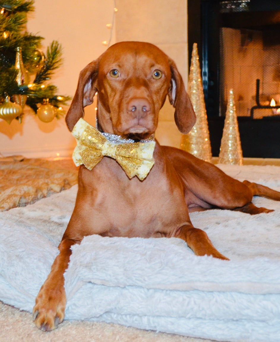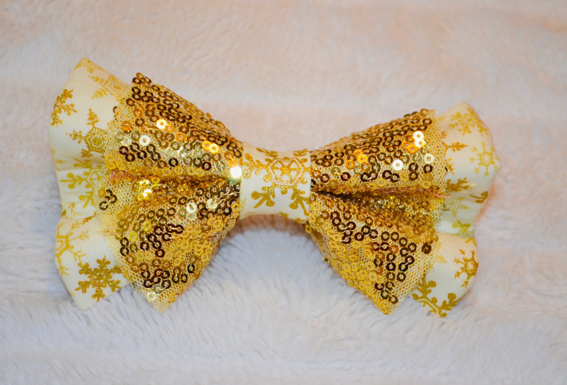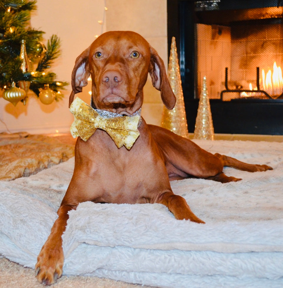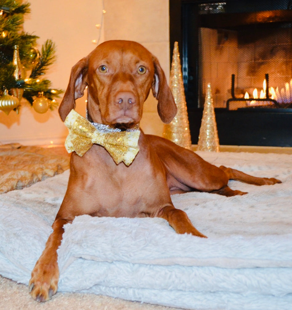 This stunning double bow tie has a gold snowflake print with a solid gold sequin center. Attaches to collar with 2 adjustable soft velcro straps to ensure the bow tie stays perfectly straight. Pairs perfectly with the gold sequin bandana.