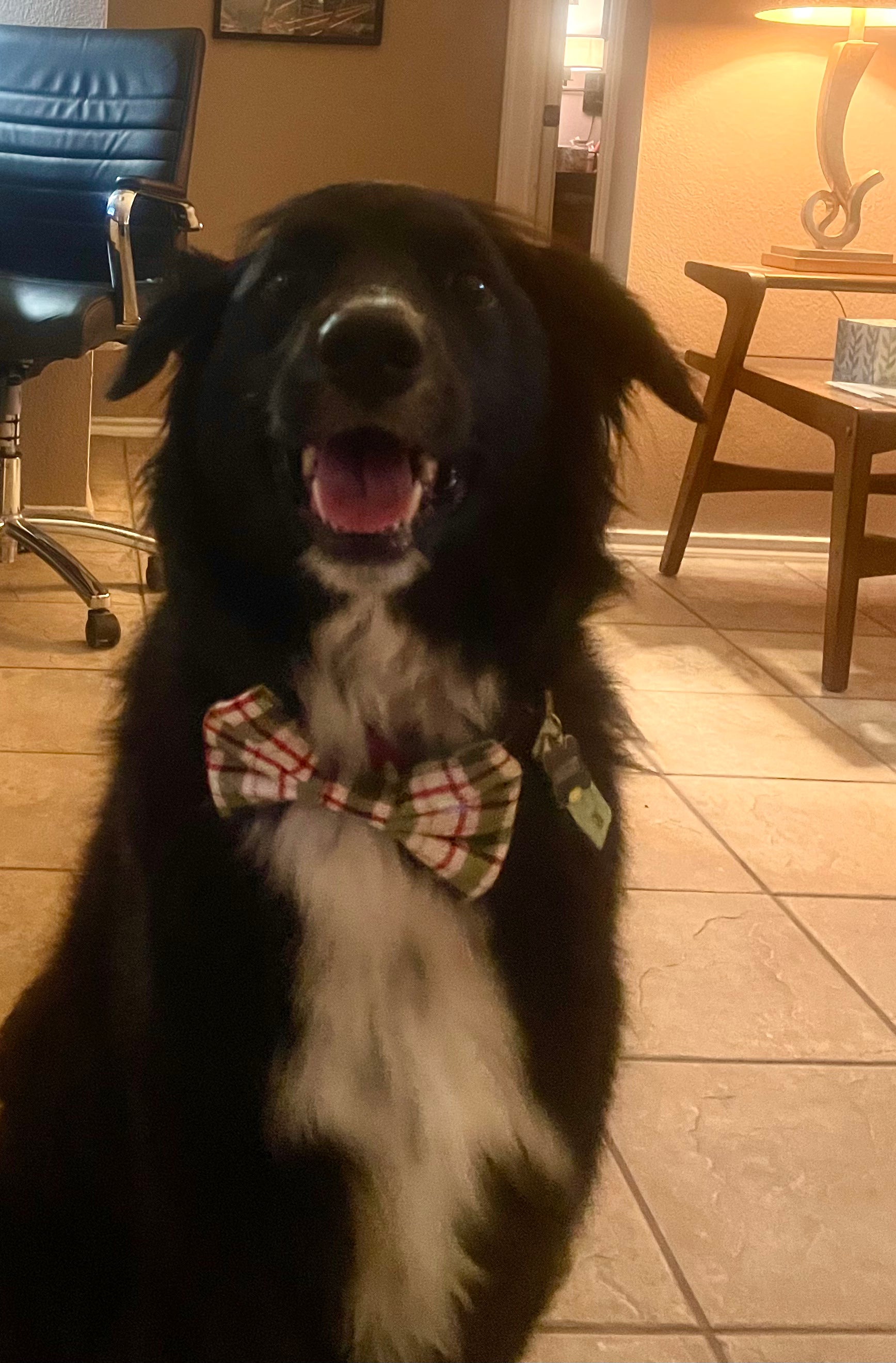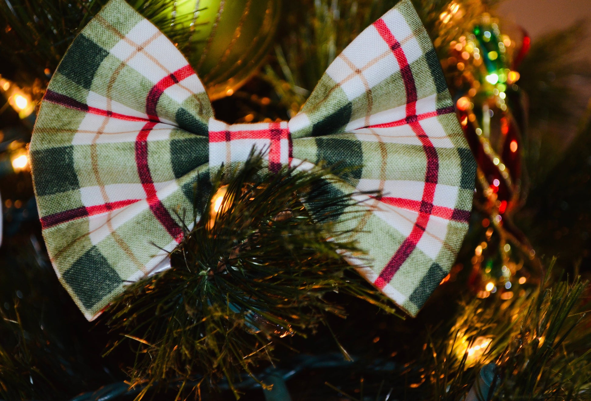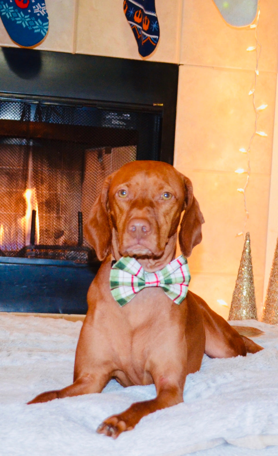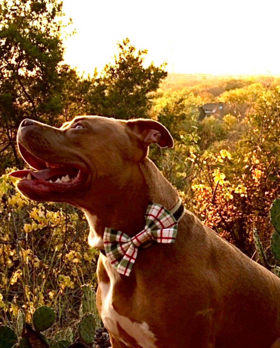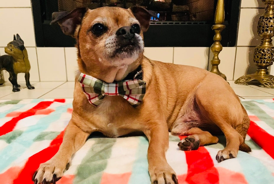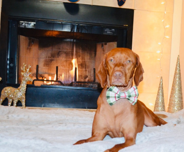 Bailey looks dapper in this green and red plaid bow tie. Attaches to collar with 2 adjustable soft velcro straps to ensure the bow tie stays perfectly straight.