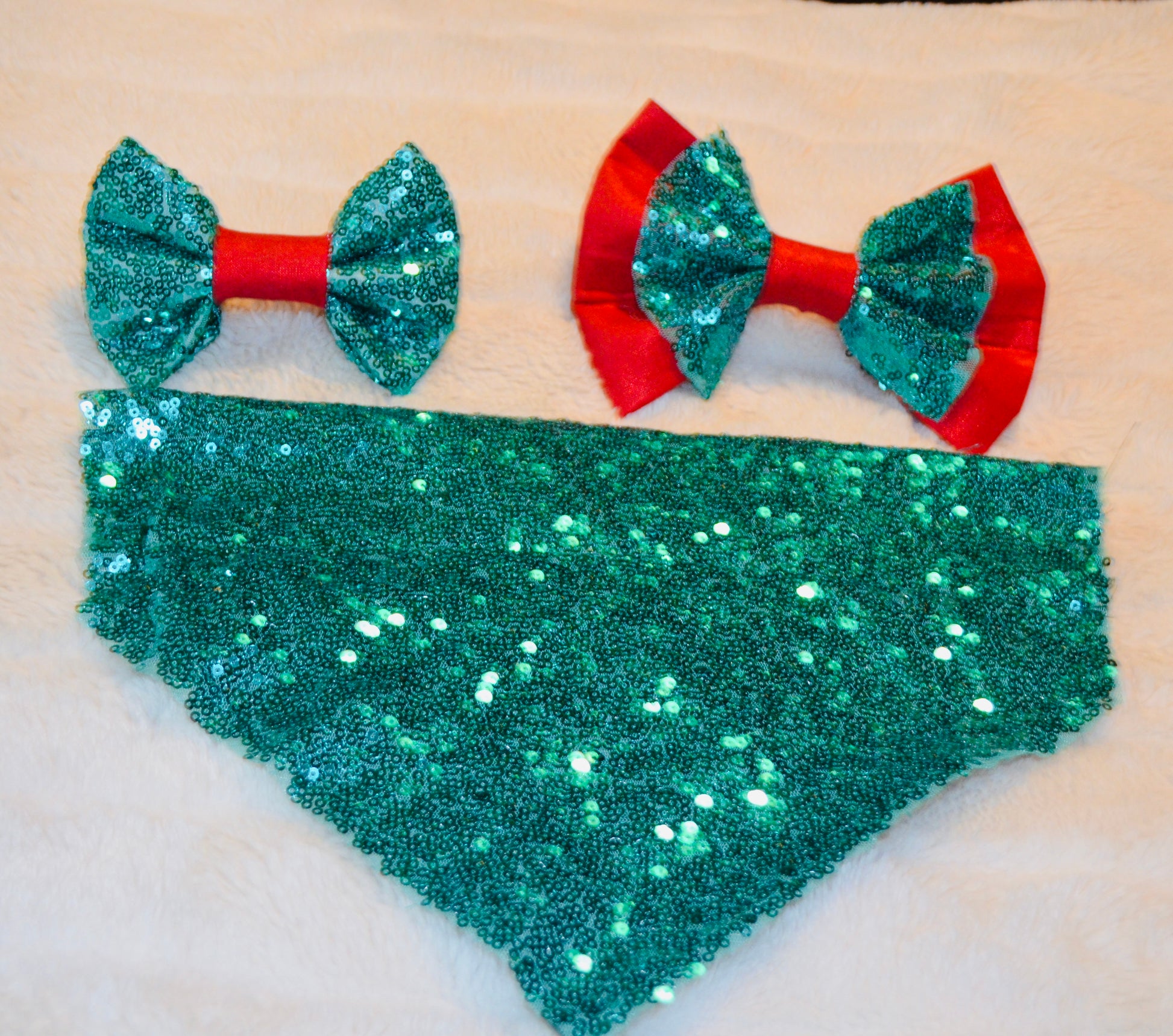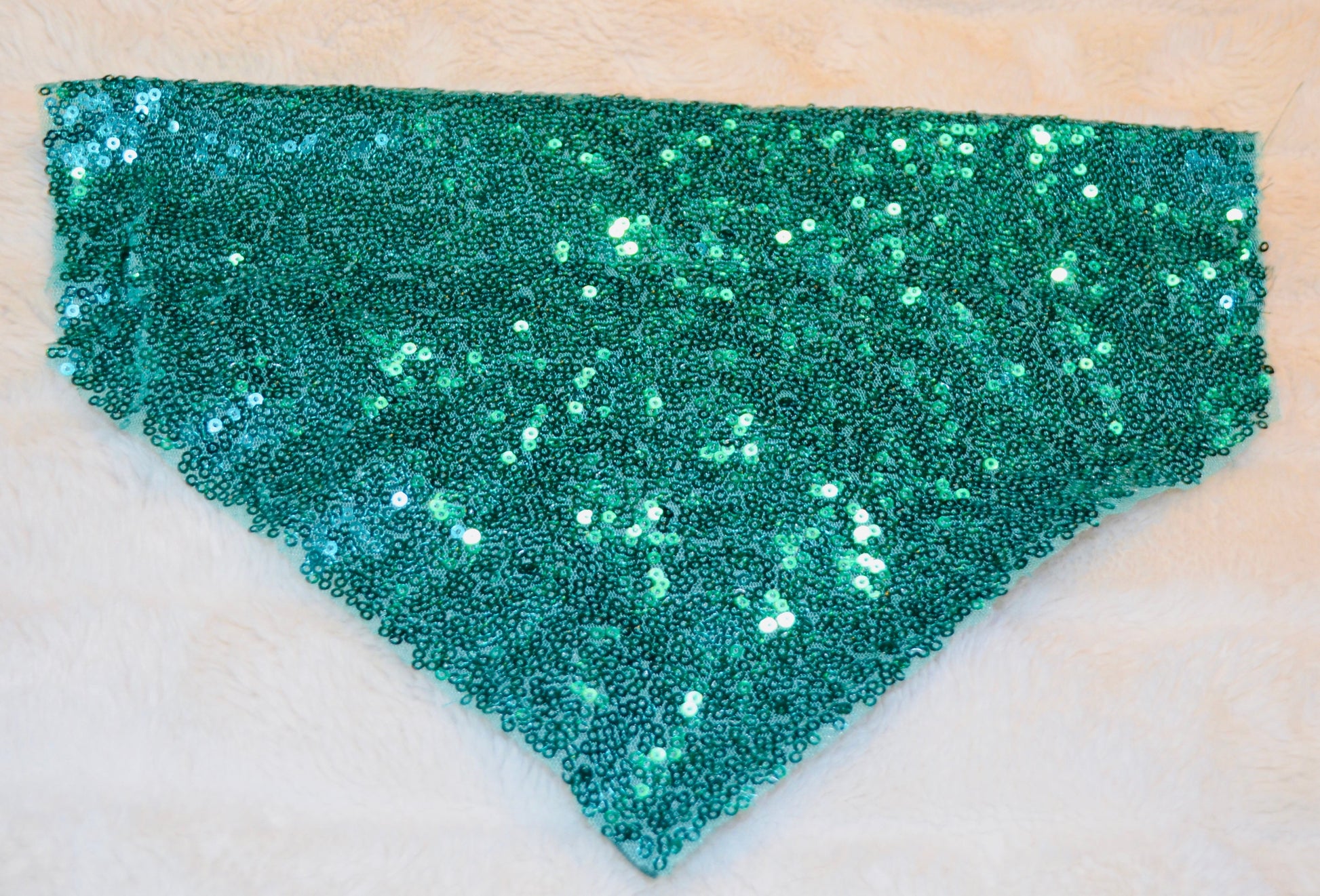 Stunning solid green sequin bandana. Lined with soft green satin for comfort. Available in slide over the collar style in Extra Small, Small, Medium and Large. Pairs perfectly with green sequin bow tie styles.