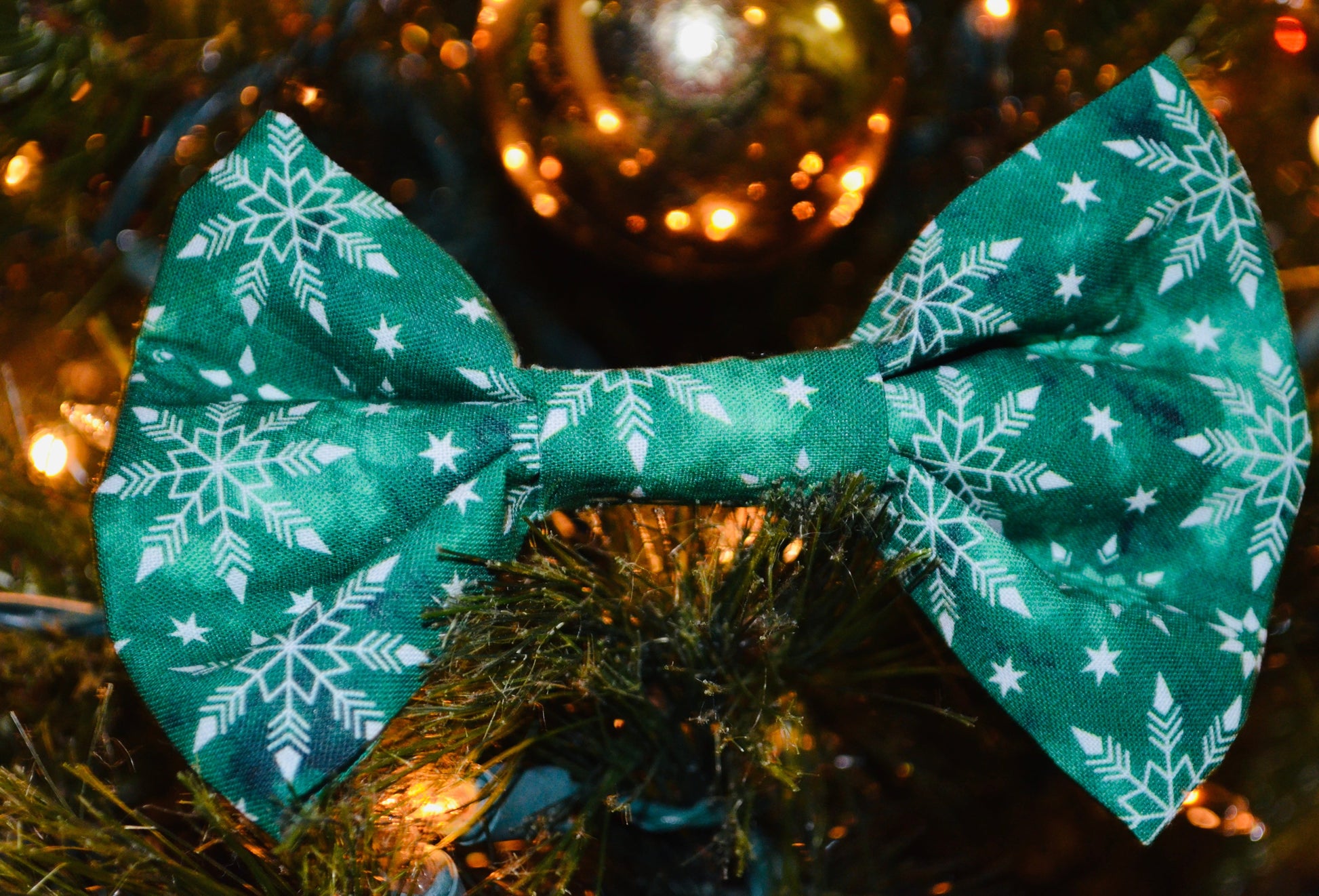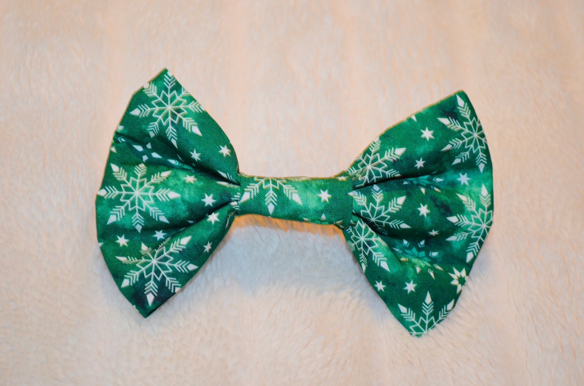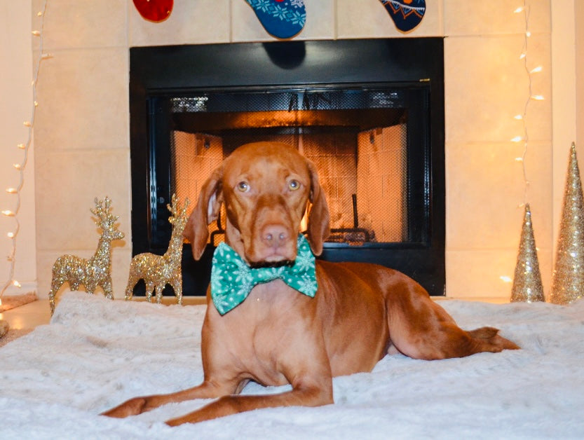Green and white snowflake print bow tie. Attaches to collar with 2 adjustable soft velcro straps to ensure the bow tie stays perfectly straight.