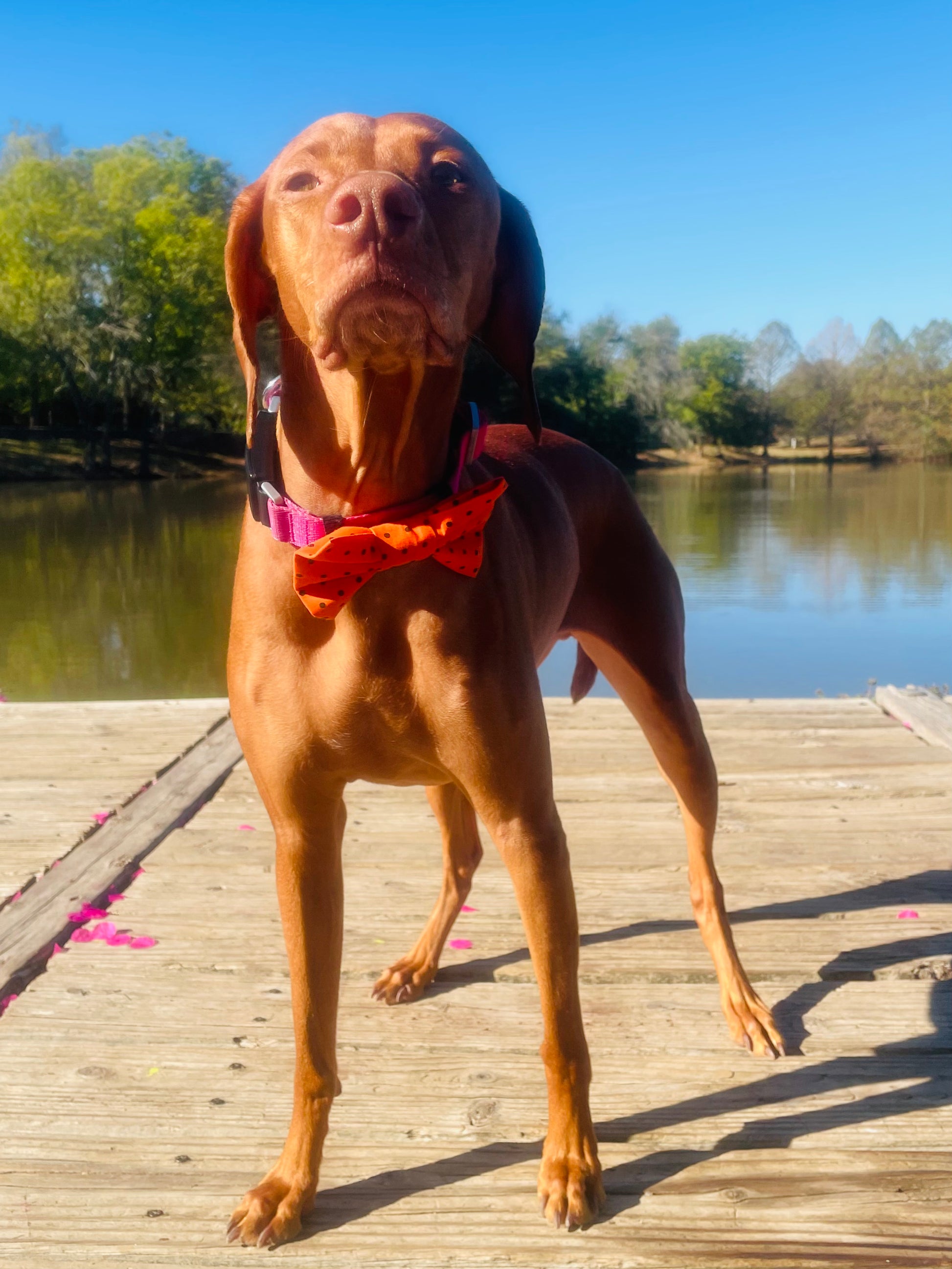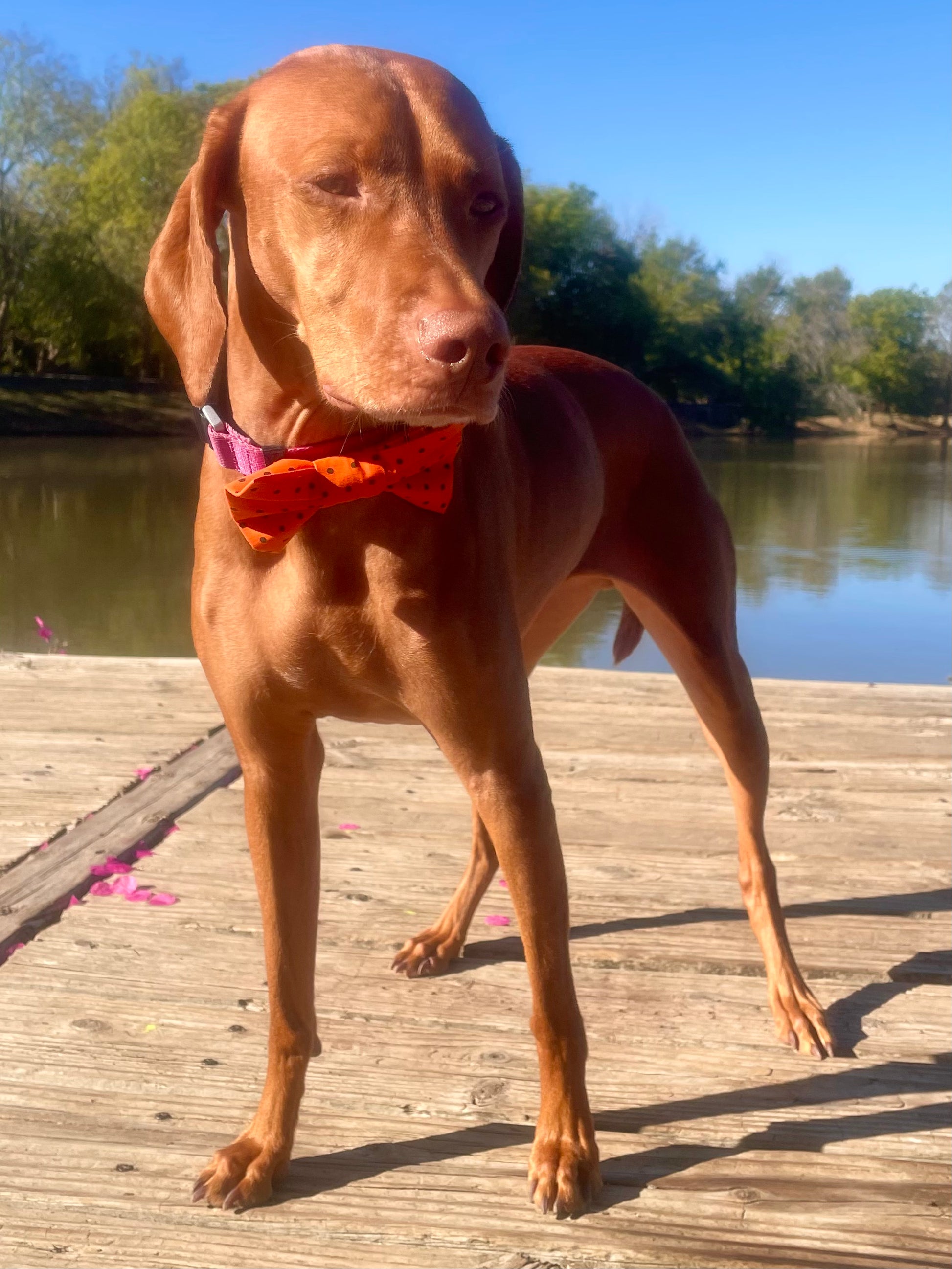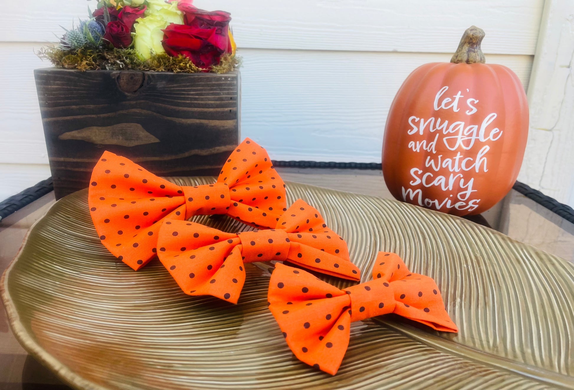 Orange and black polkadot print bow tie. Available in XS, S, M, L, XL. Fits collar widths up to 2” with 2 soft velcro loops.