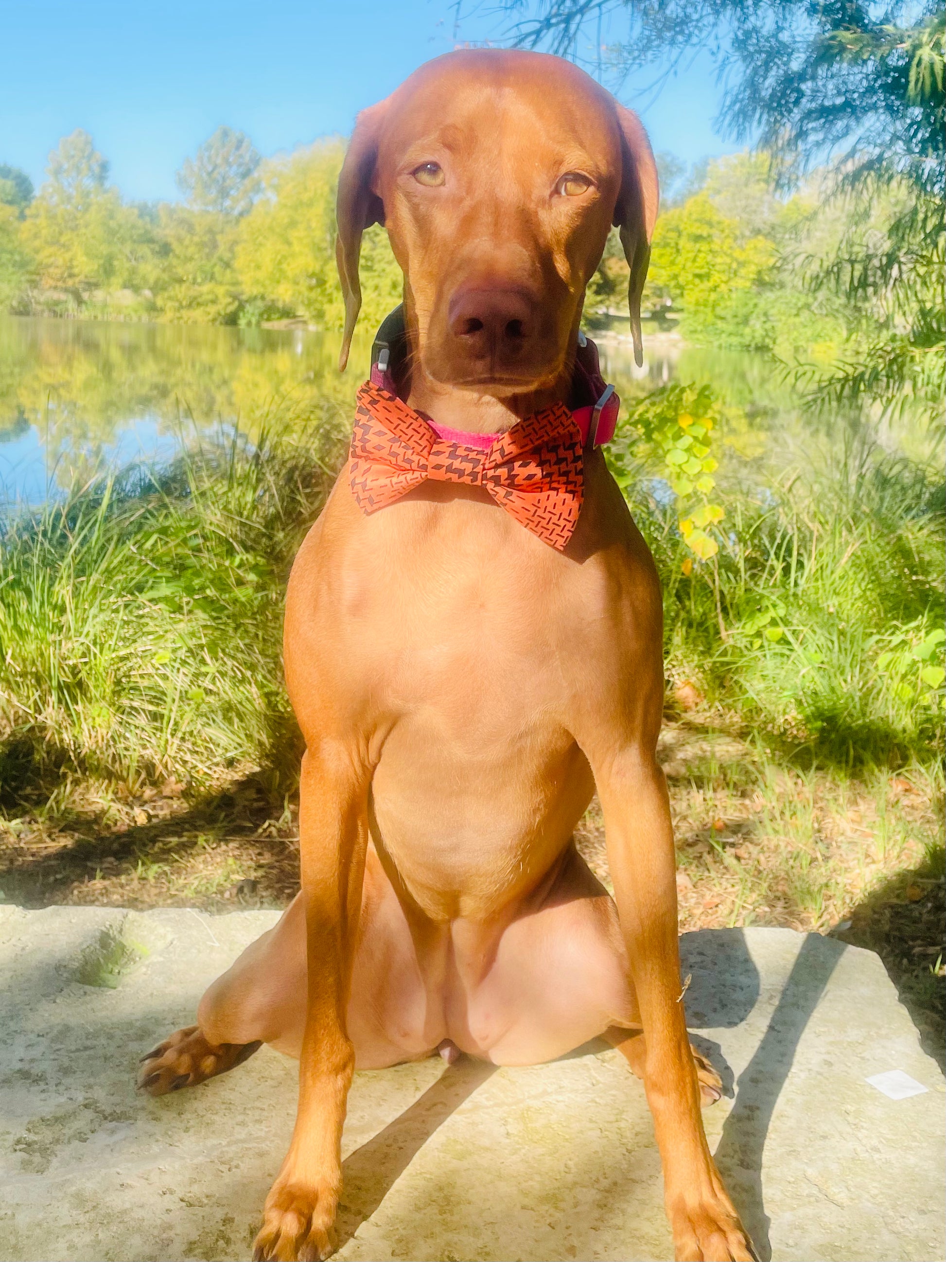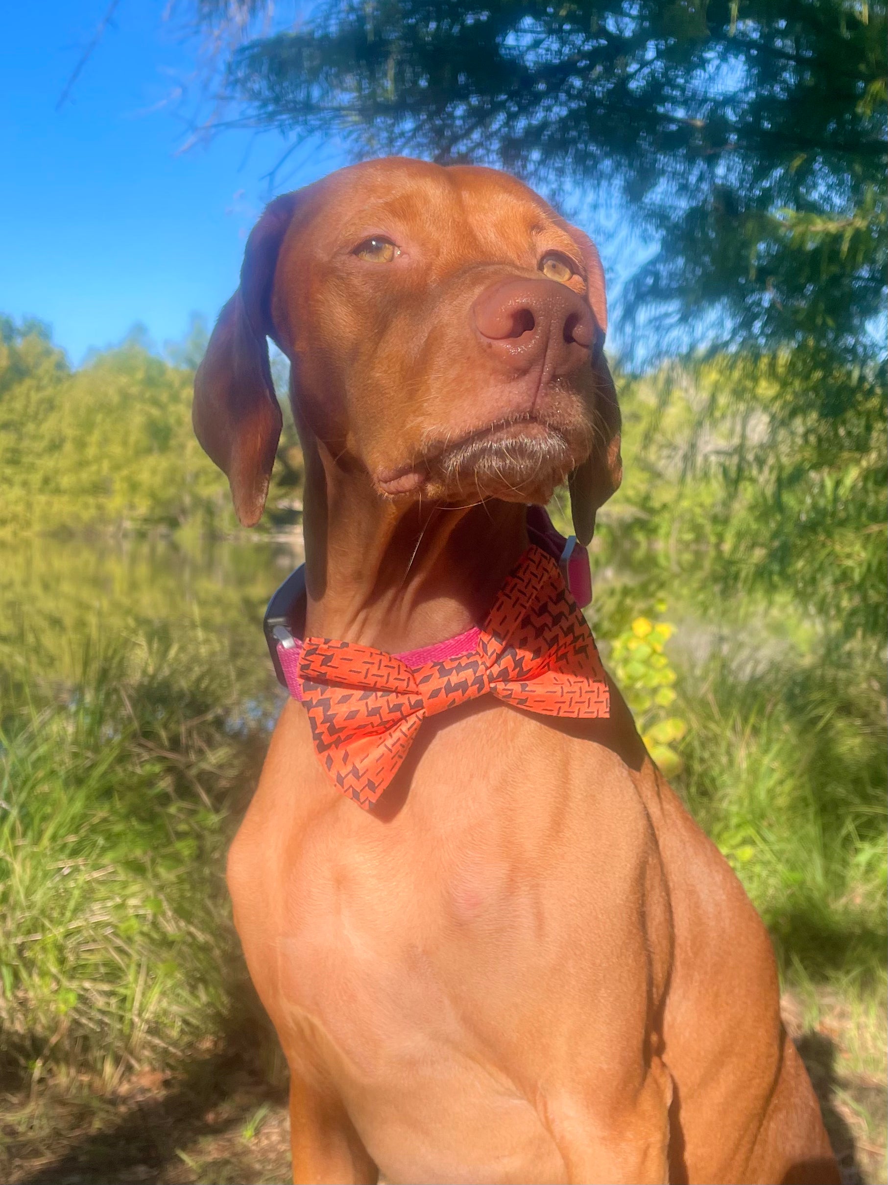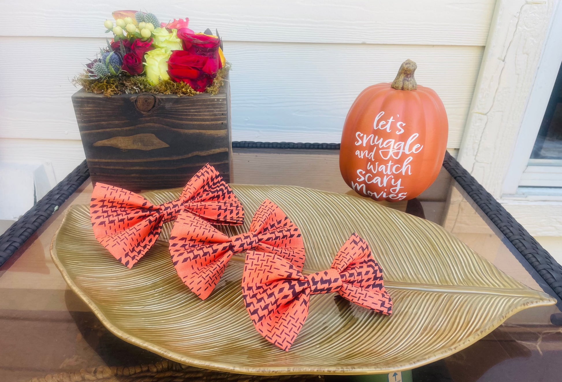 Orange and black houndstooth bow tie. Available in XS, S, M, L & XL. This will easily attach to collars up to 2” in width with 2 soft velcro loops.