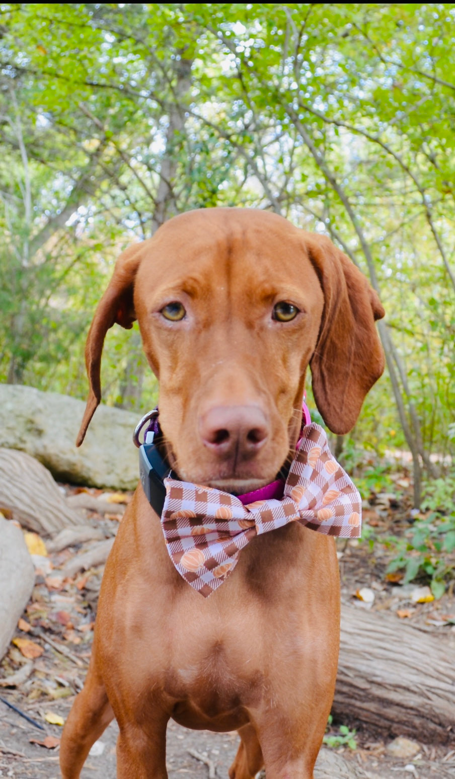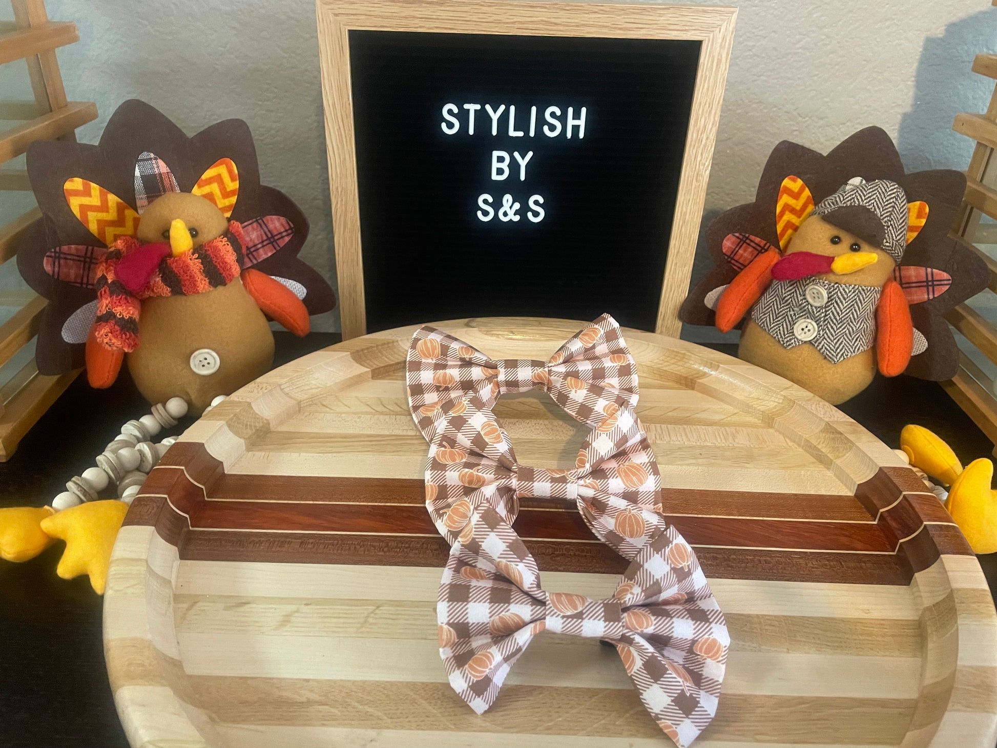 Peach and brown plaid cotton bow tie with mini pumpkins. This adorable bow tie is the perfect accessory for Thanksgiving and any Fall festivity. Available in XS, S, M, L and XL.