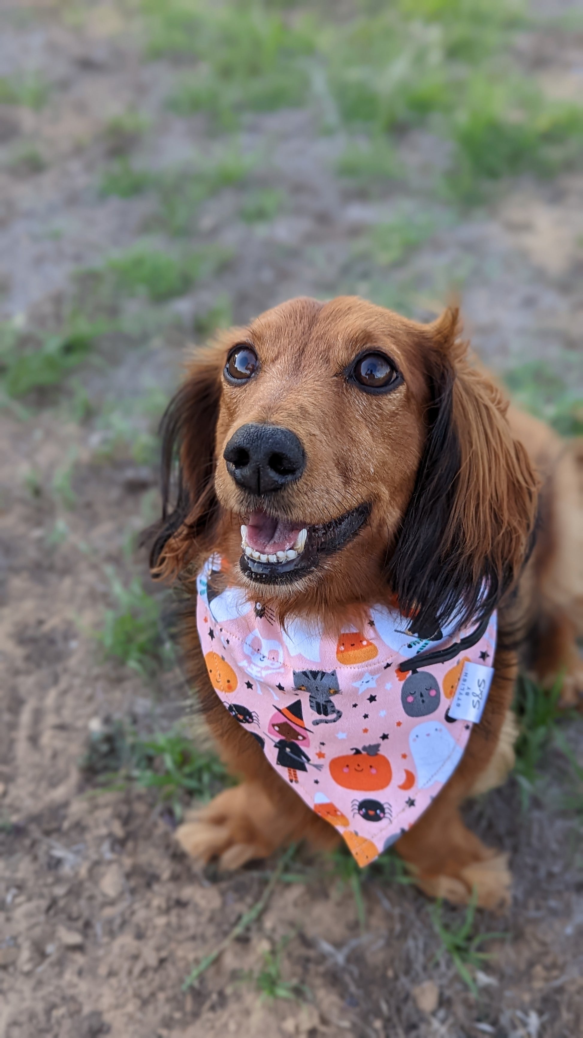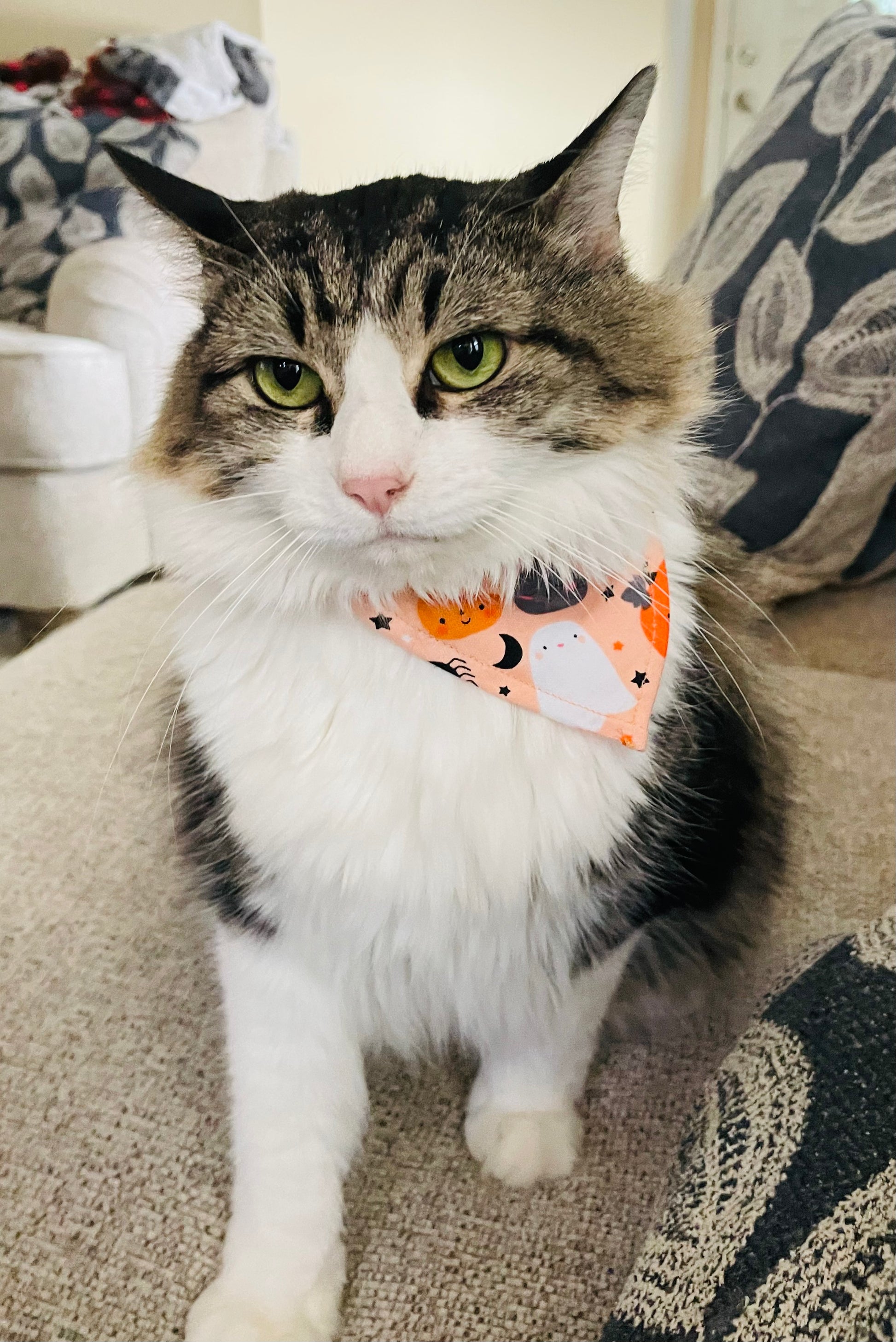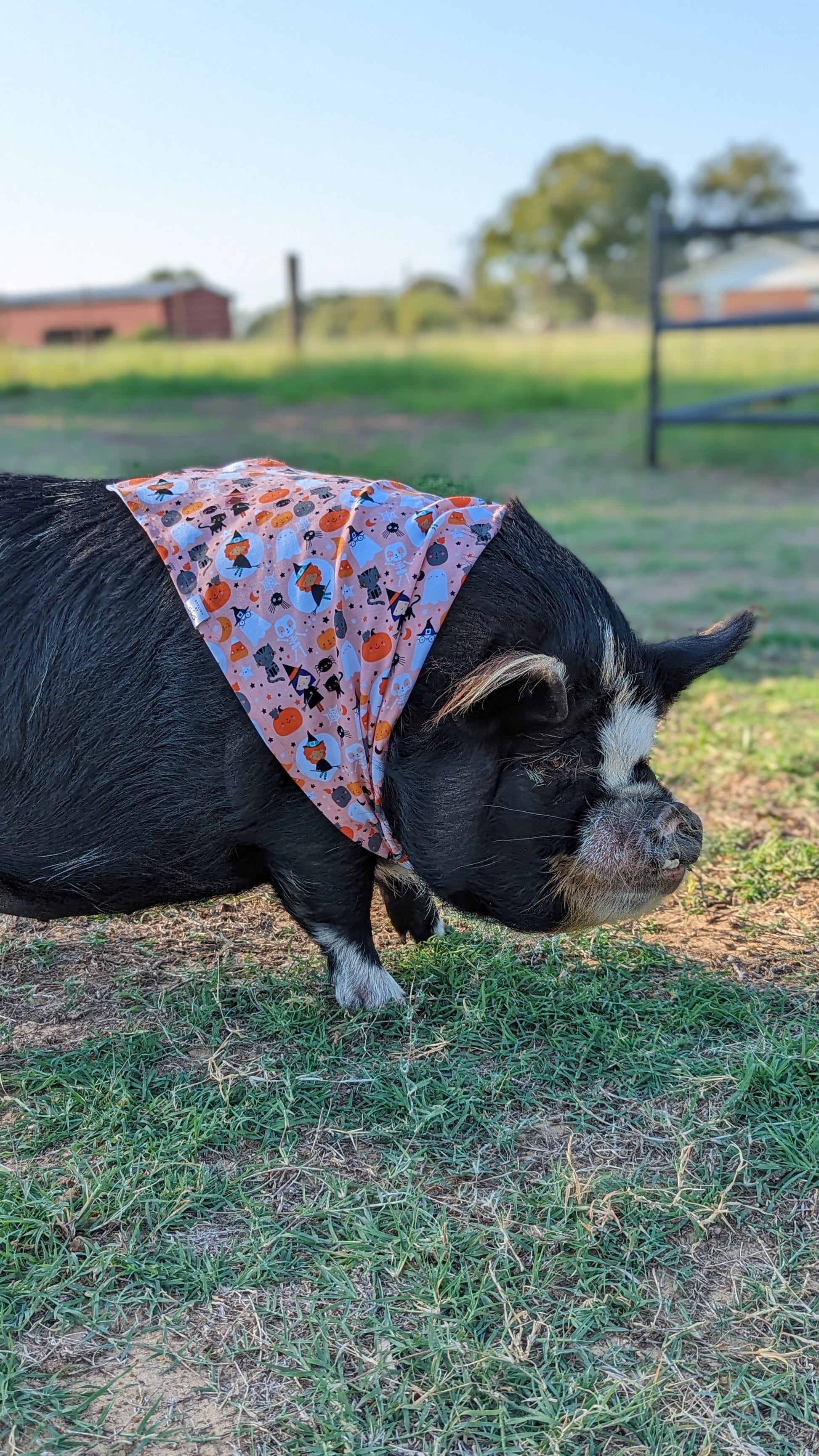 This lively peach colored Halloween bandana has a little bit of everything: witches, pumpkins, ghosts and cats. Available as a traditional tie around bandana. Ripley our favorite pig from Halbert farm is modeling our custom extra large option. Ranger Halbert is proudly representing the Dachshund’s wearing size small. Charlie, Lizzie & Jane Roberts our favorite kitty models are wearing extra small.