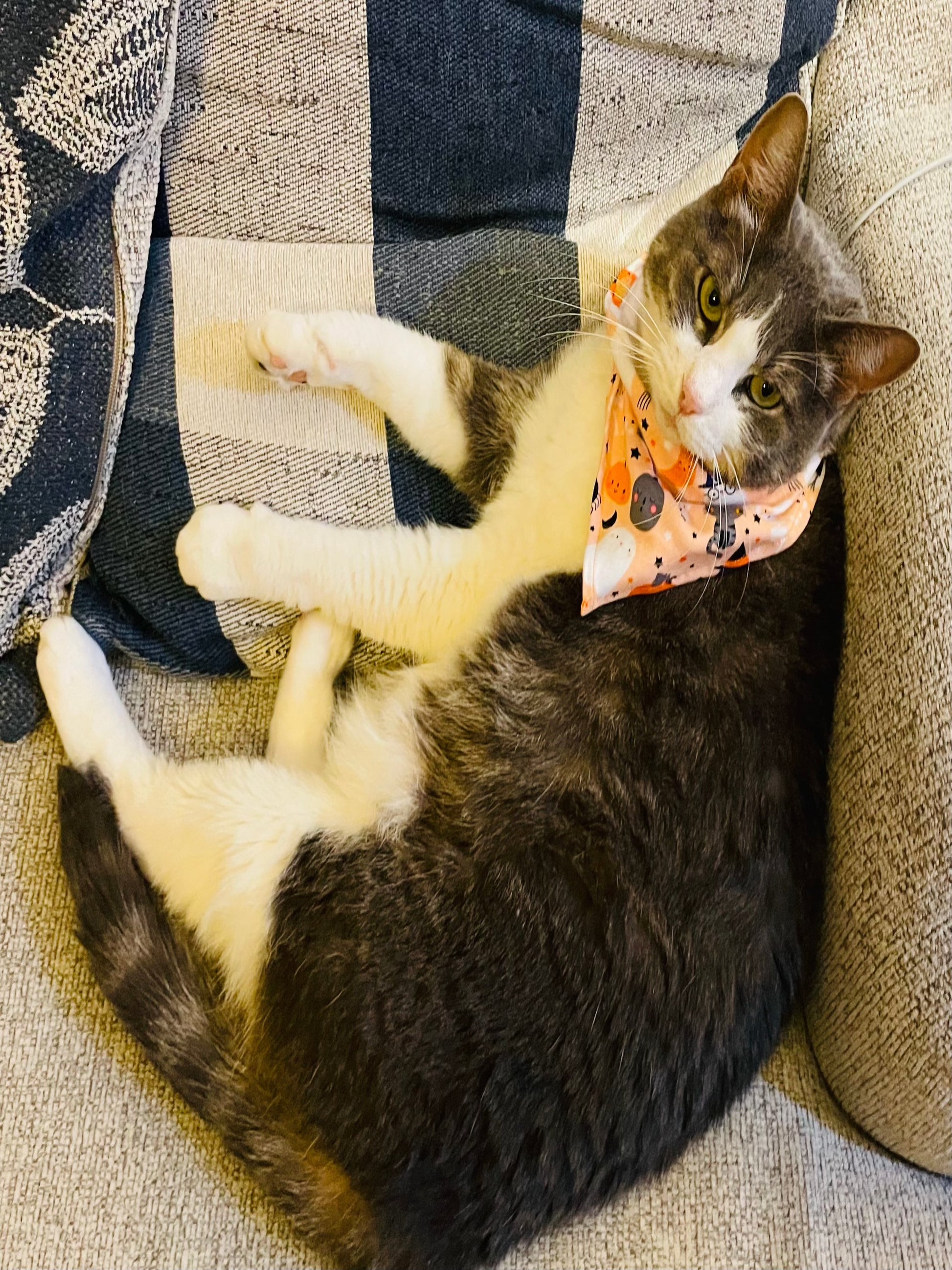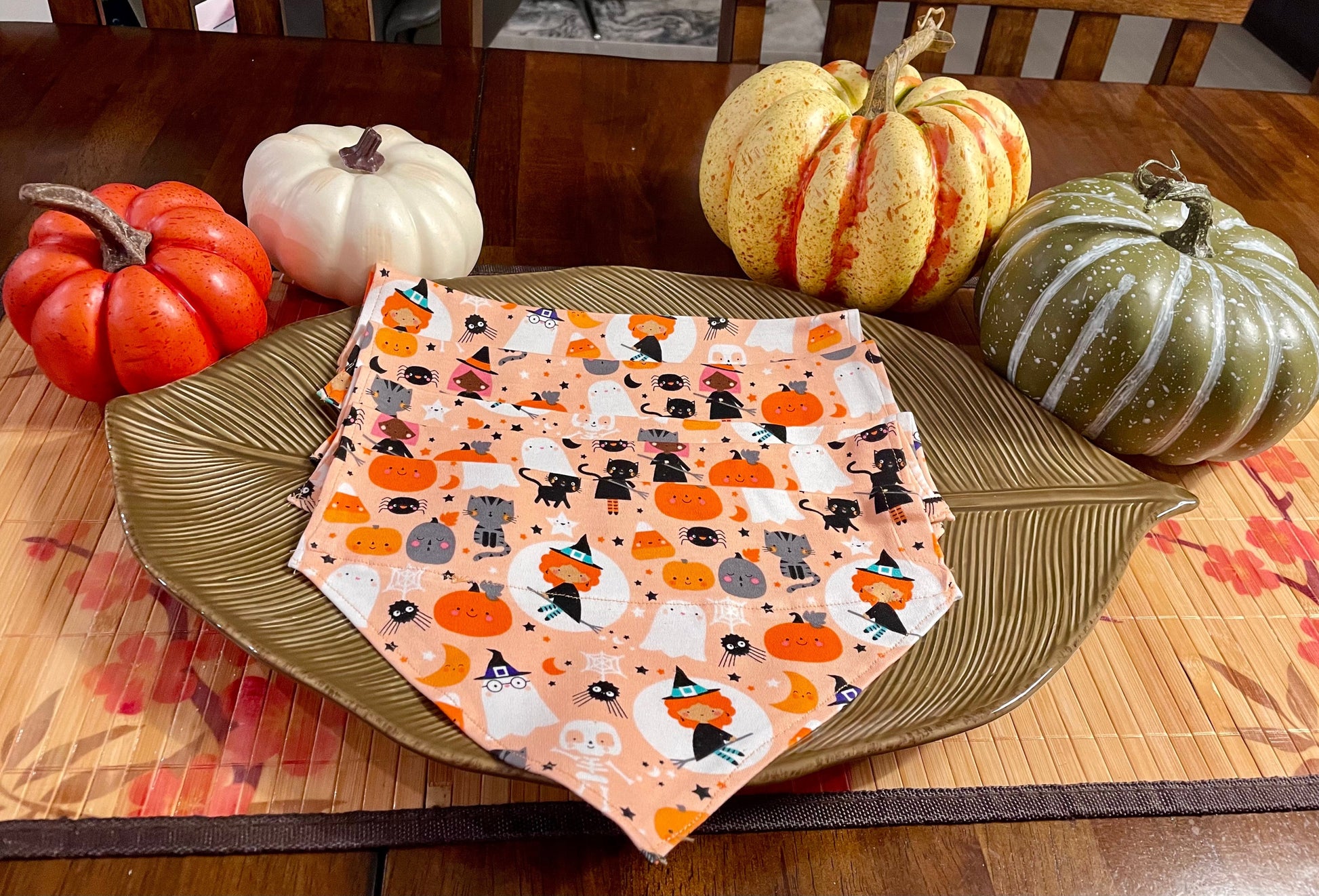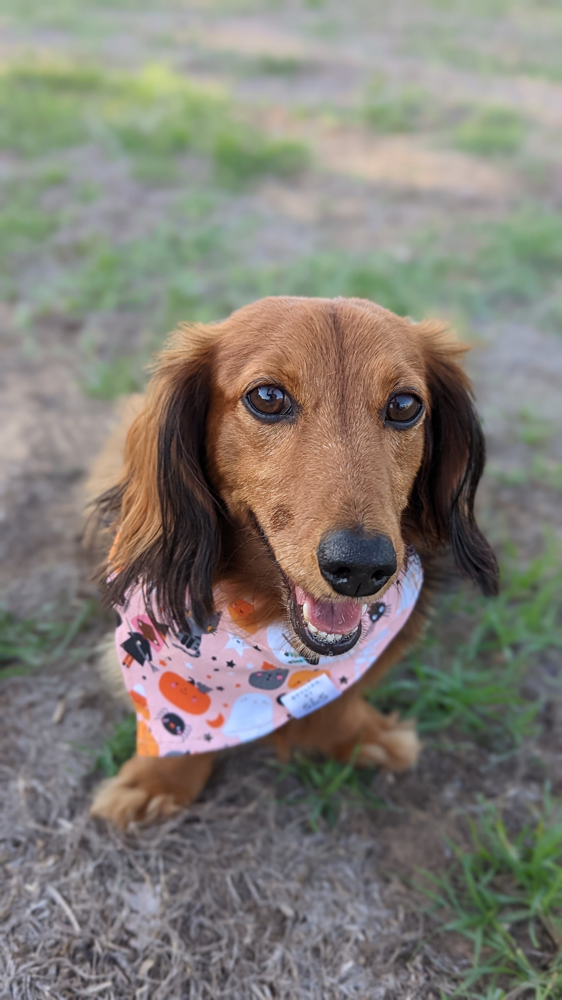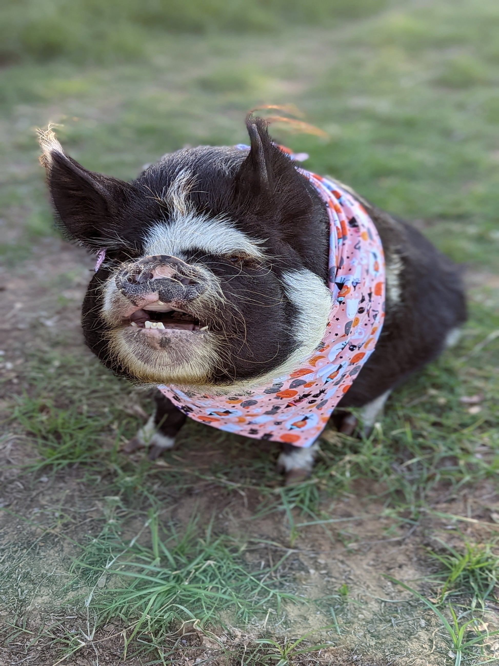 This lively peach colored Halloween bandana has a little bit of everything: witches, pumpkins, ghosts and cats. Available as a traditional tie around bandana. Ripley our favorite pig from Halbert farm is modeling our custom extra large option. Ranger Halbert is proudly representing the Dachshund’s wearing size small. Charlie, Lizzie & Jane Roberts our favorite kitty models are wearing extra small.