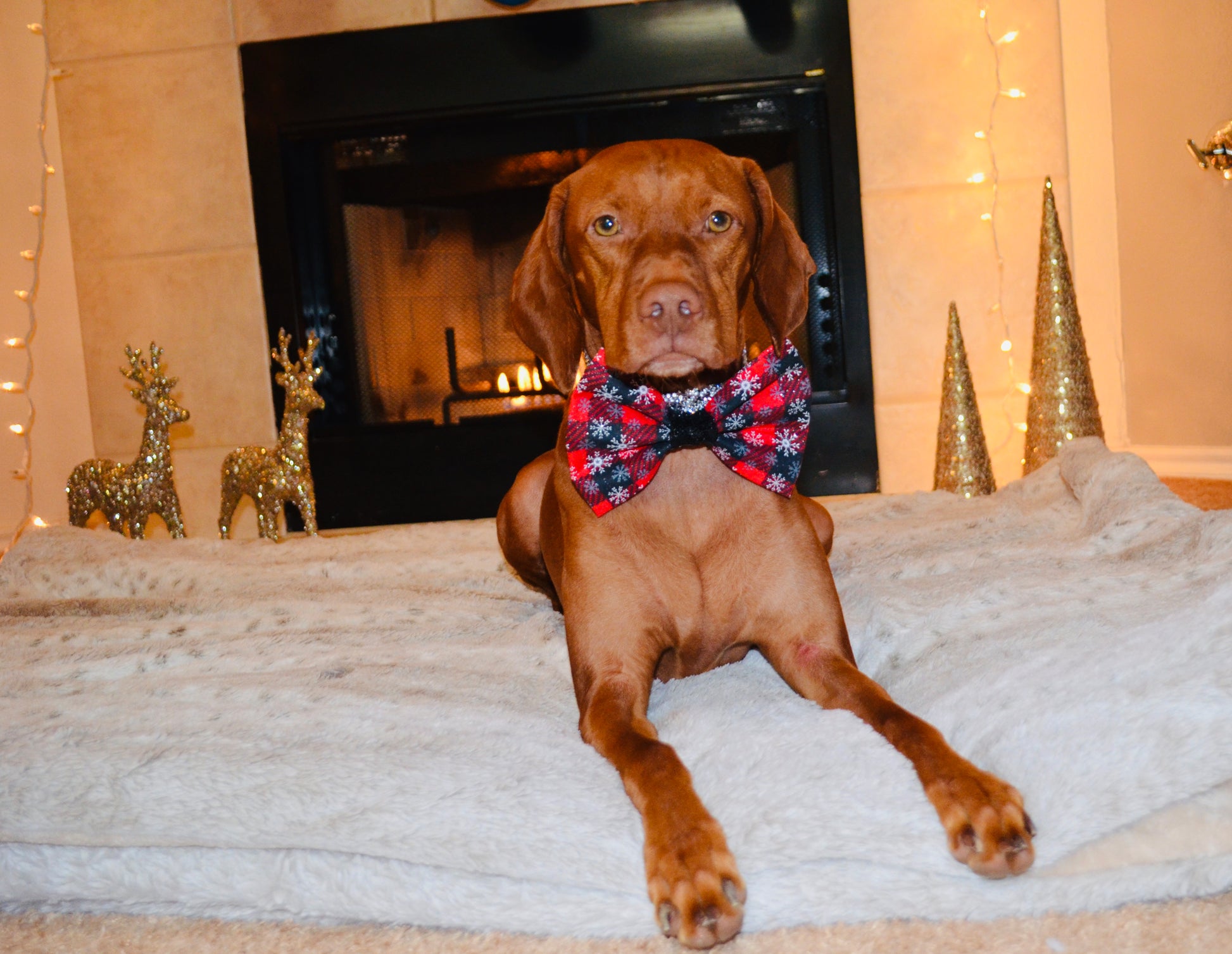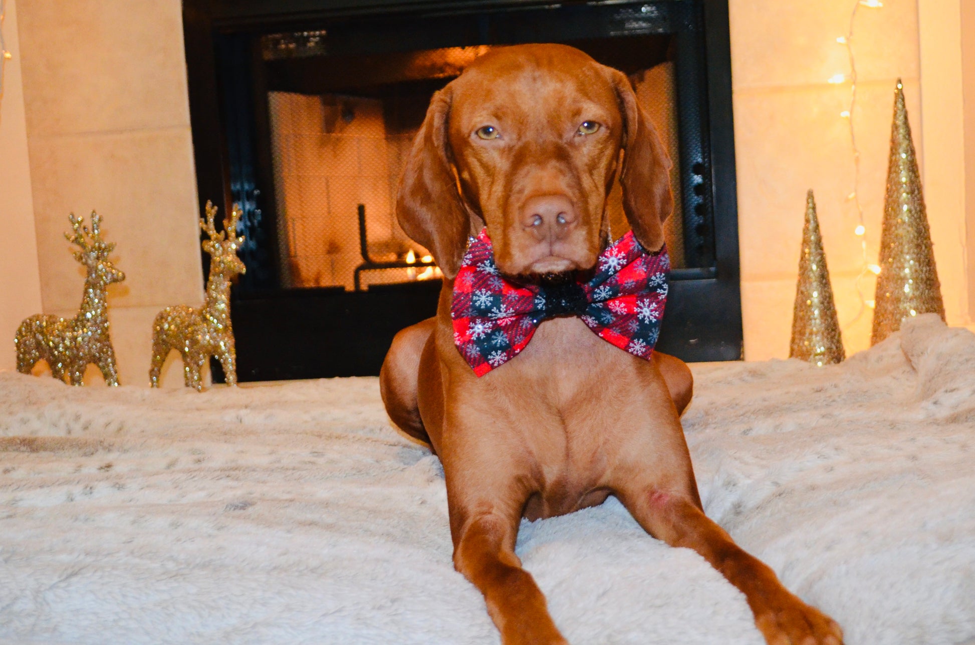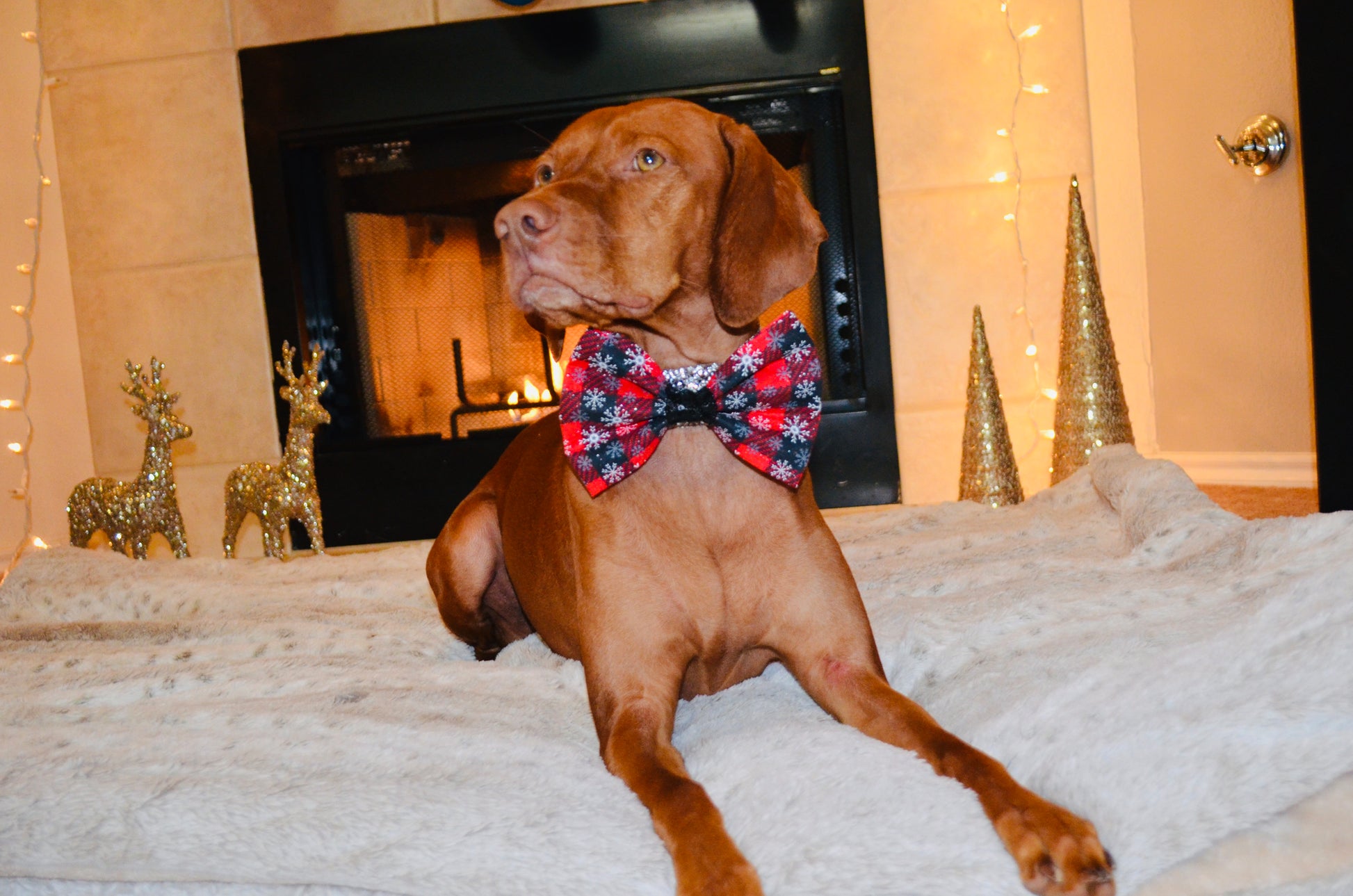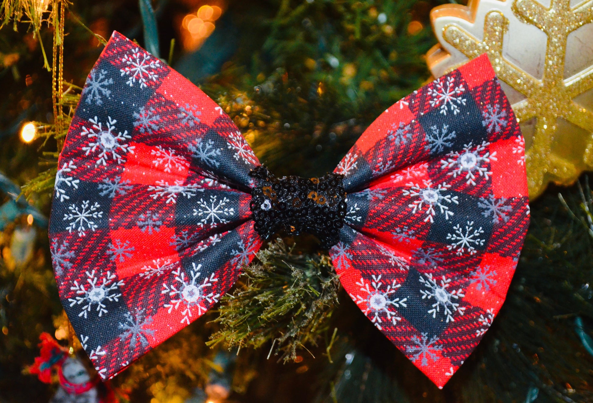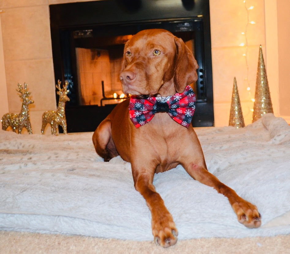 Red and black plaid snowflake print with black sequin center. Attaches to collar with 2 adjustable soft velcro straps to ensure the bow tie stays perfectly straight. Pairs perfectly with the red and black sequin bandanas.