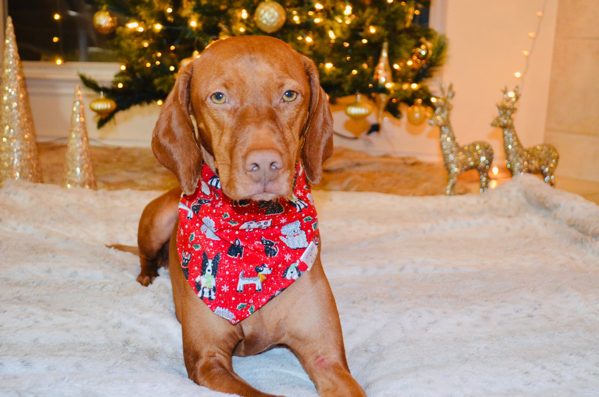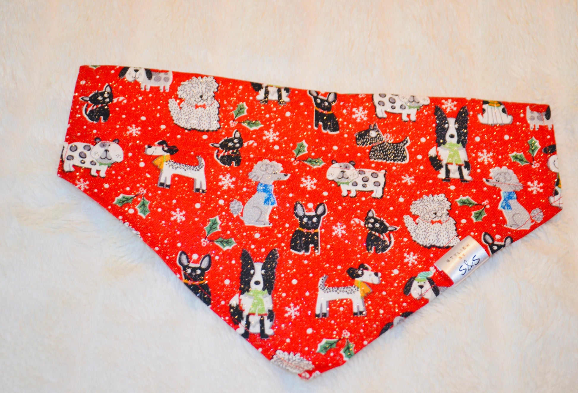 Red glittery bandana with an assortment of festive pups. Available in slide over the collar style in Extra Small, Small, Medium and Large.