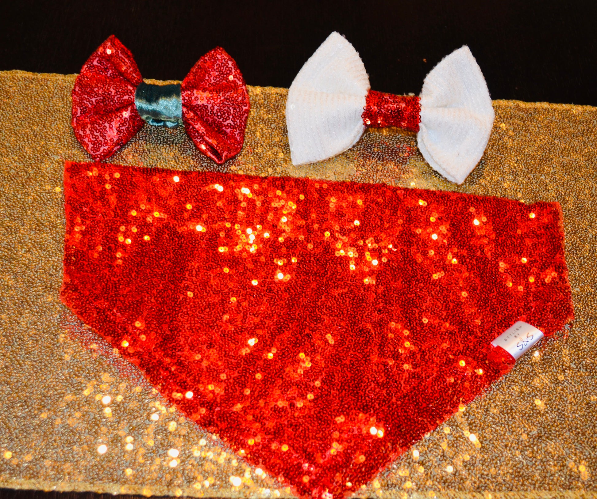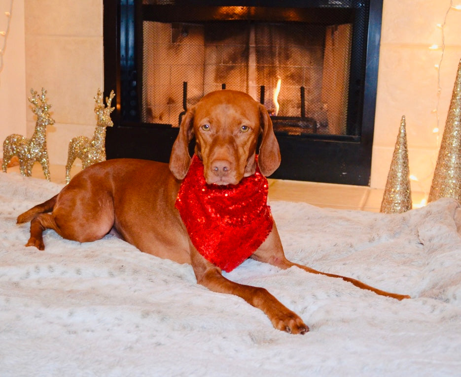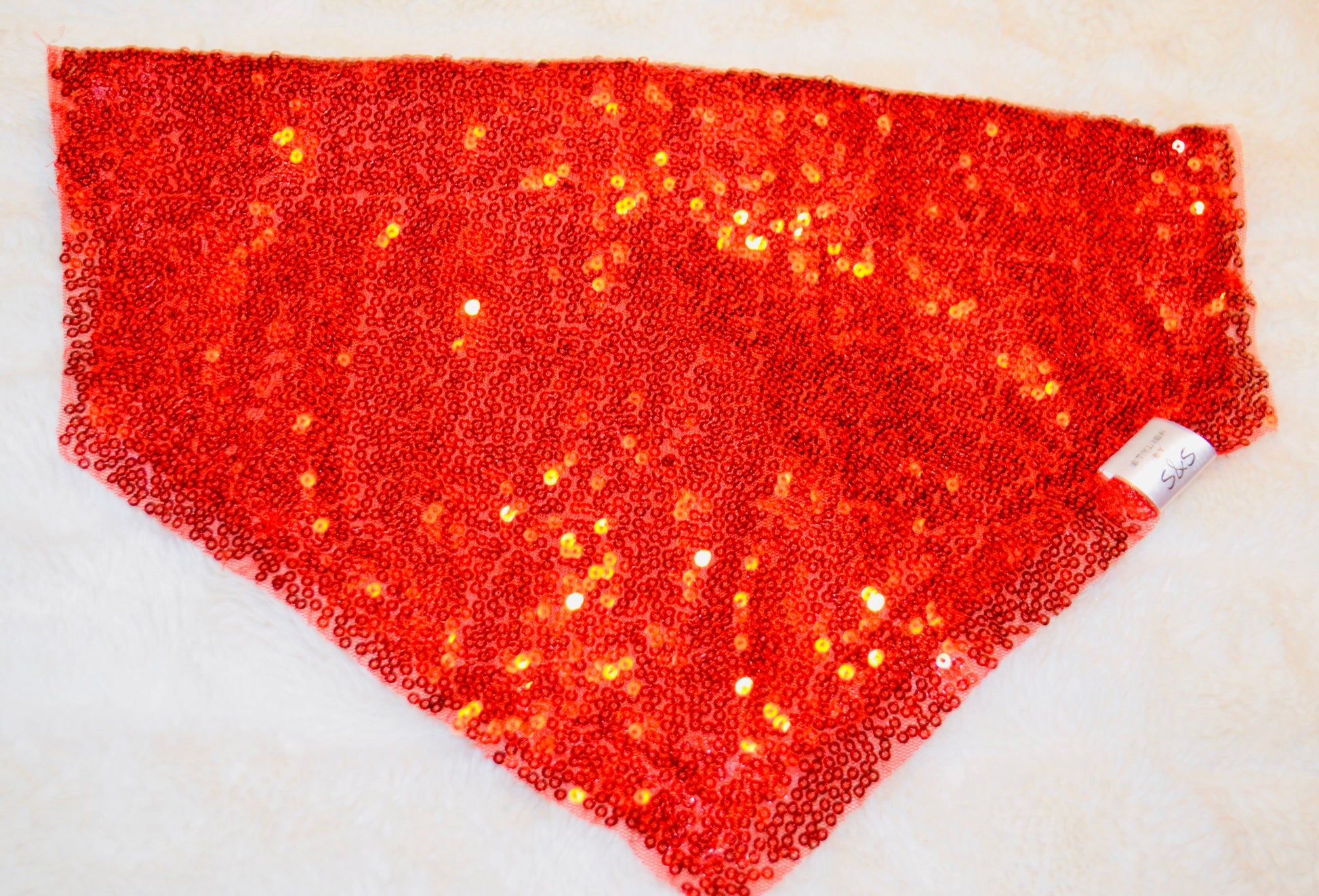 Stunning solid red sequin bandana. Lined with soft red satin for comfort. Available in slide over the collar style in Extra Small, Small, Medium and Large. Pairs perfectly with red sequin bow tie styles.
