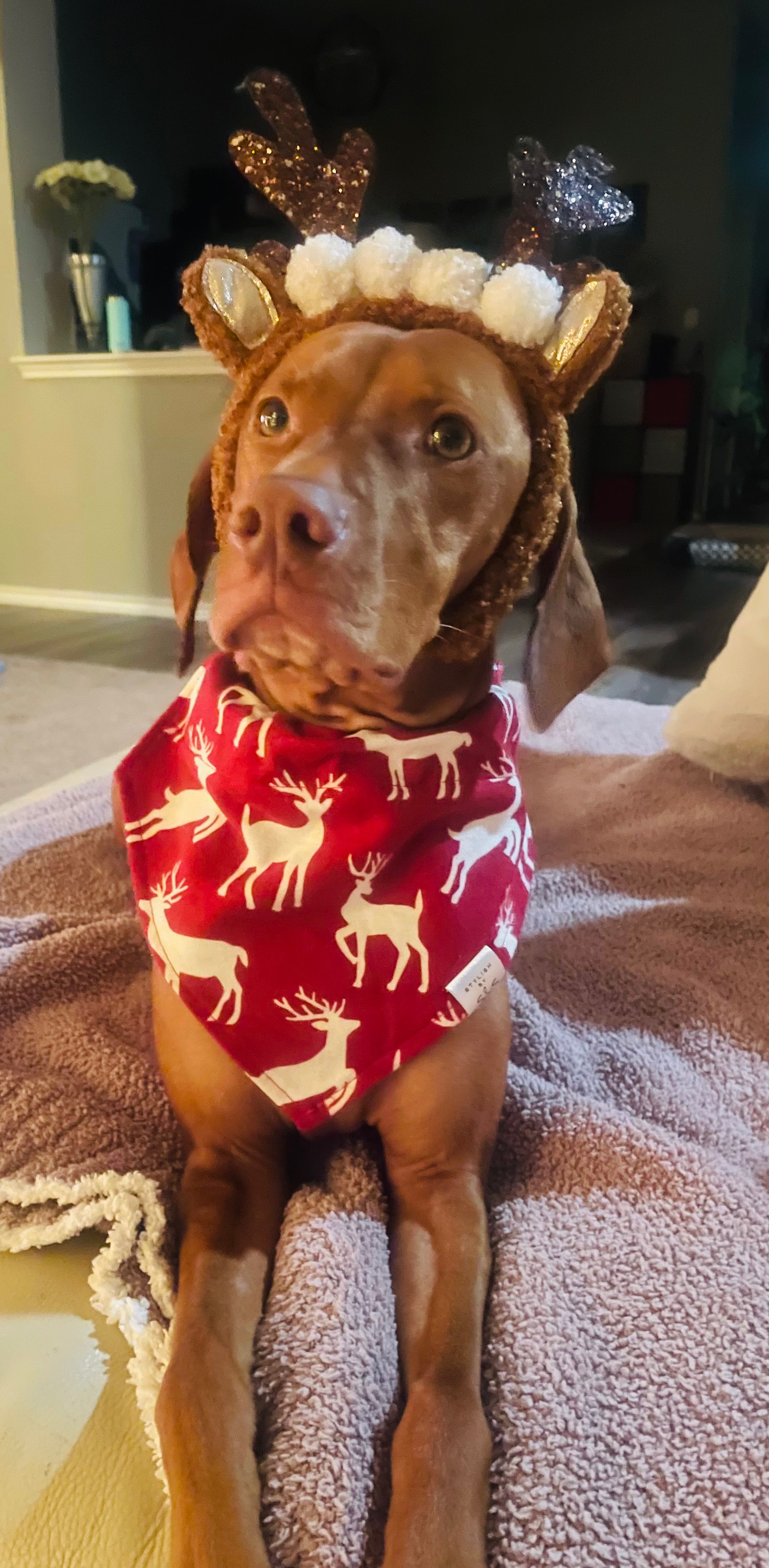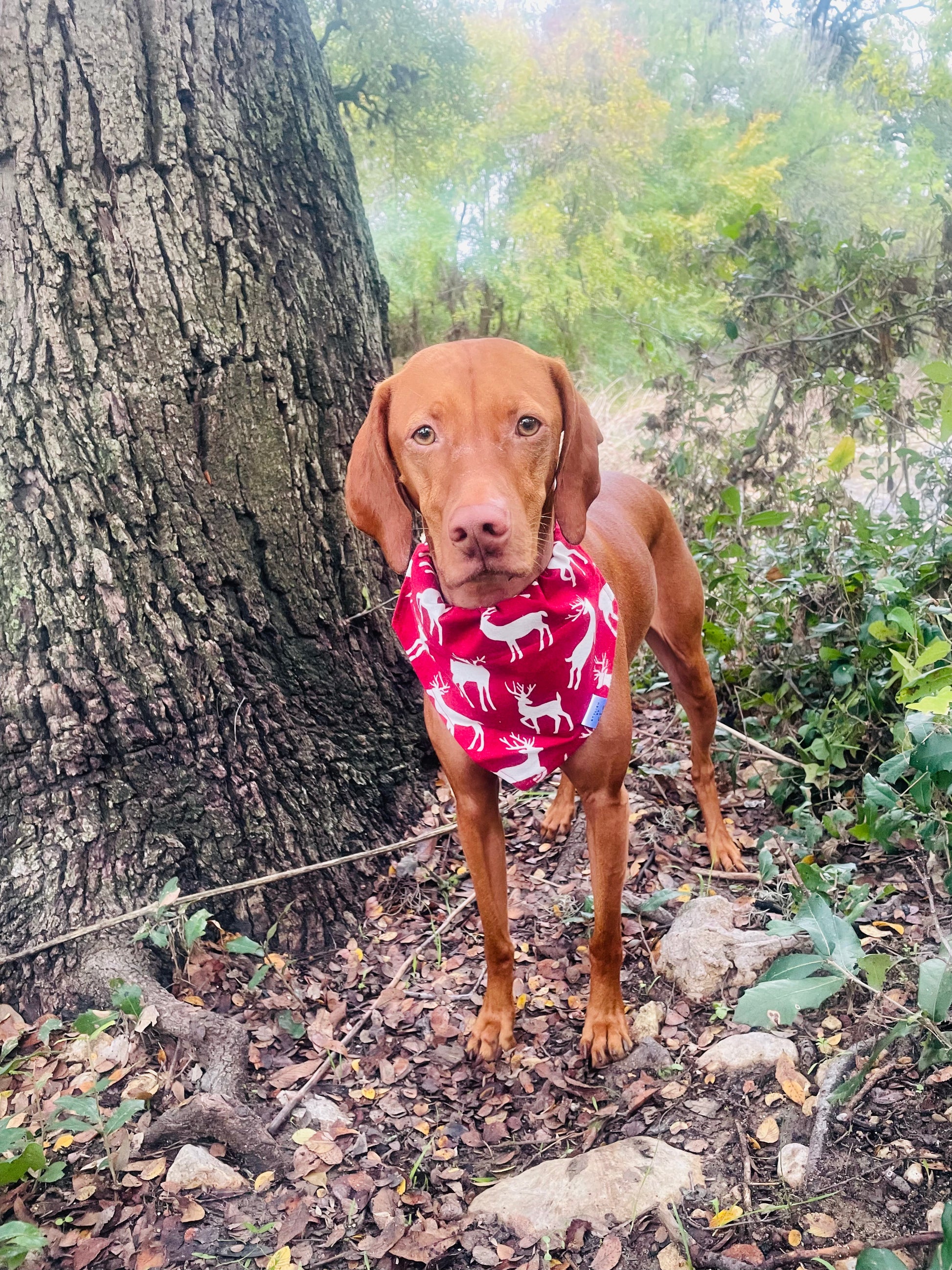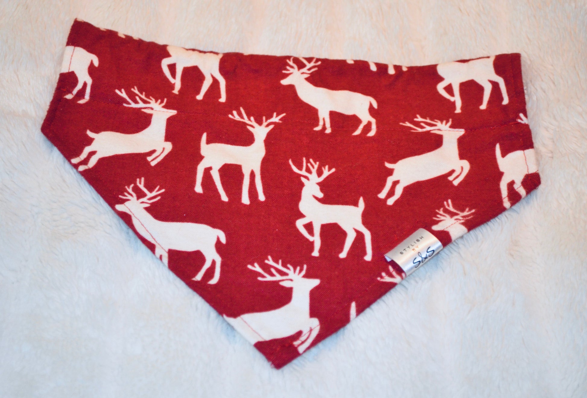 This adorable soft red flannel bandana features a white reindeer print. Available in slide over the collar style in Extra Small, Small, Medium and Large.