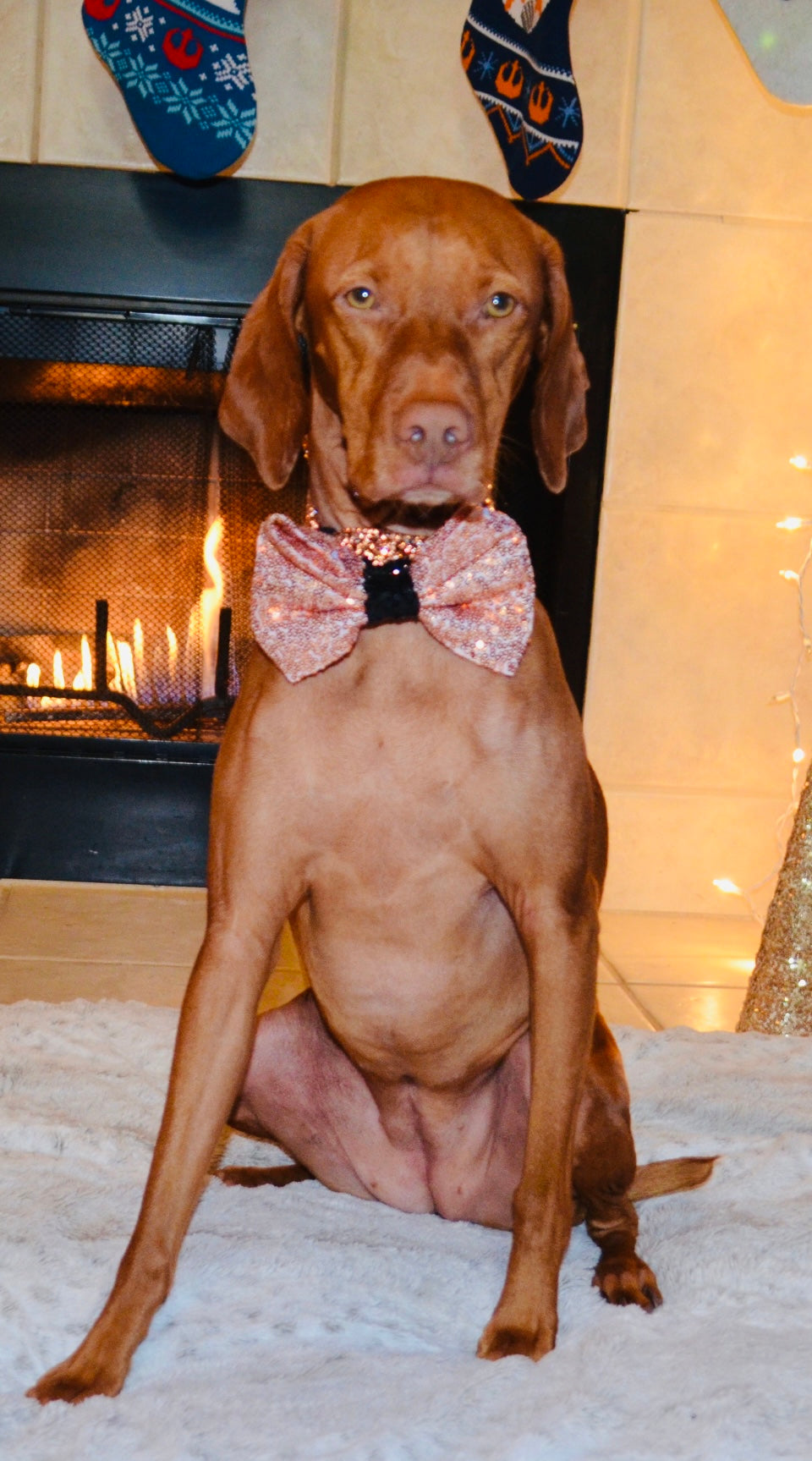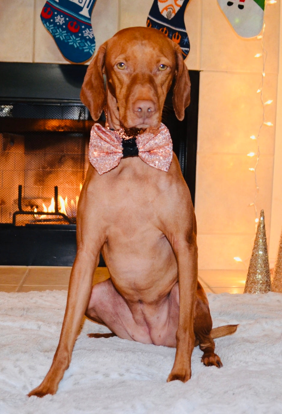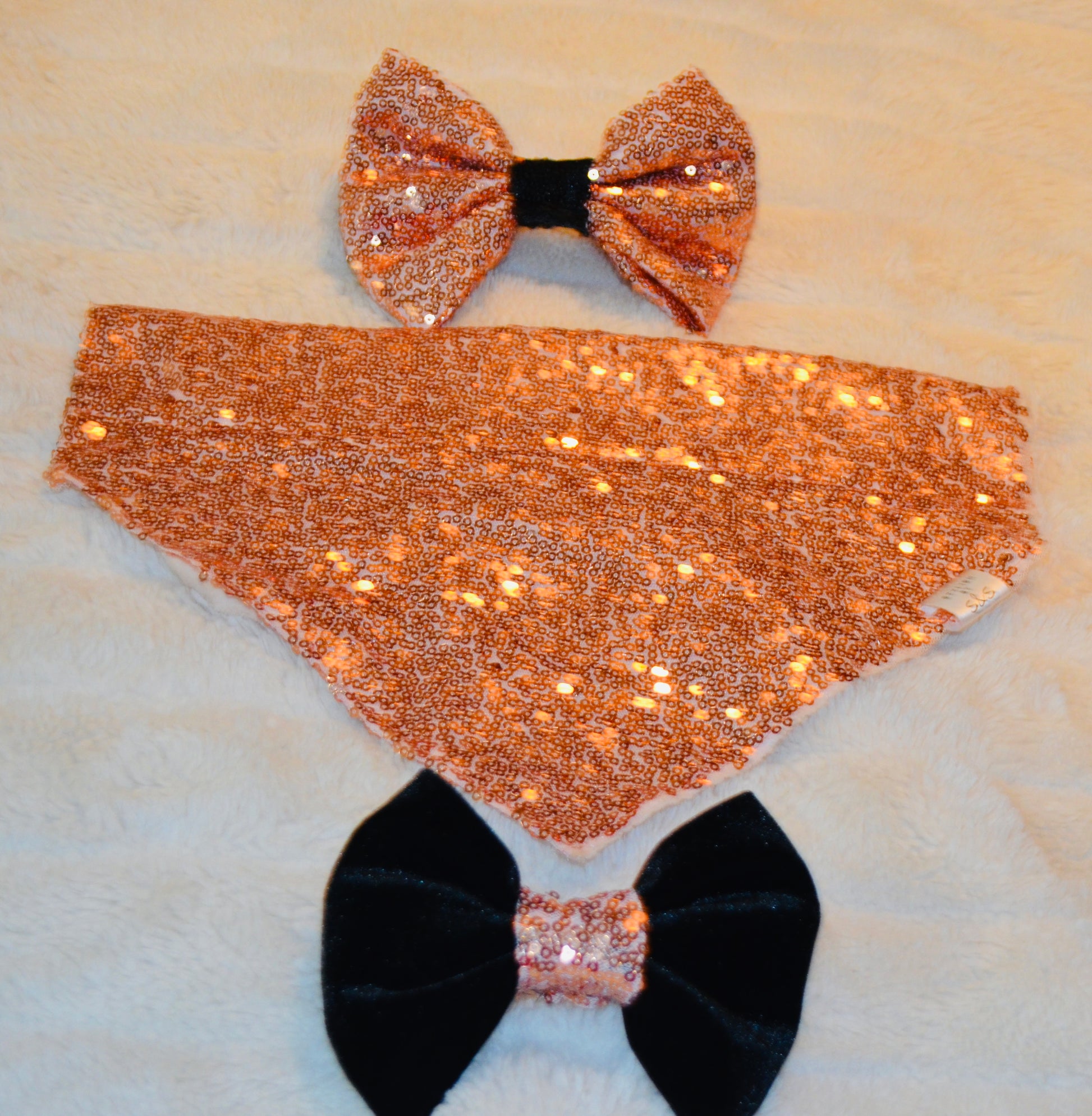 Rose gold sequin bow tie with black sequin center. Attaches to collar with 2 adjustable soft velcro straps to ensure the bow tie stays perfectly straight. Pairs perfectly with the rose gold and black sequin bandanas.