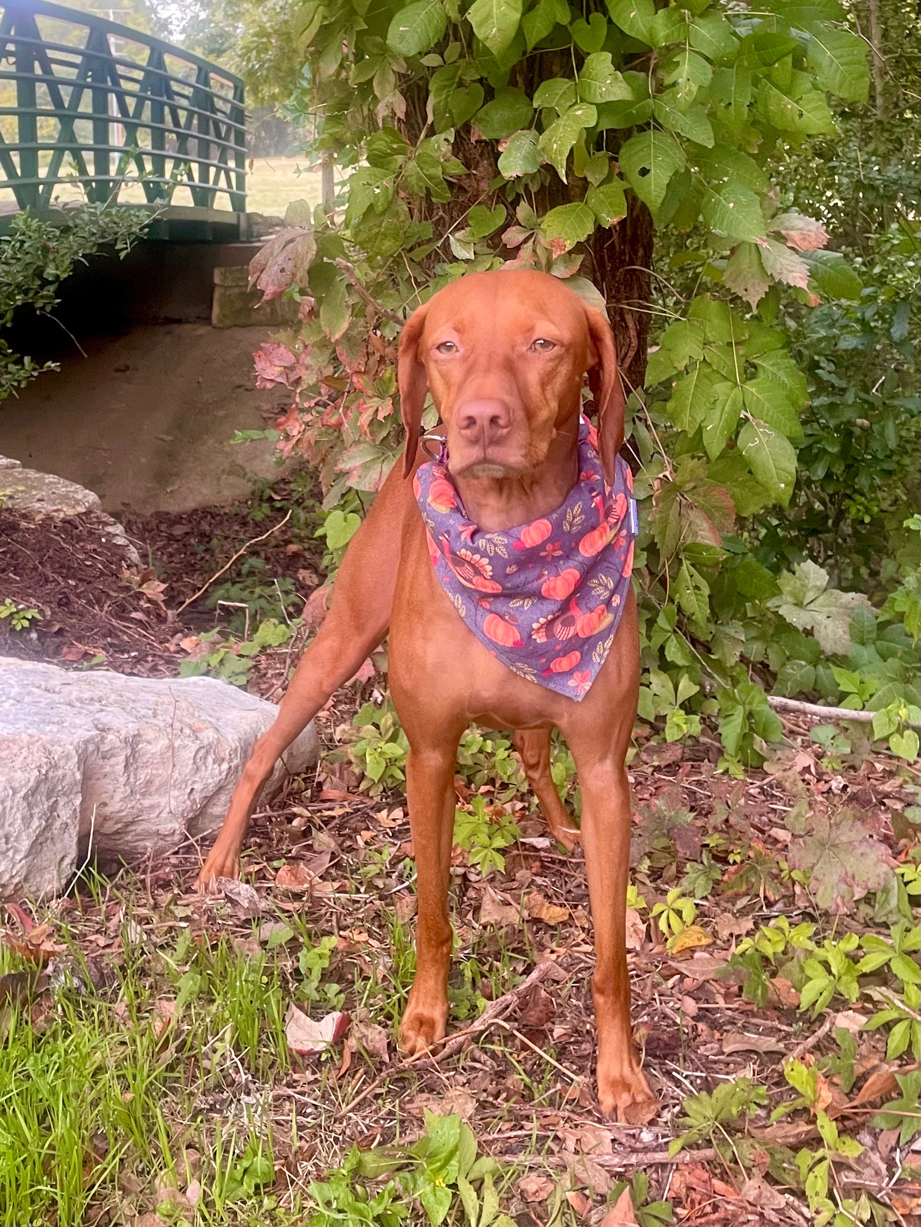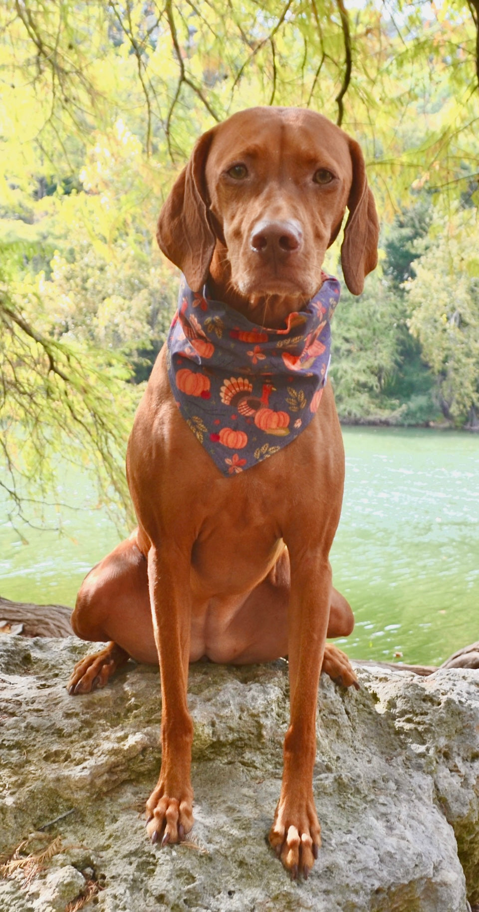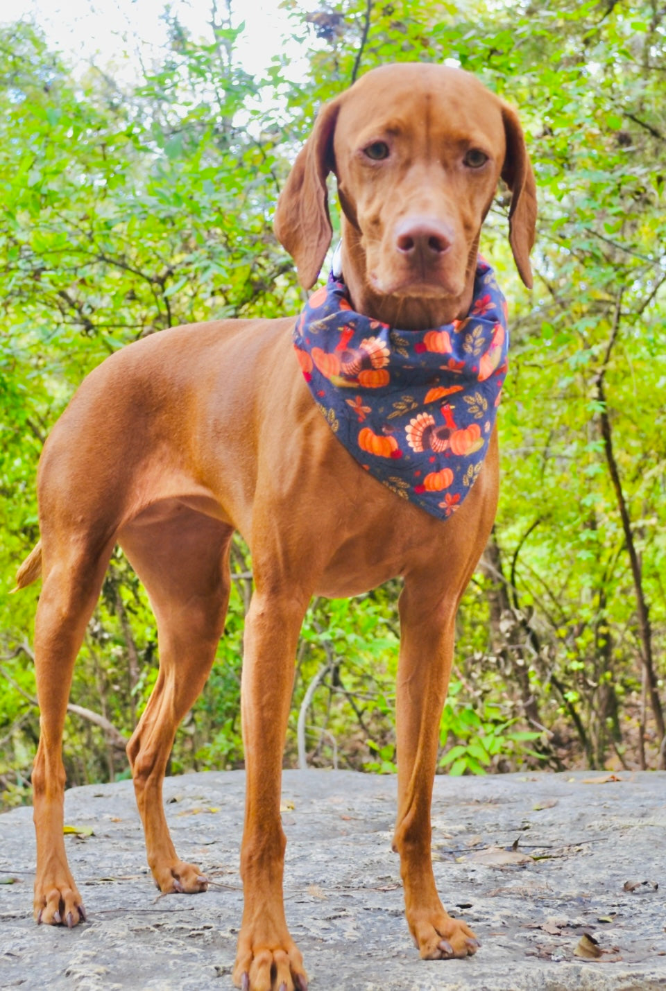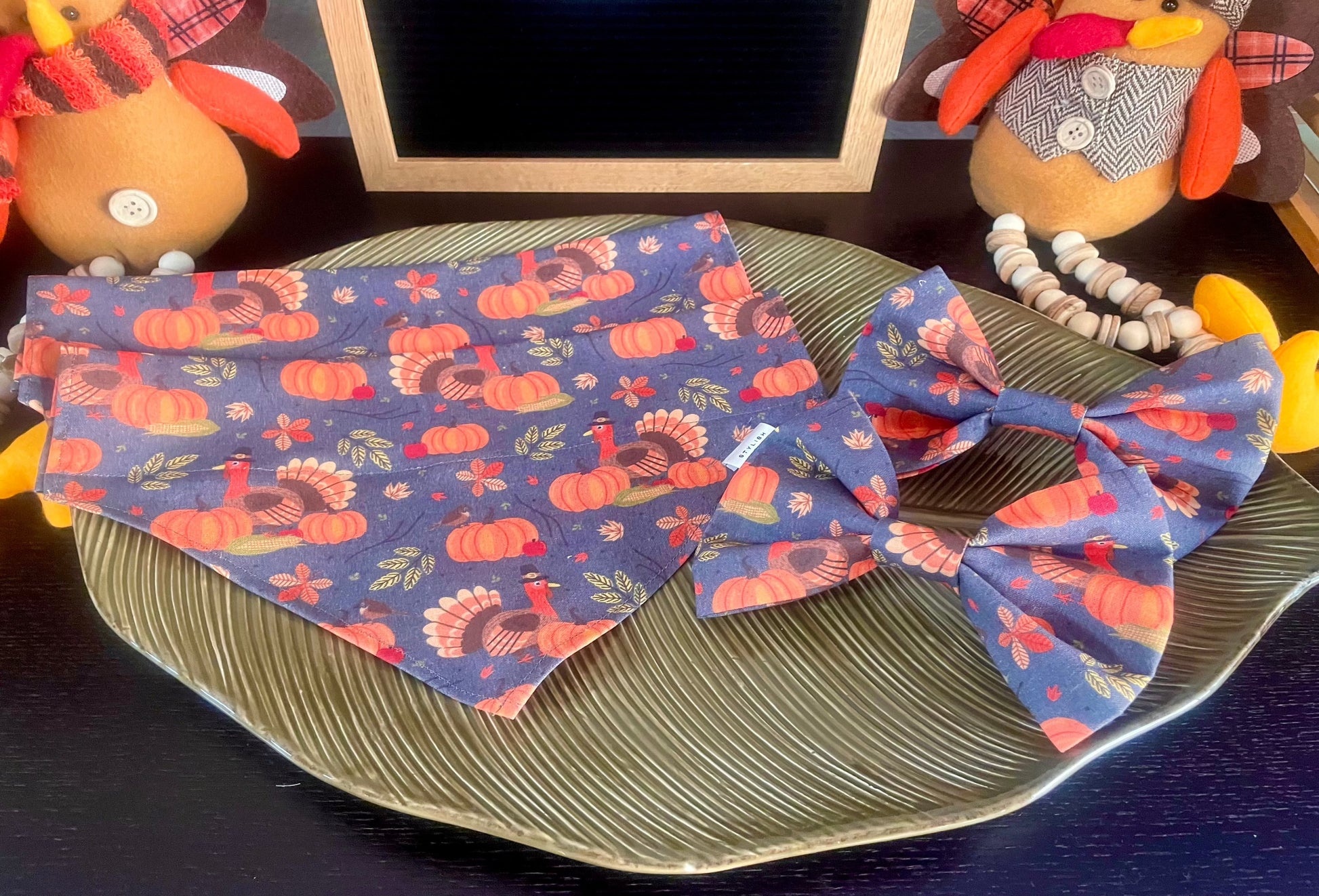 This grey cotton Turkey and Pumpkin print bandana will have your pets looking so stylish for Thanksgiving. Available in slide over the collar, tie around styles and matching bow tie. Slide over style will fit collar widths of up to 2 inches.