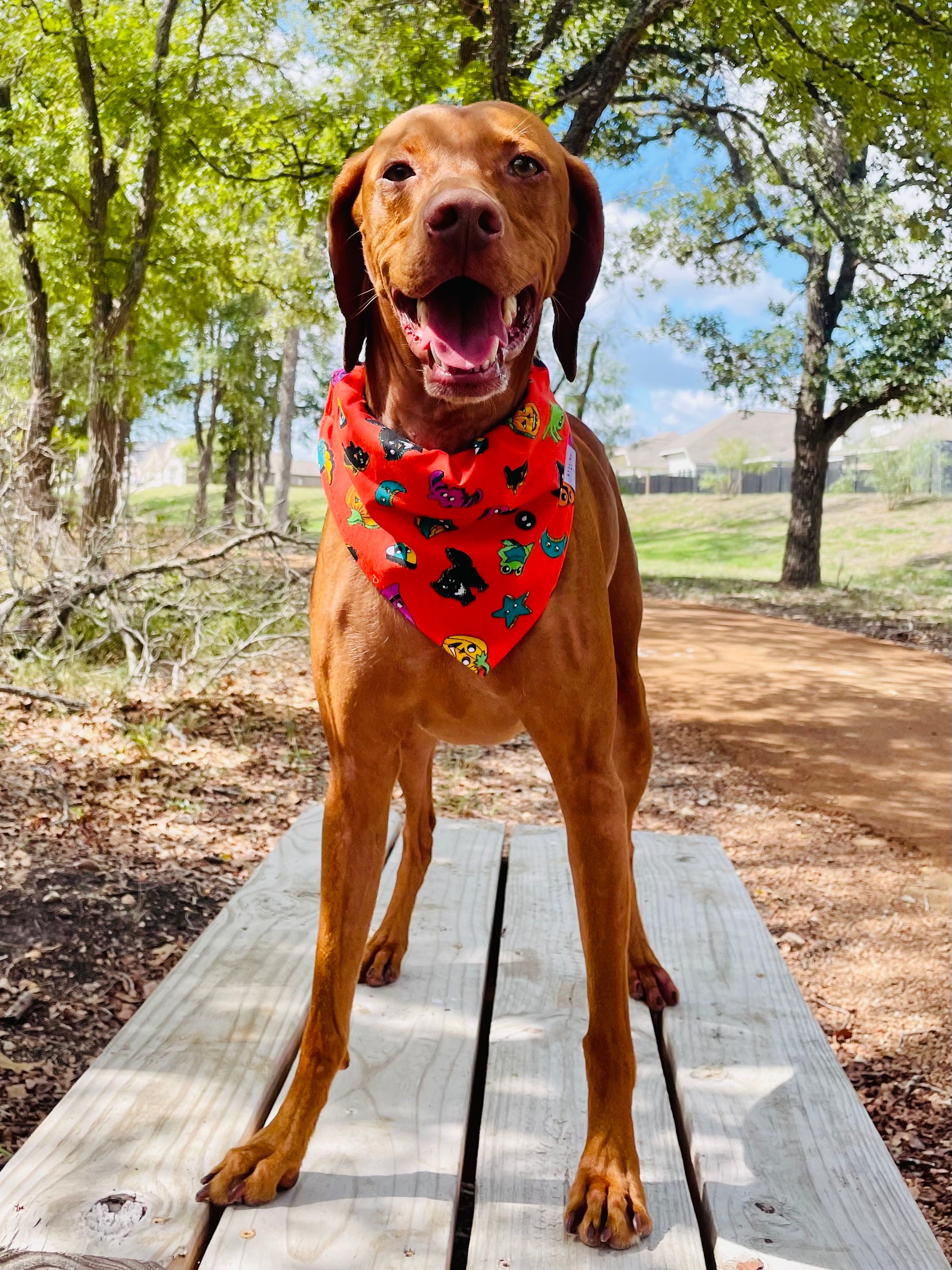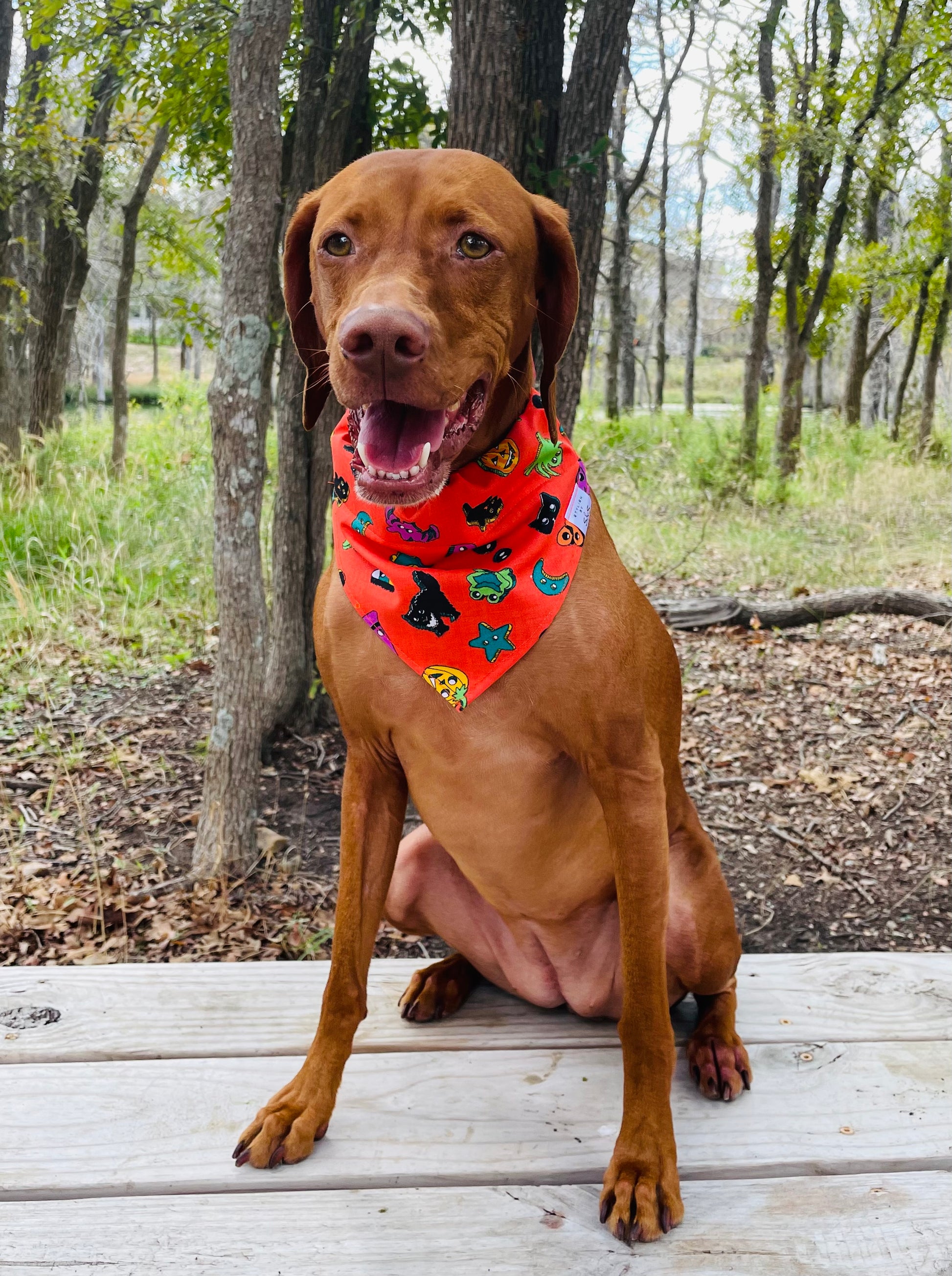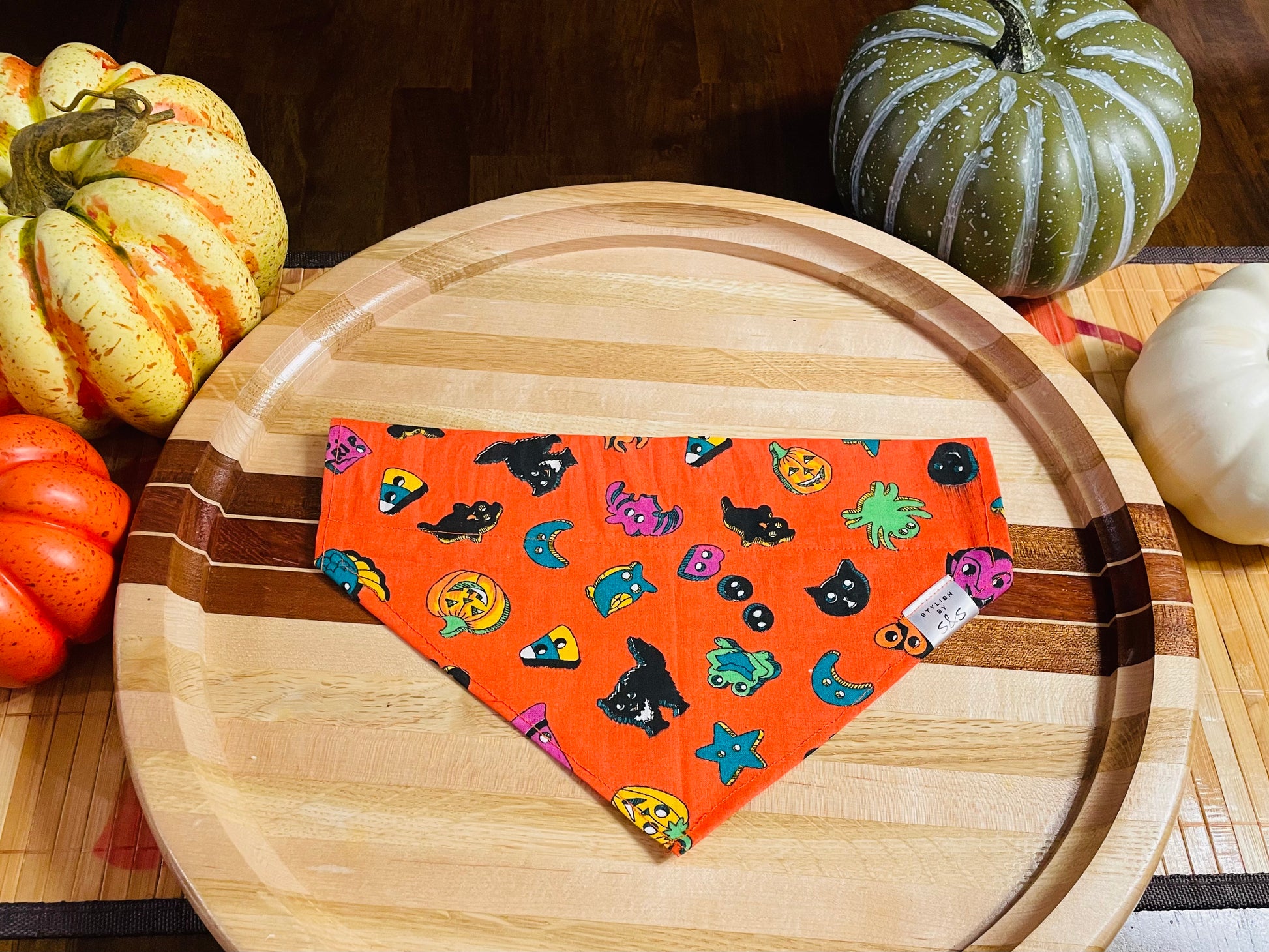 This one of a kind vintage print has ghosts, black cats, pumpkins, etc. Bandana sold in slide over the collar and tie around styles.