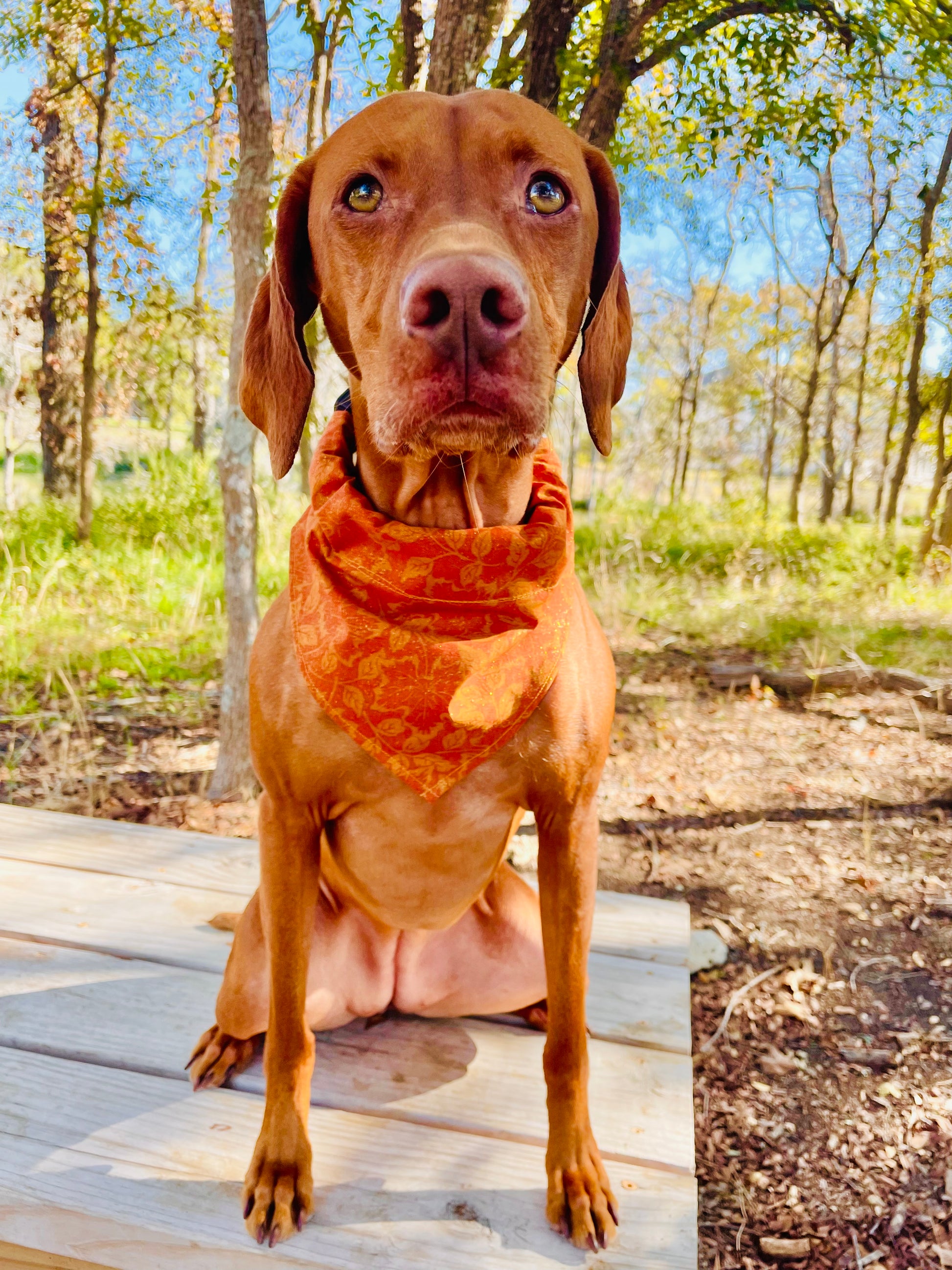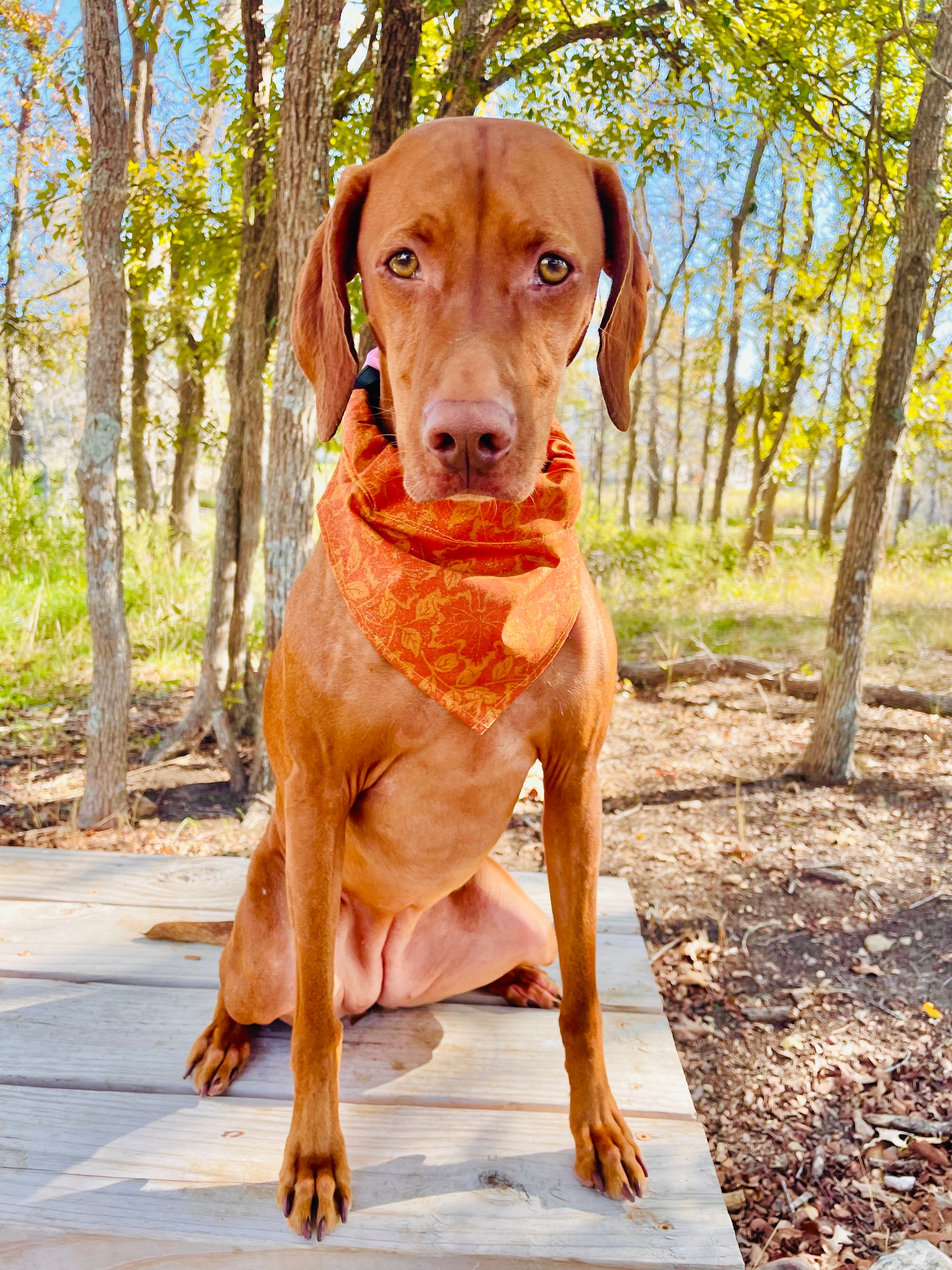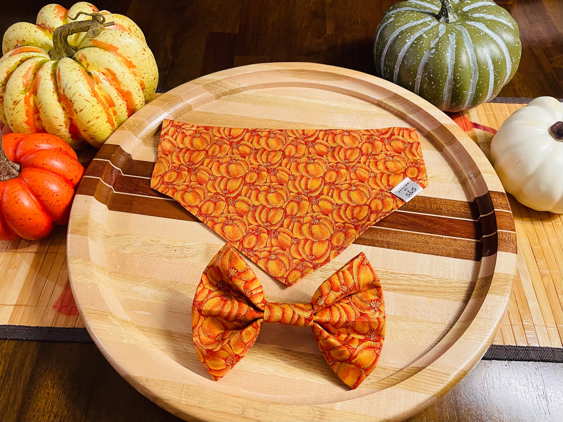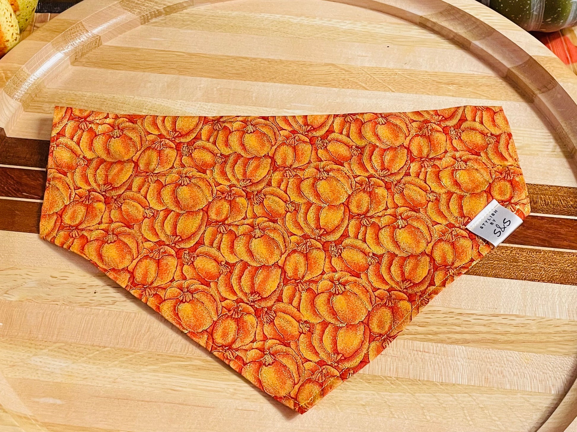 This one of a kind vintage print features shimmering Fall leaves. Matching bow tie available. Bandana sold in slide over the collar and tie around styles.