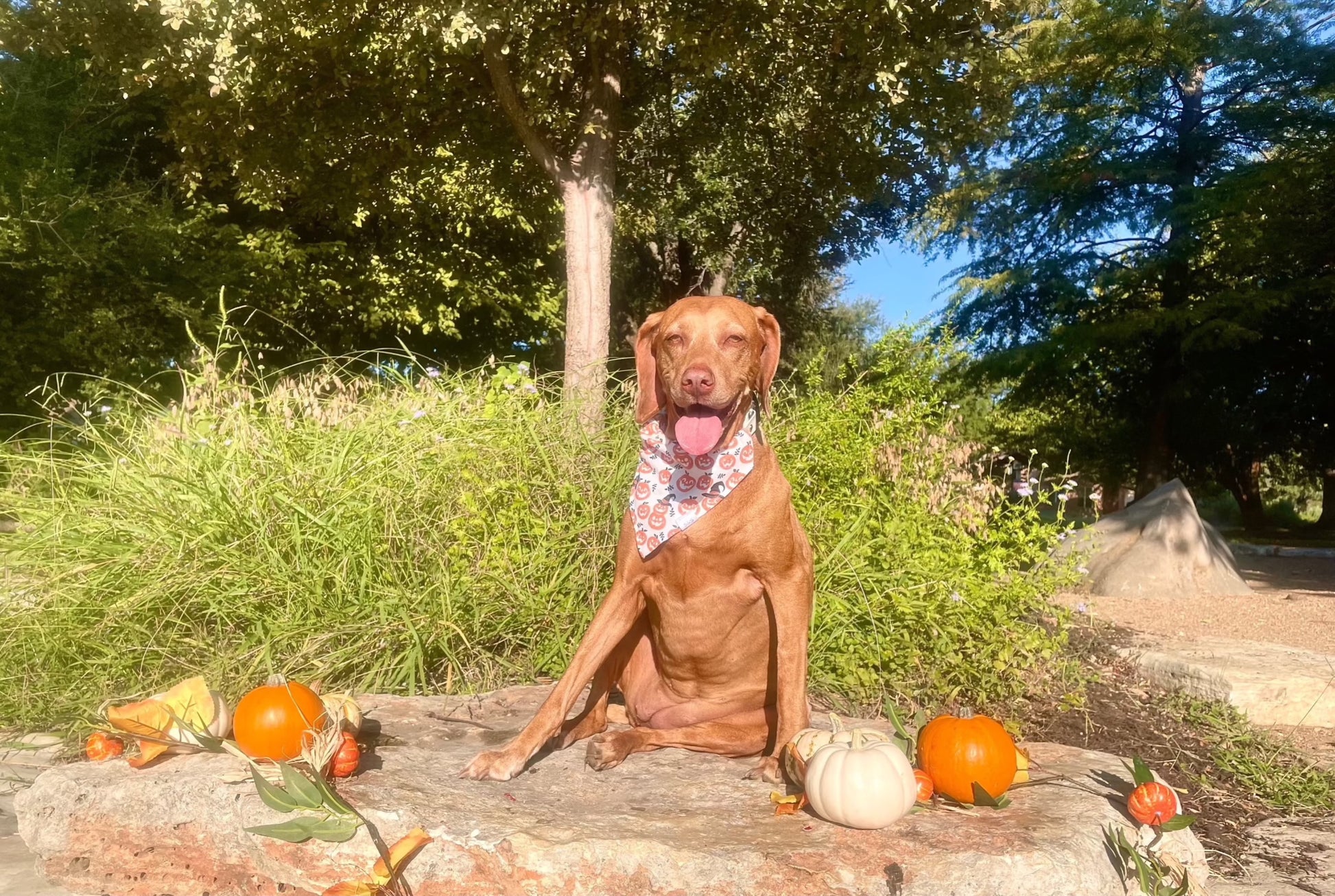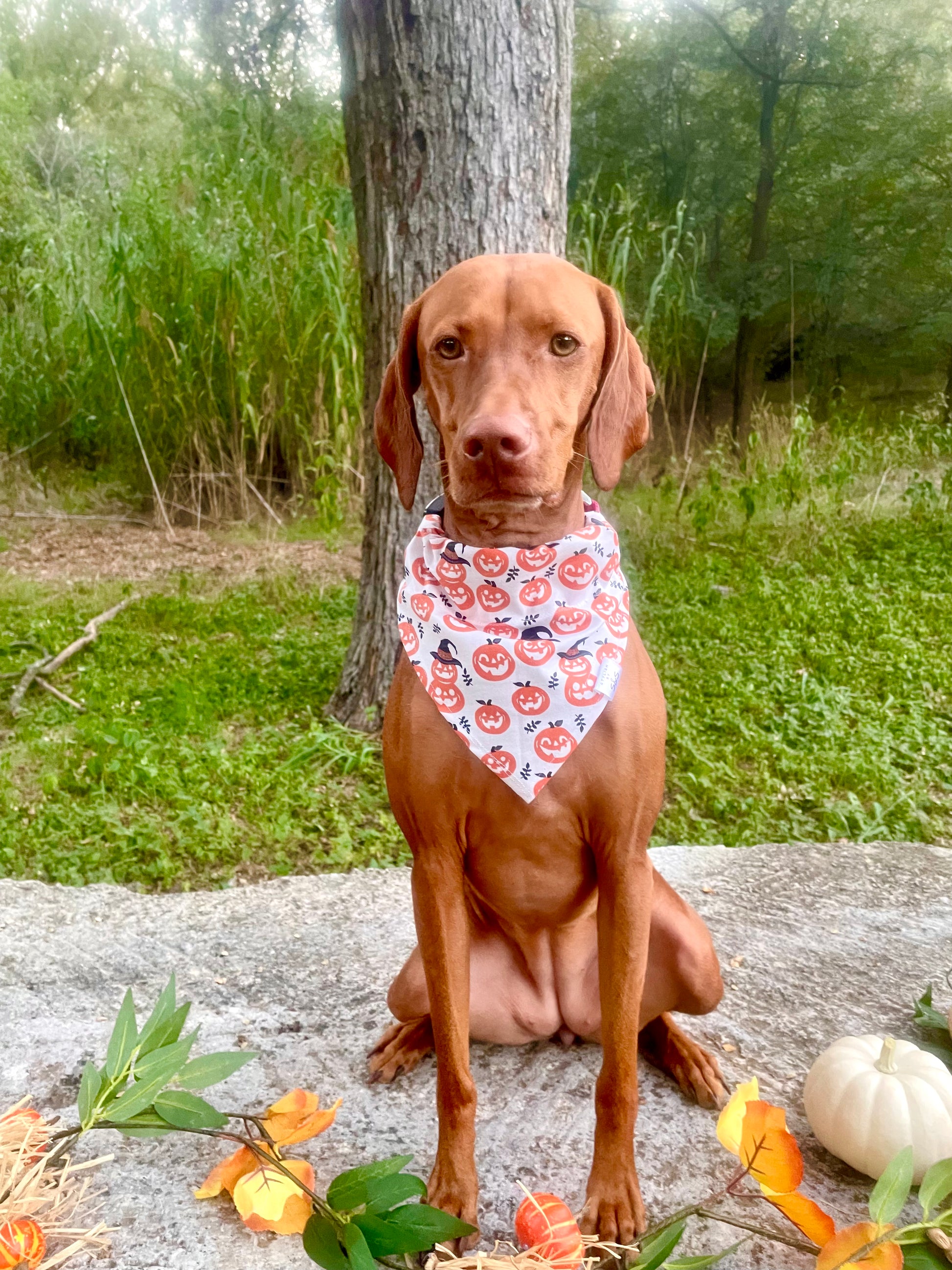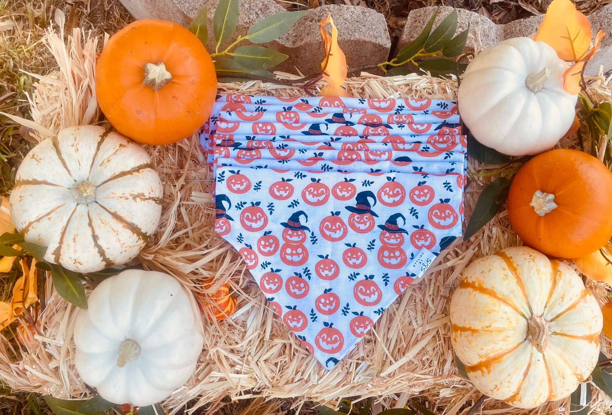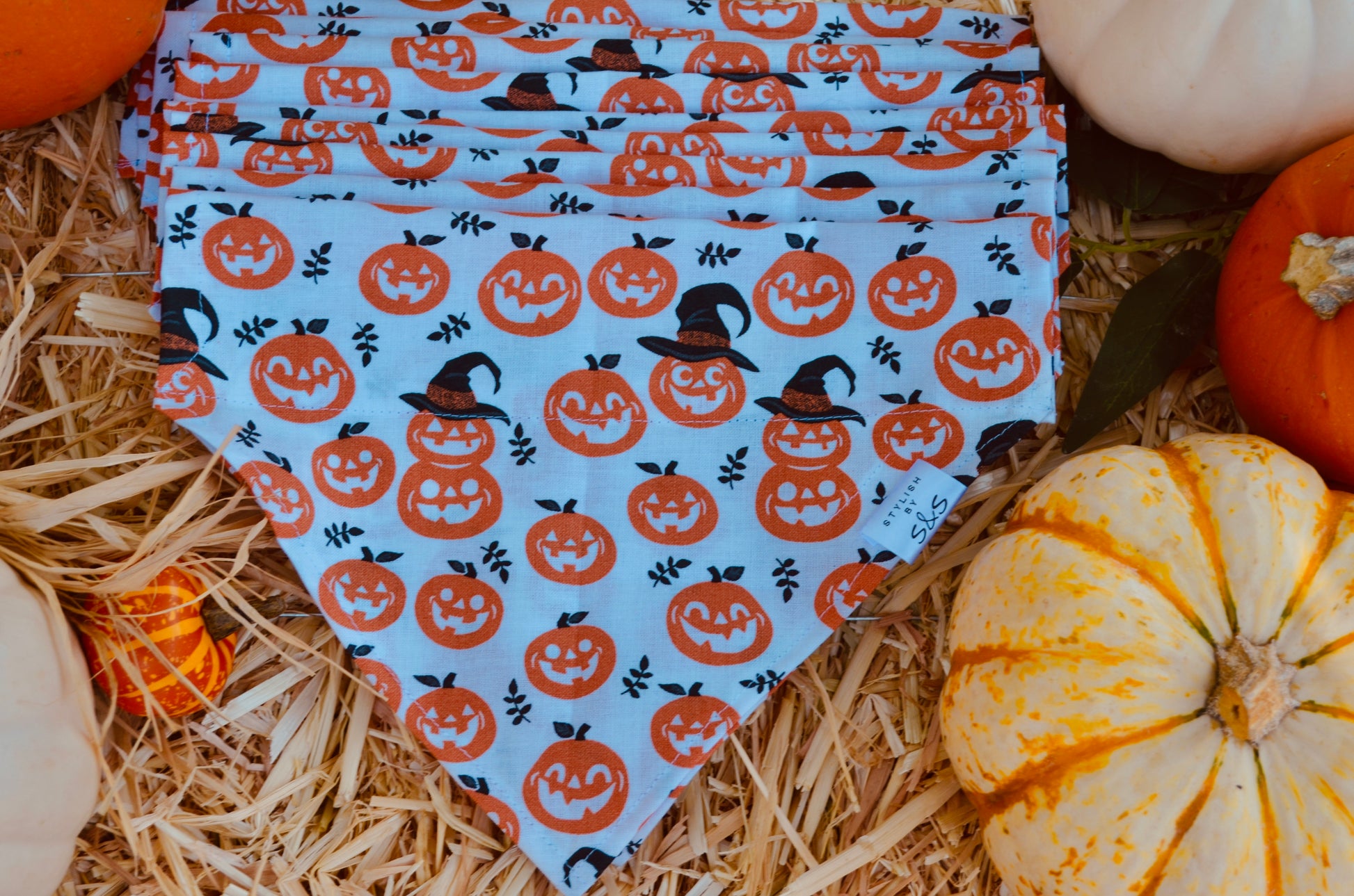 Sadie and Ellie are super stylish in this fresh white Halloween pumpkin print bandana. Models wearing size Medium. Available in Slide On, Tie Around, Custom Size Tie Around (Pigs, large animals)