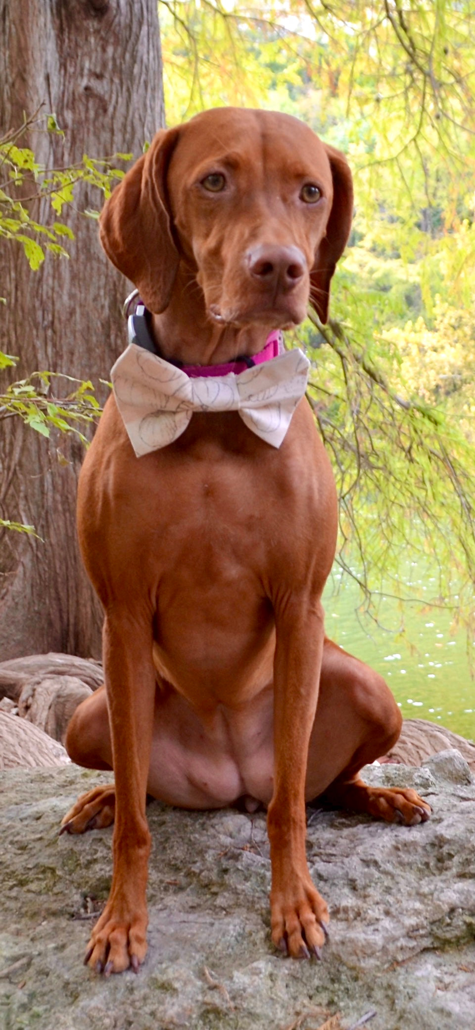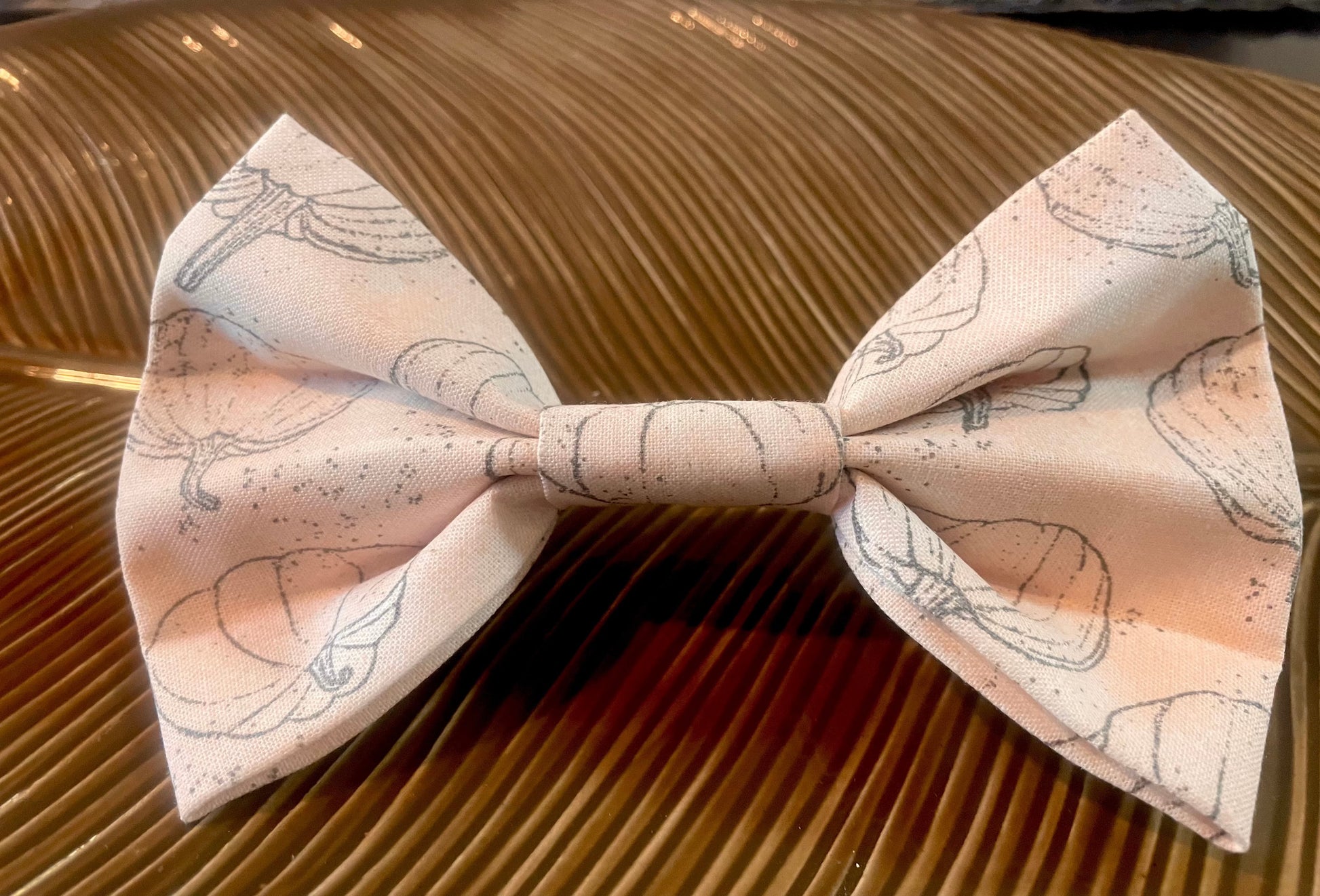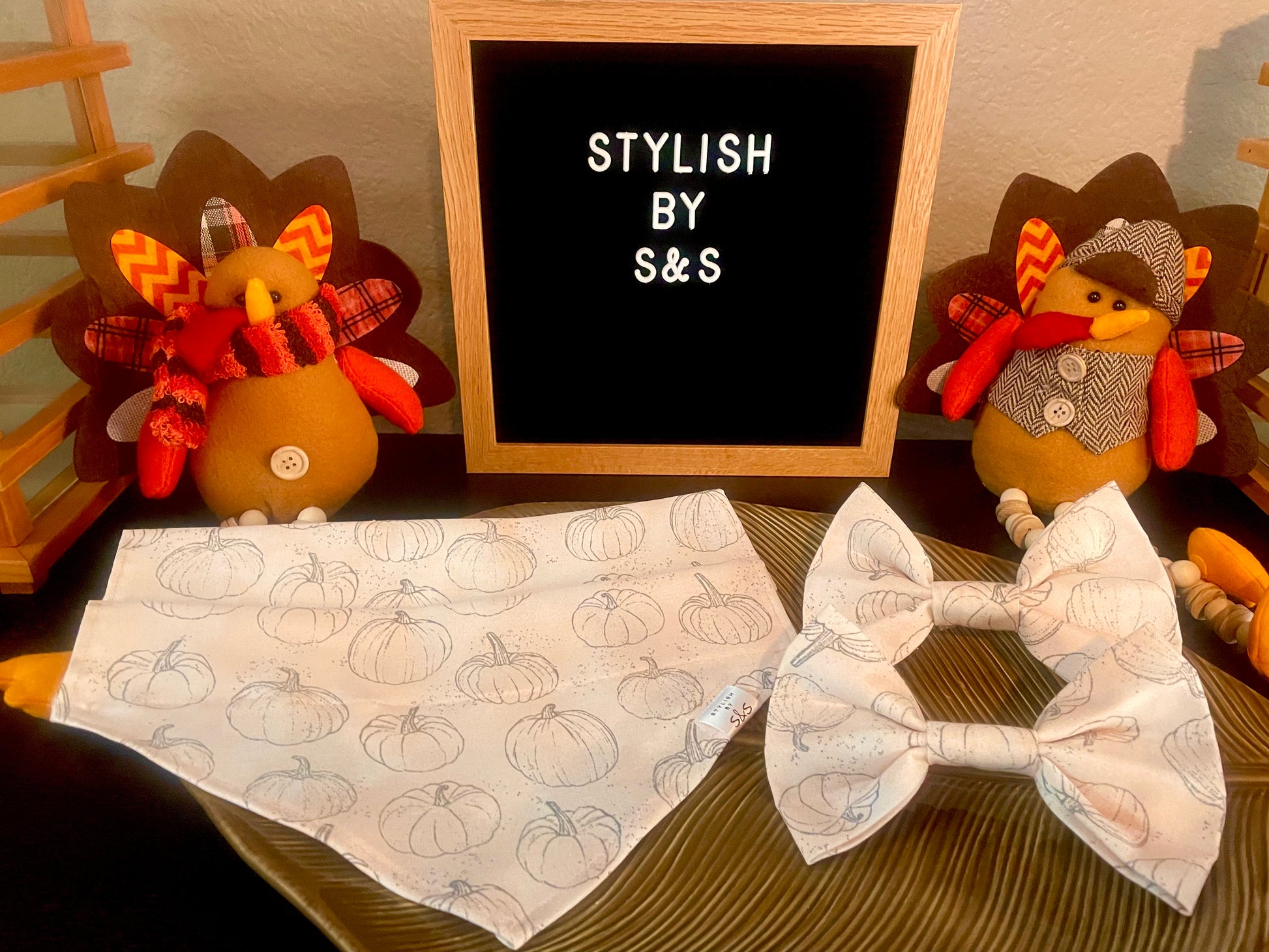 White cotton bow tie with dark grey stenciled pumpkins. Matching bandana available. Bow ties available in XS, S, M, L and XL.